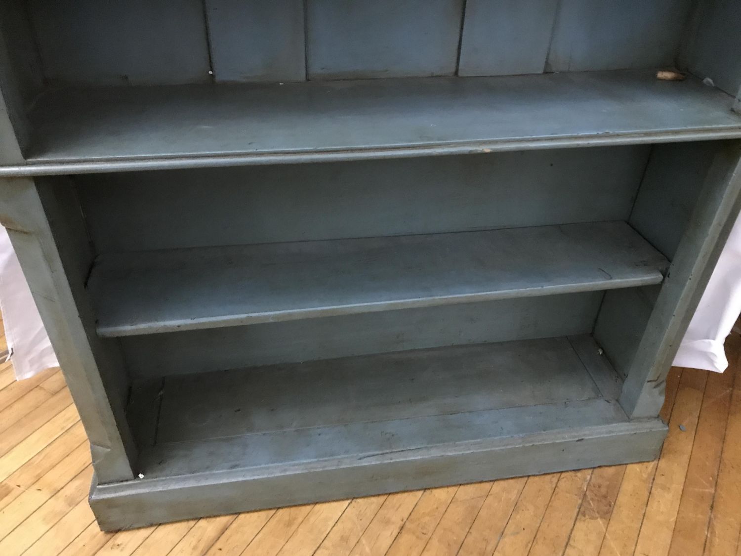 Lot 113: Primitive Blue 6tier Shelf Two pieces held by wooden