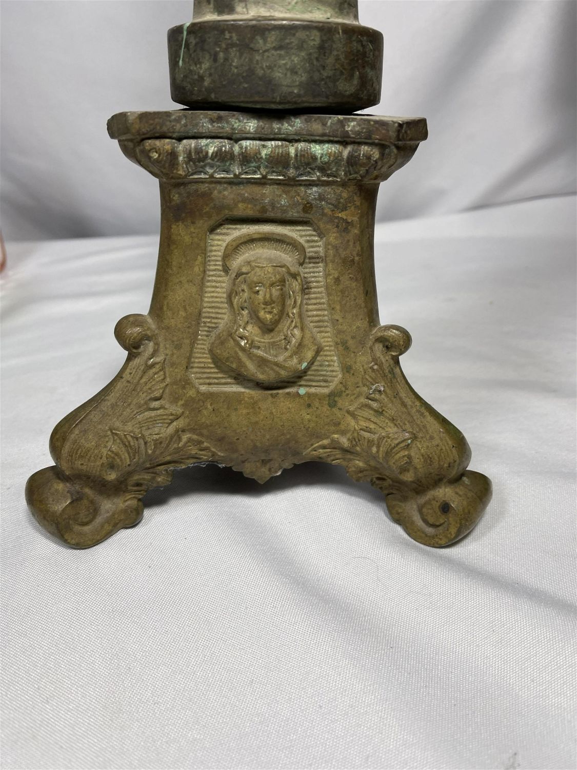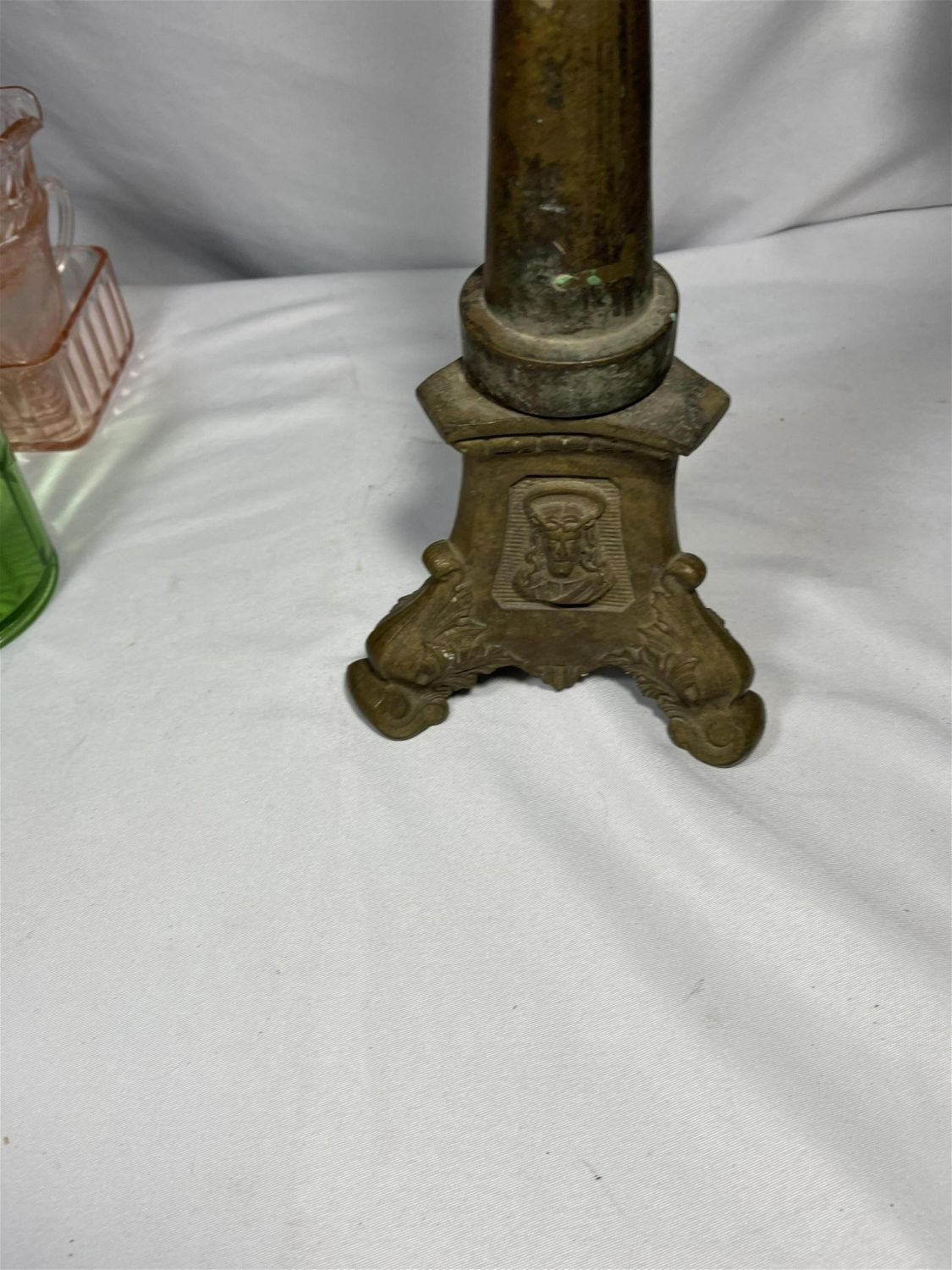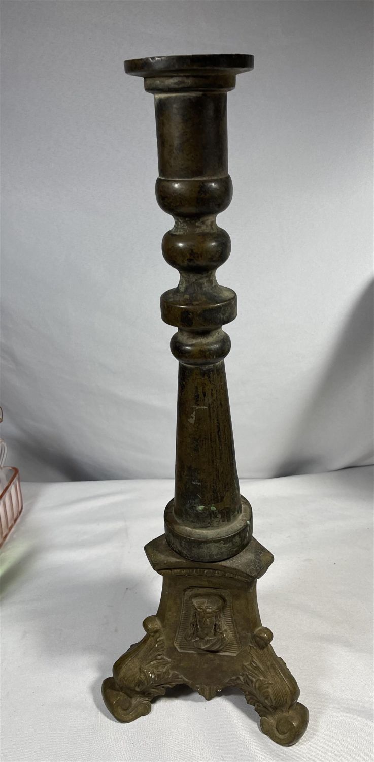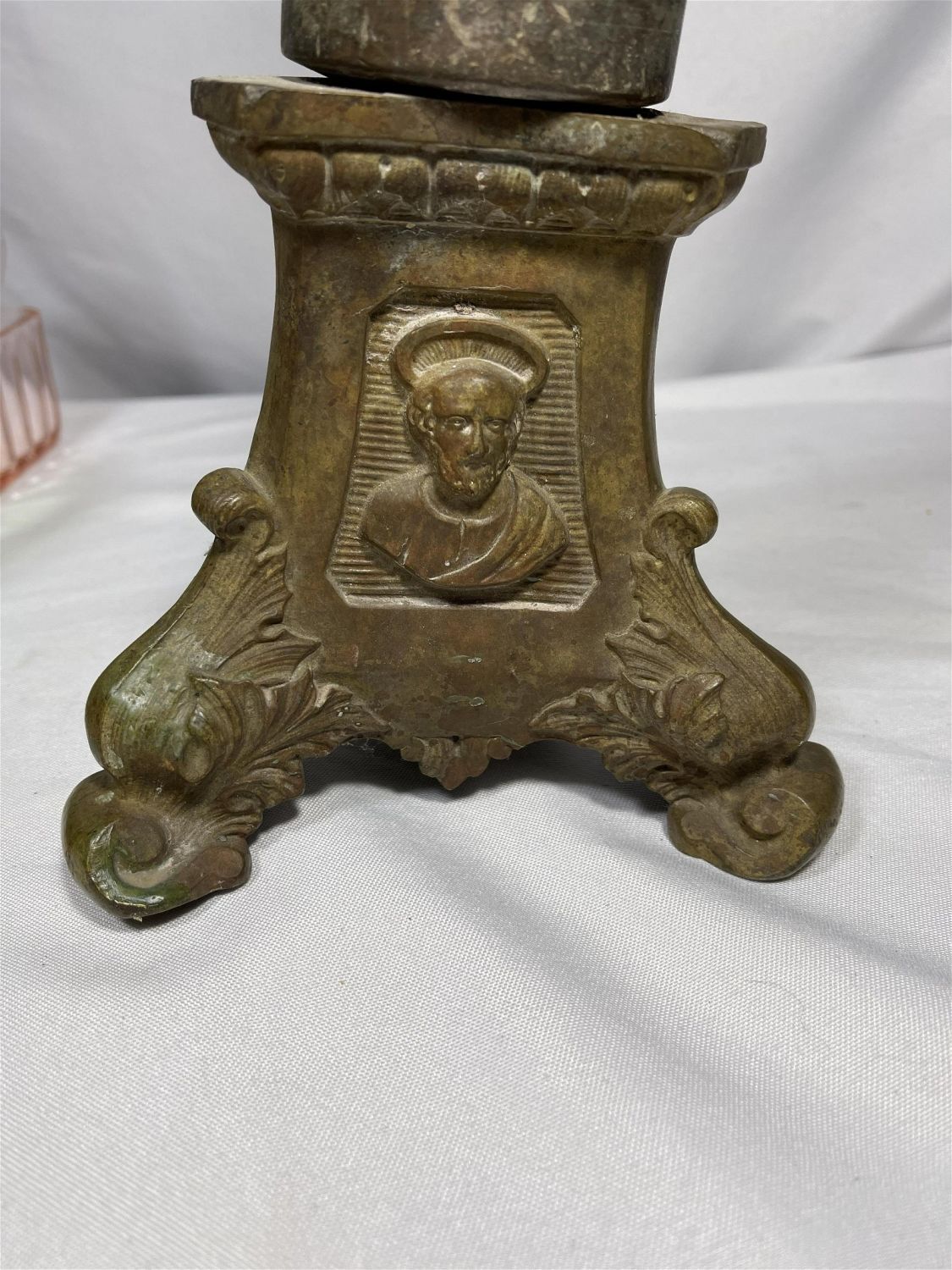 Lot 148: Vintage Roman Catholic bronze candlestick. This piece measures 18 1/2 inches tall width of the legs