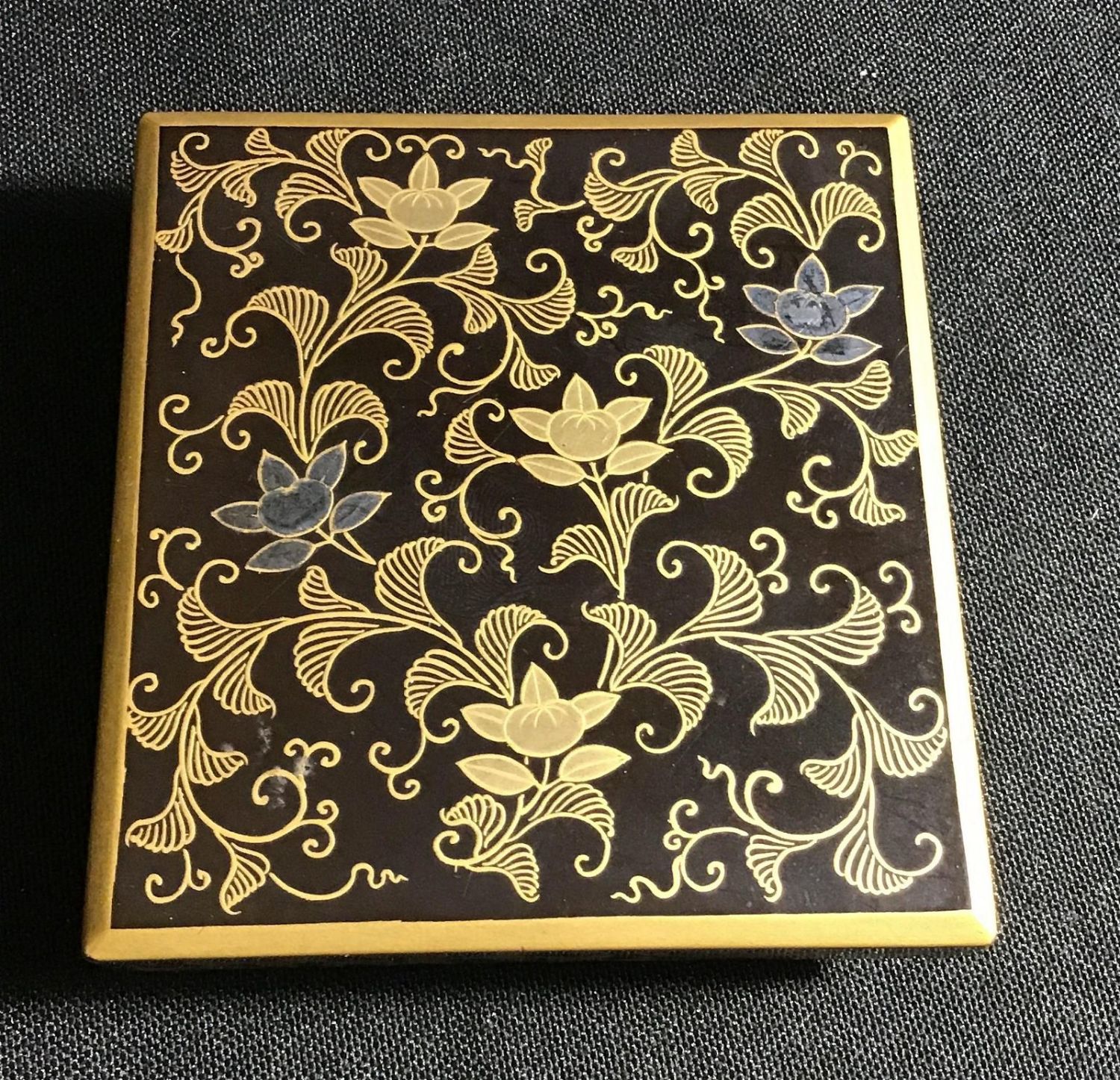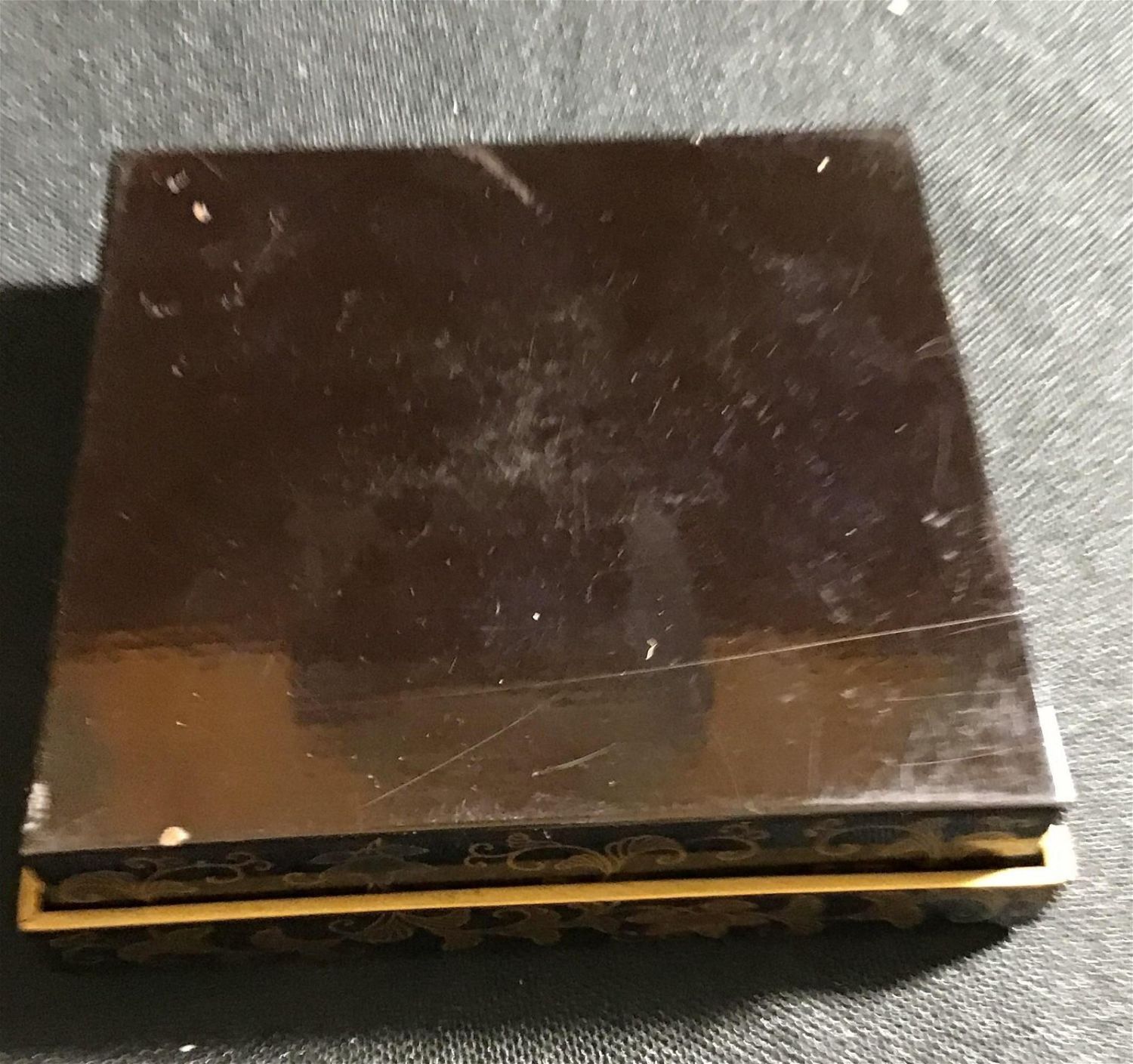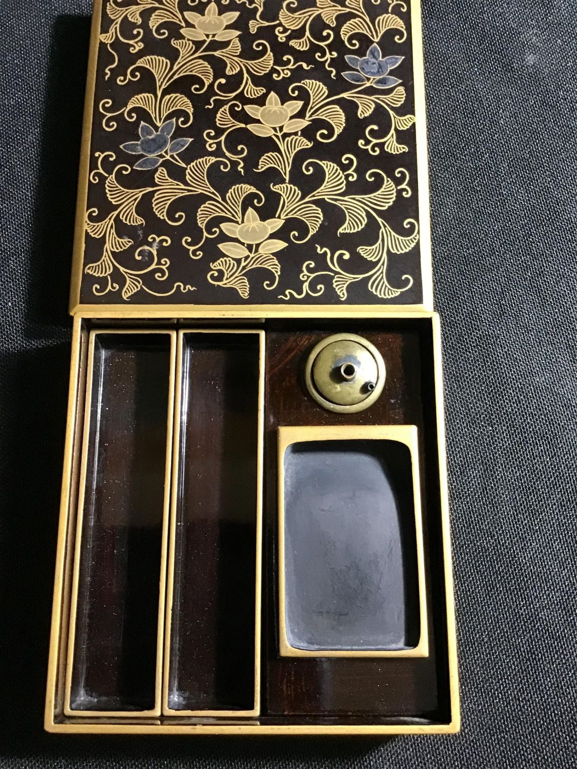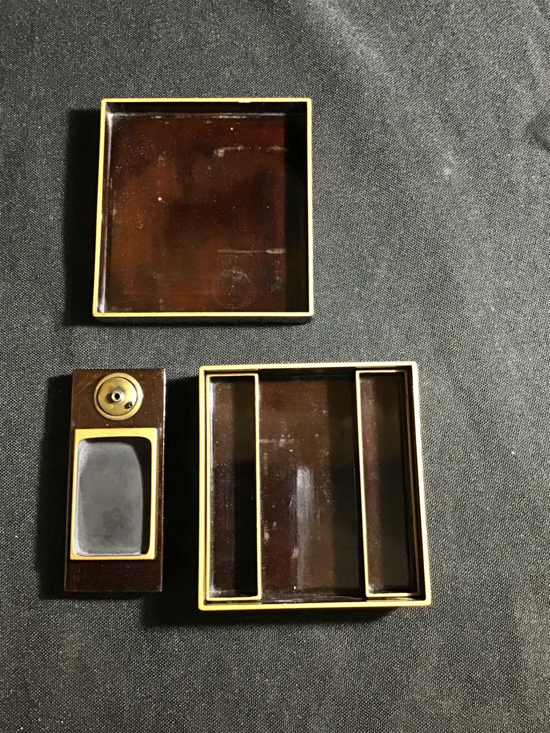Lot 8: Vintage lava inlay Japanese writing desk. Ink, inkwell & brush boxes 3" x 3" squared