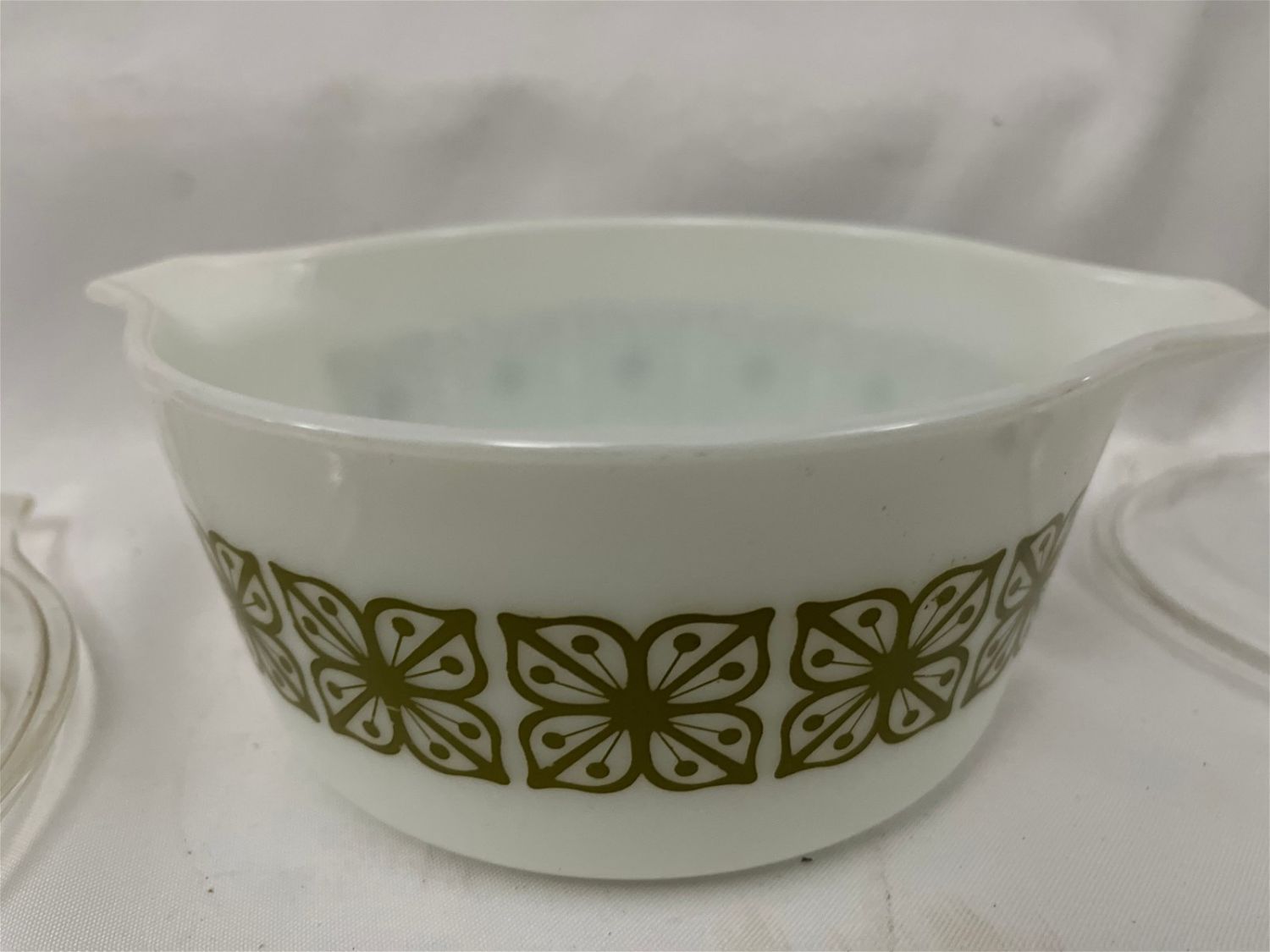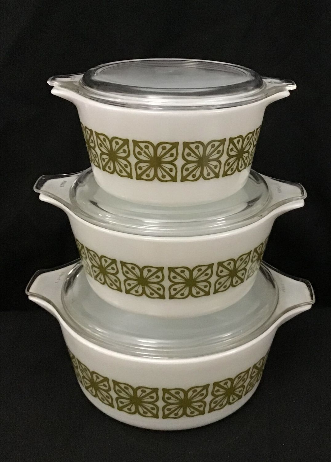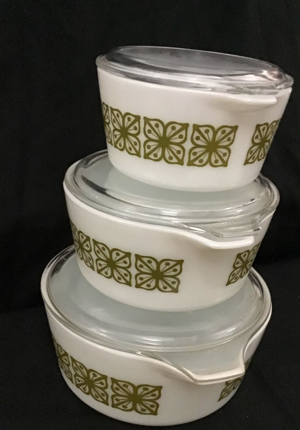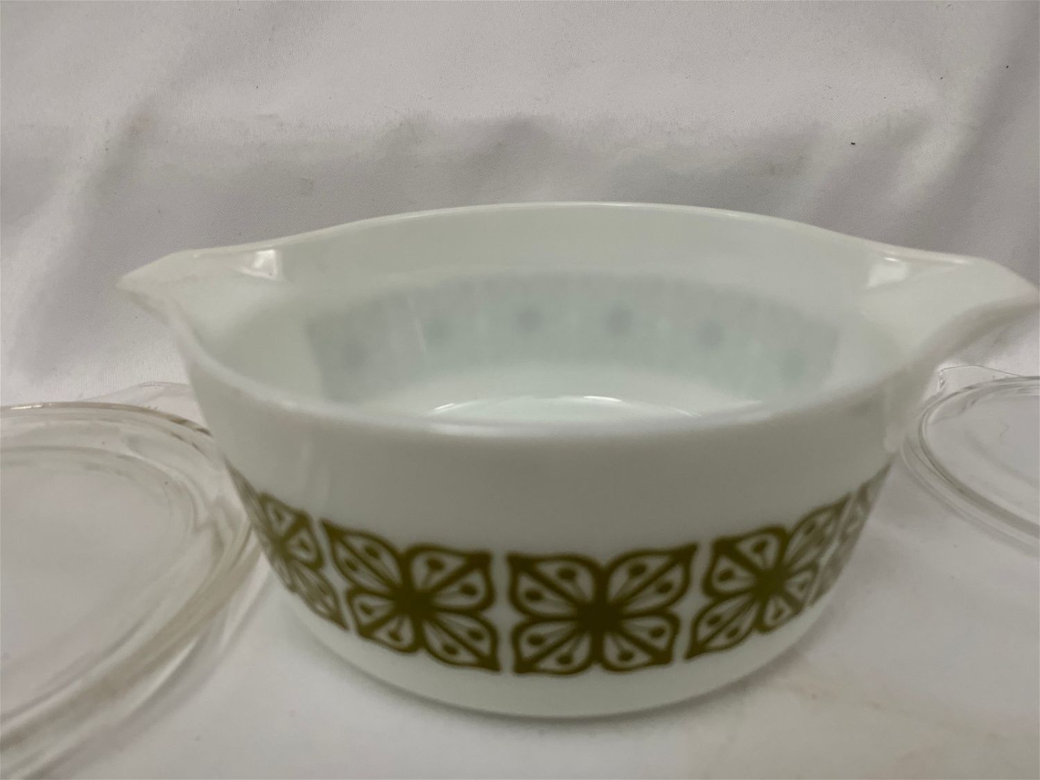 White w/ Green Pattern Bowls w/ Clear Lids.