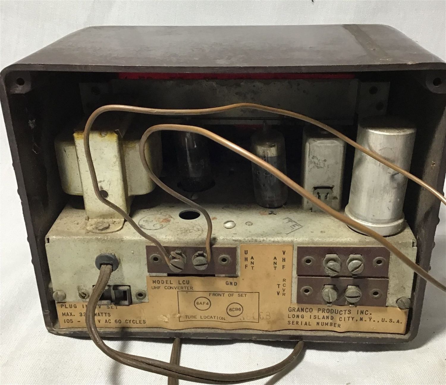 In Bakelite Case, by Granco, Missing dial in front, measures 7 1/2 x 5 1/2 x 4 1/2 Not plugged in