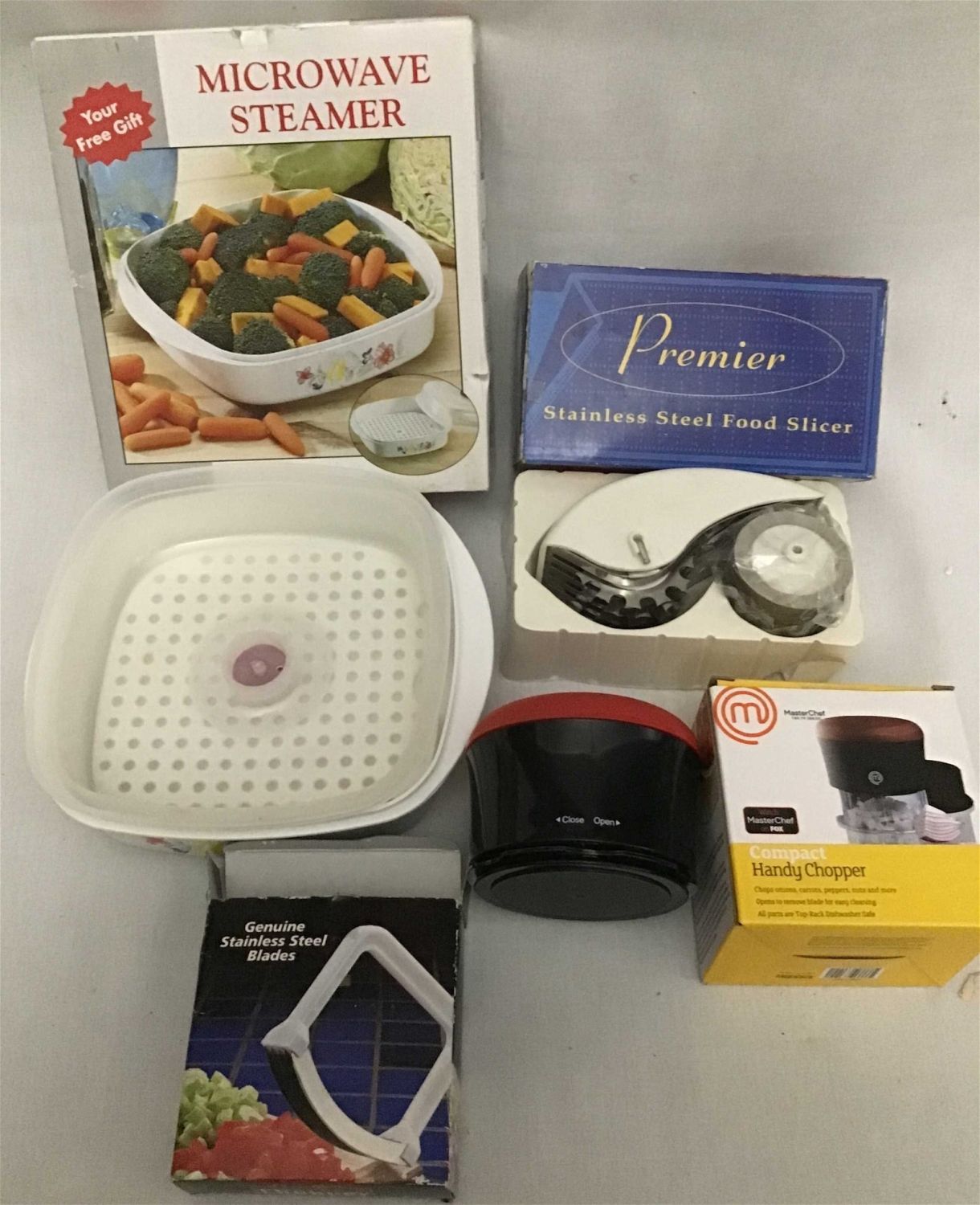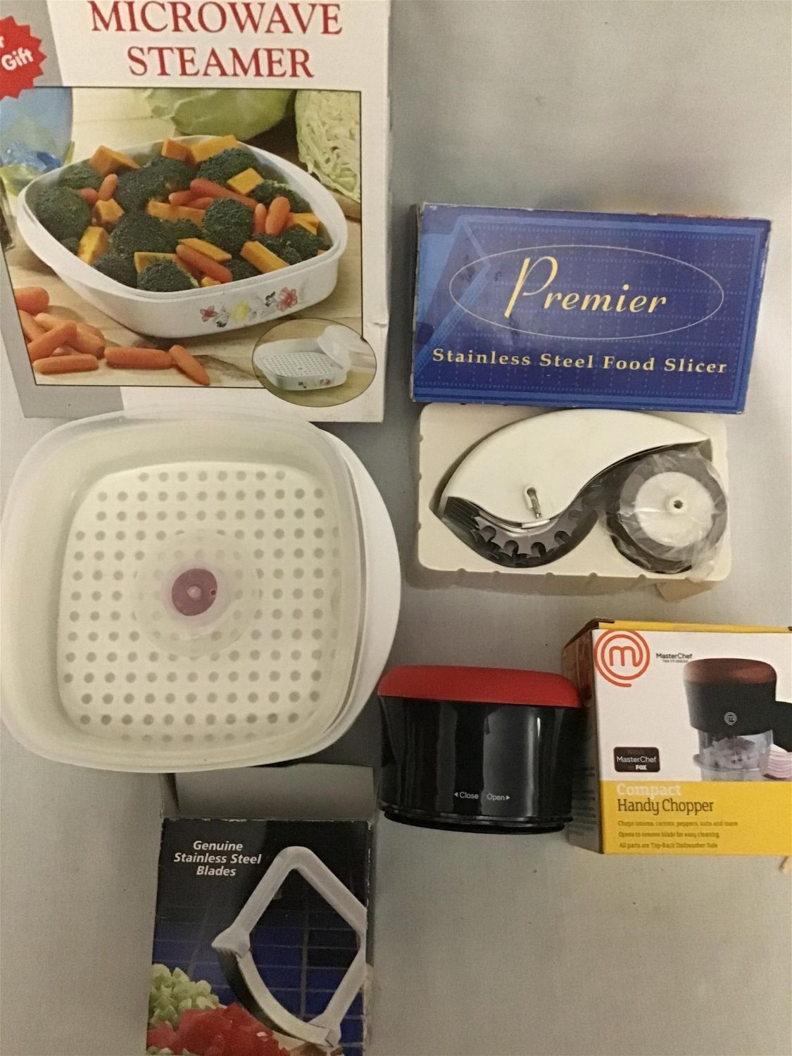 Kitchen, accessories, galore, microwave, steamer, stainless steel food, slicer, handy, chopper, and genuine, stainless steel blades for chopping all in packages