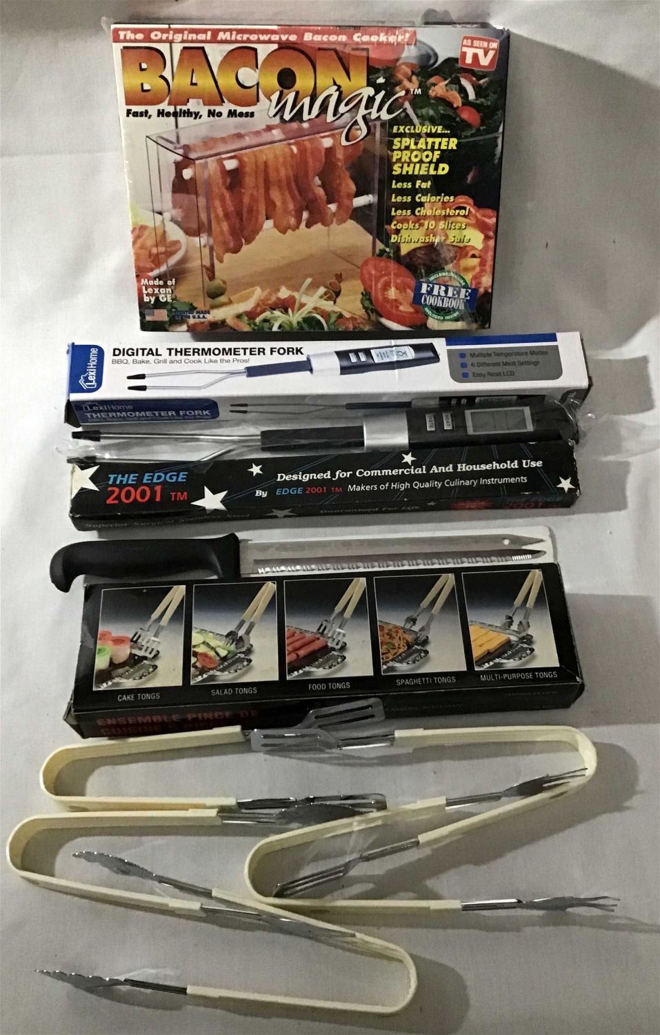 special microwave, bacon cooker, the edge, 2001 surgical stainless knife, digital thermometer, fork five piece tong set