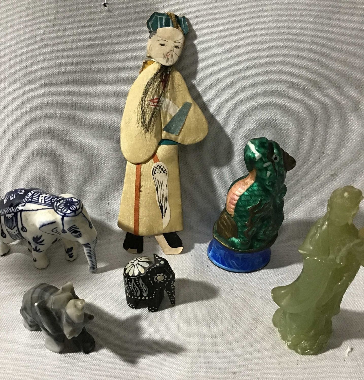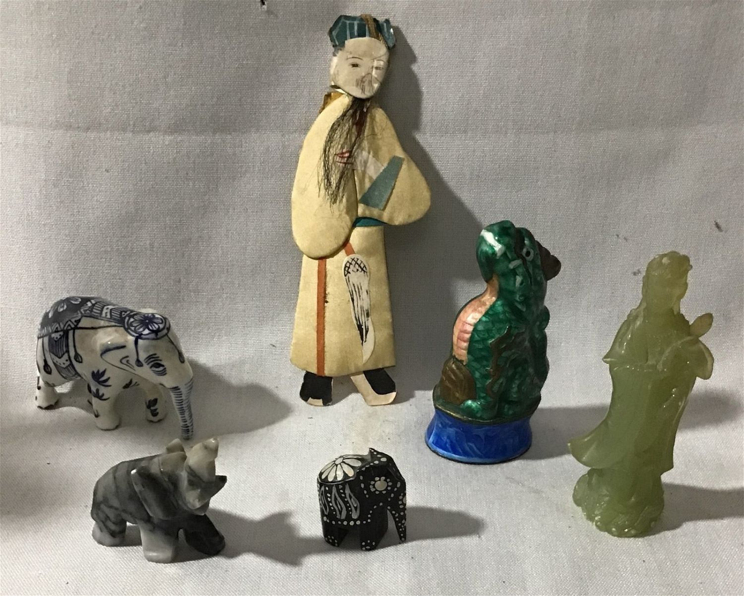 plastic geisha girl, not Jade Other figures, three elephants and dragon all under 5 inches