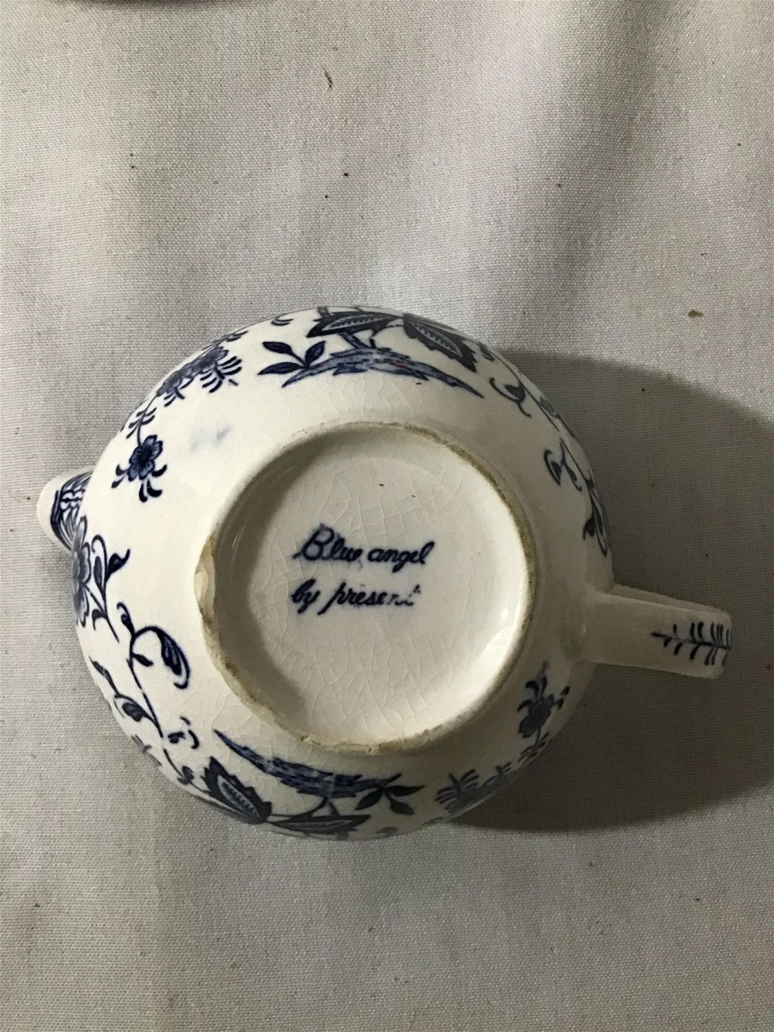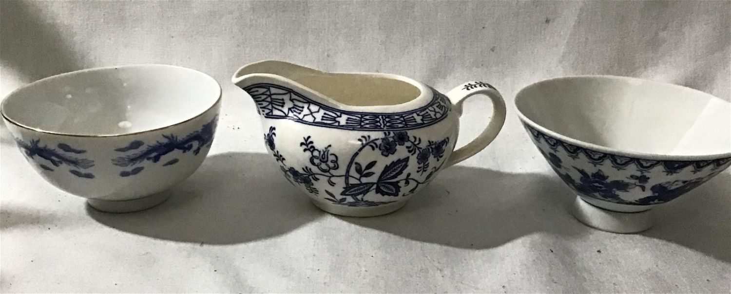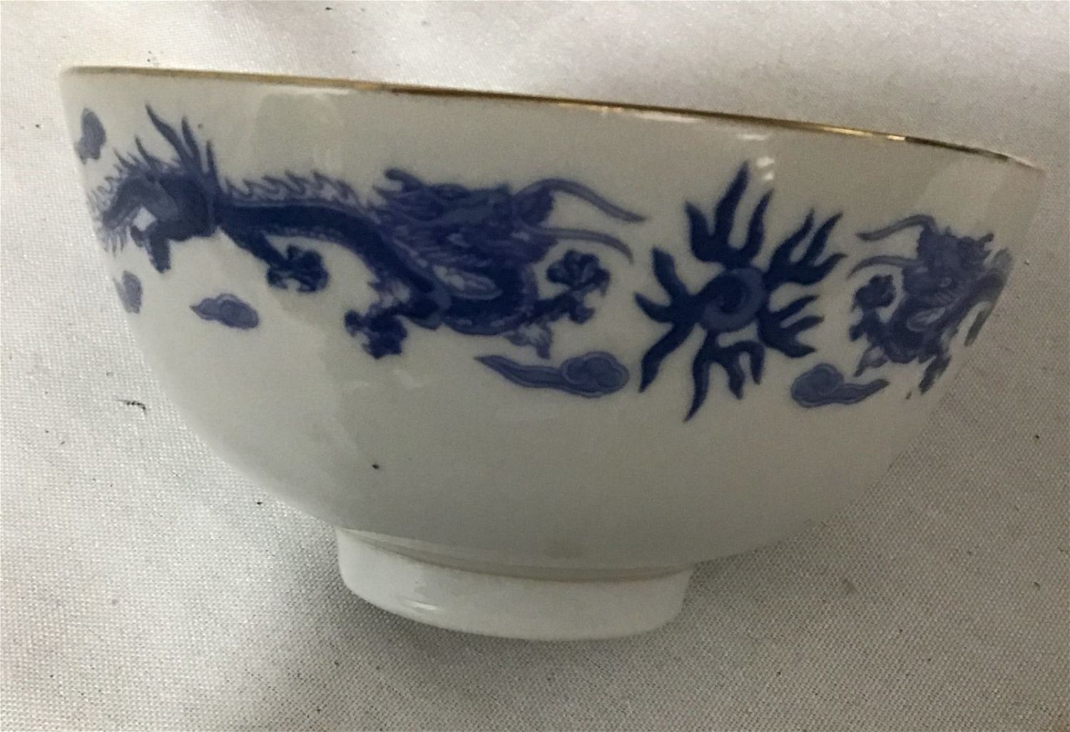 One Japanese footed rice noodle bowl, blue and white porcelain unmarked also One Taijuan porcelain blue Dragon, rice, soup bowl also Present, blue Angel Chyna creamer