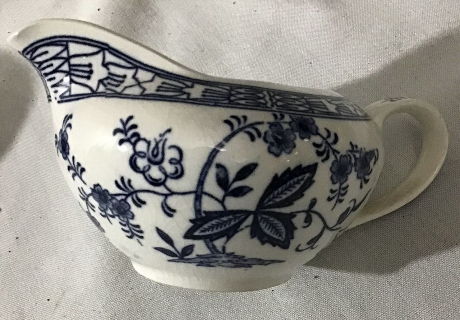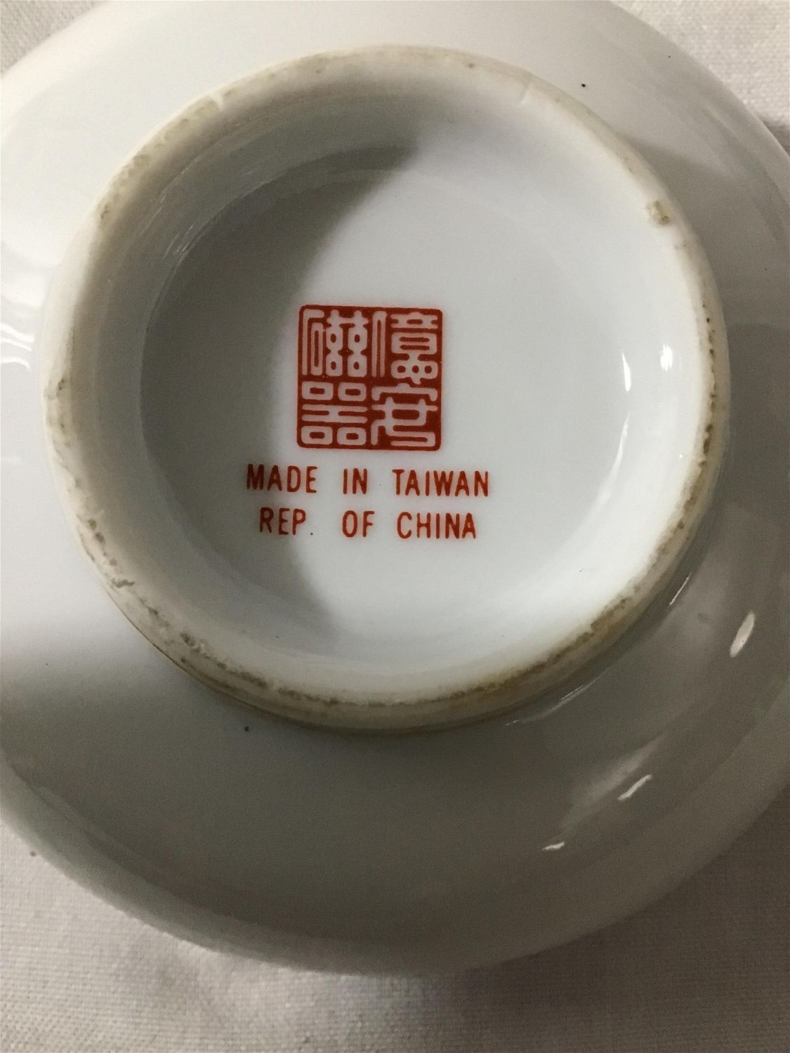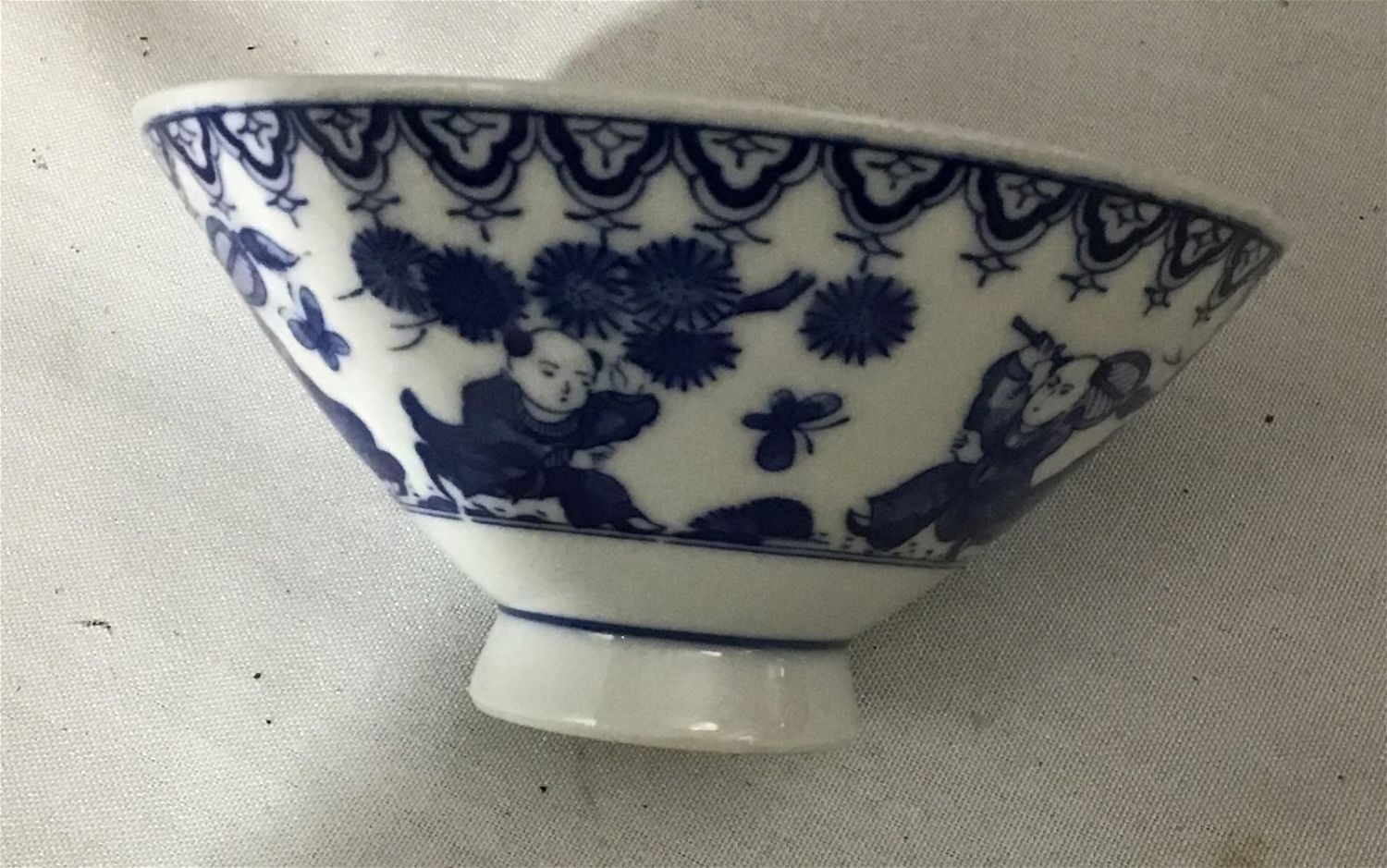 One Japanese footed rice noodle bowl, blue and white porcelain unmarked also One Taijuan porcelain blue Dragon, rice, soup bowl also Present, blue Angel Chyna creamer
