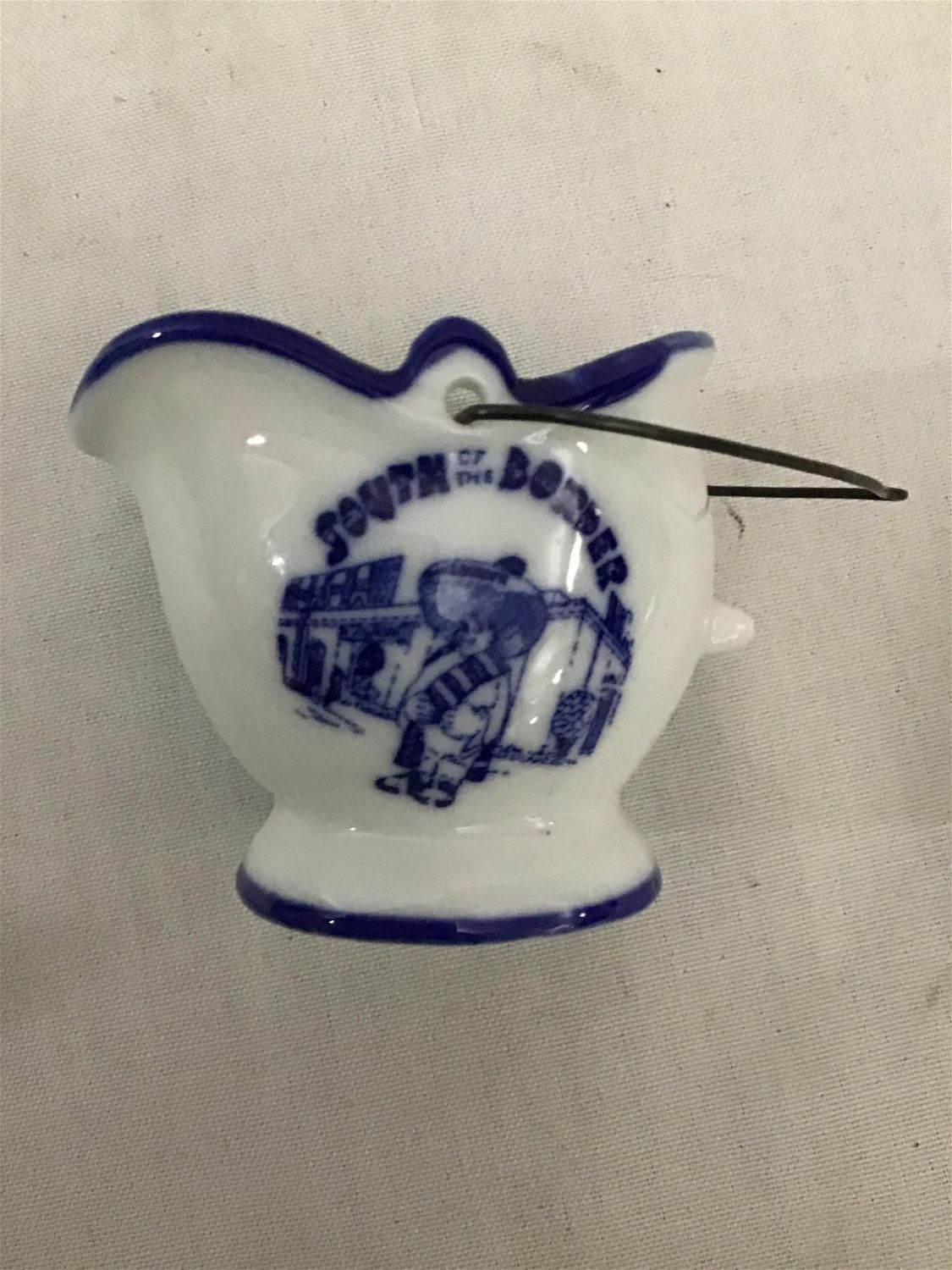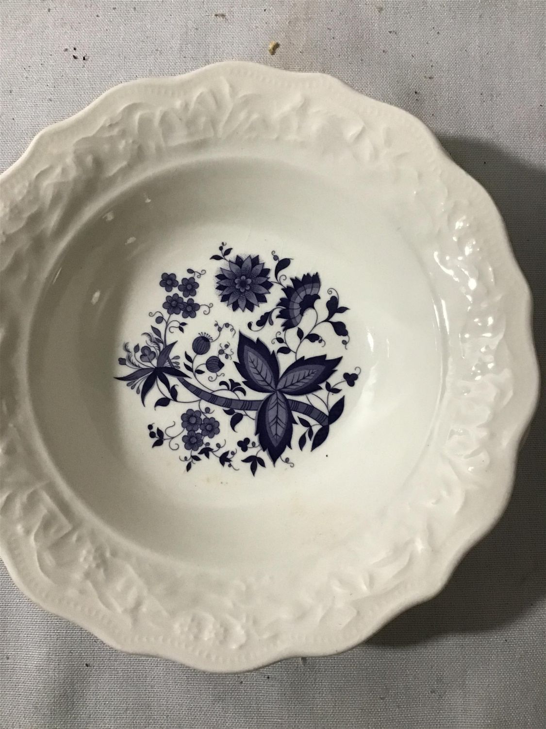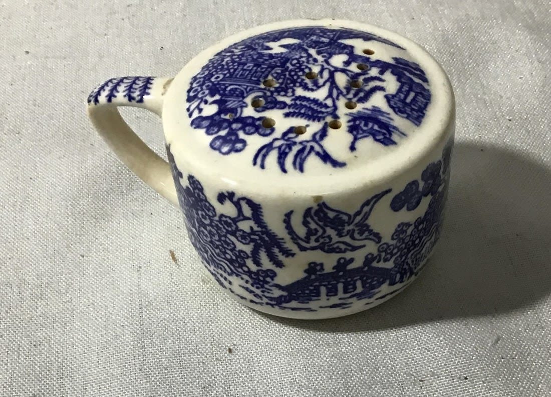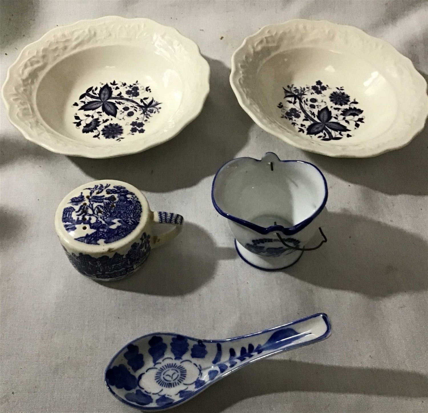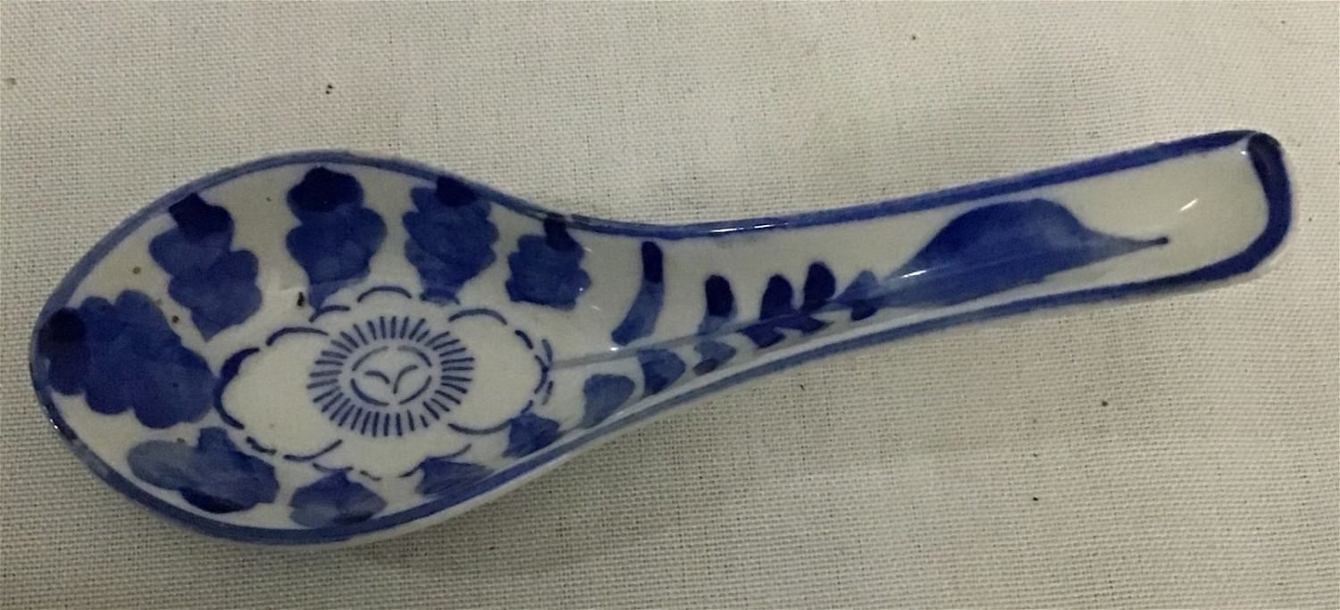 Mount Clemens purple onion, 5 7/8 to bowl set also vintage Chinese porcelain soup spoon also Asian pepper shaker, no salt, shaker included. Also, small blue and white porcelain pitcher 2 inches high