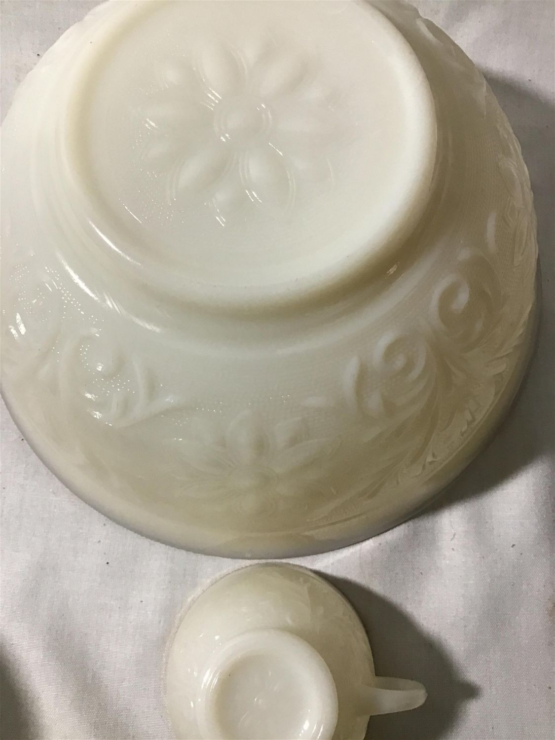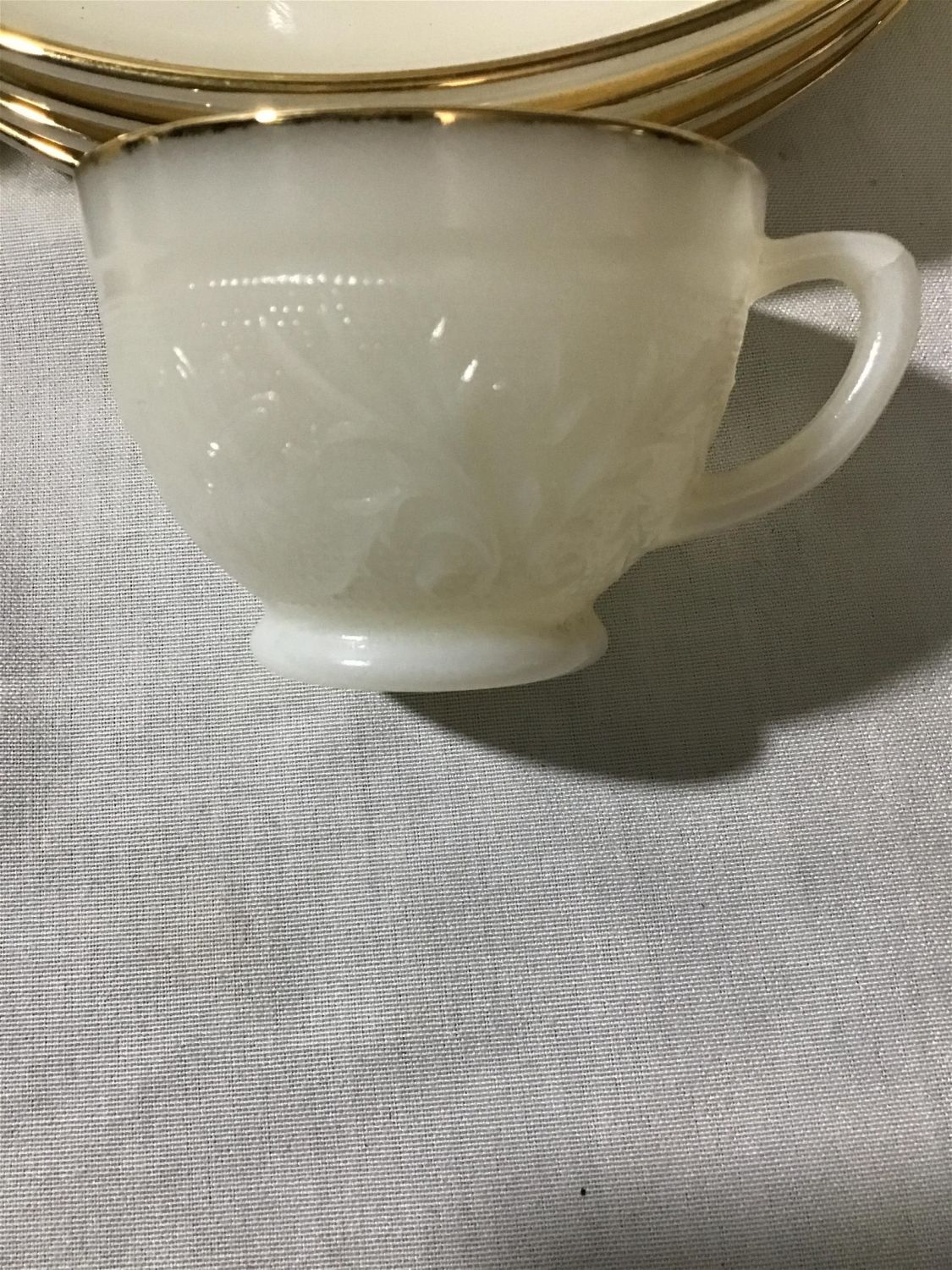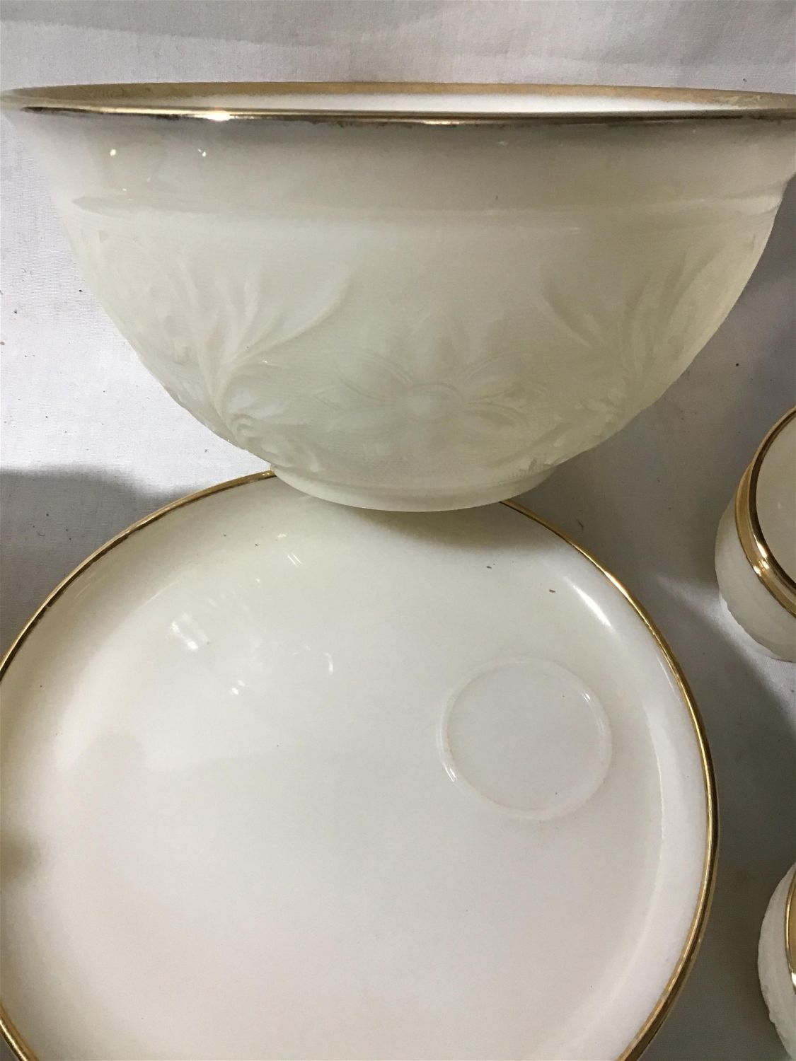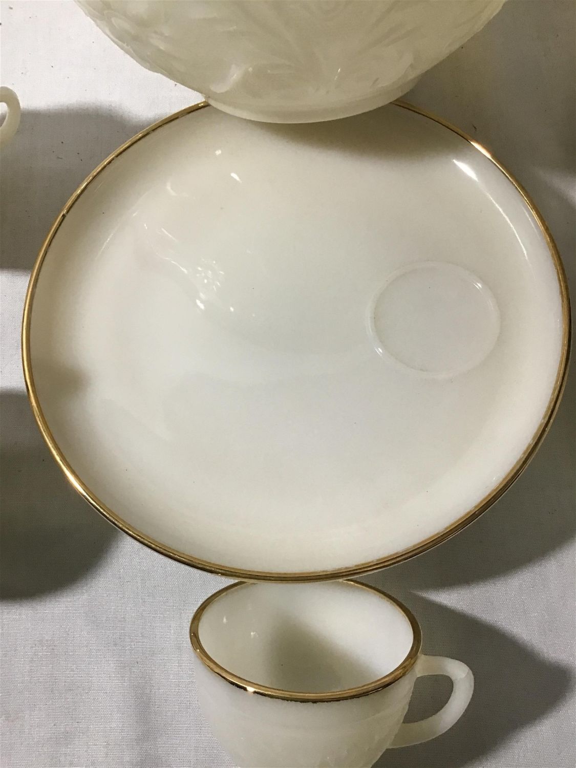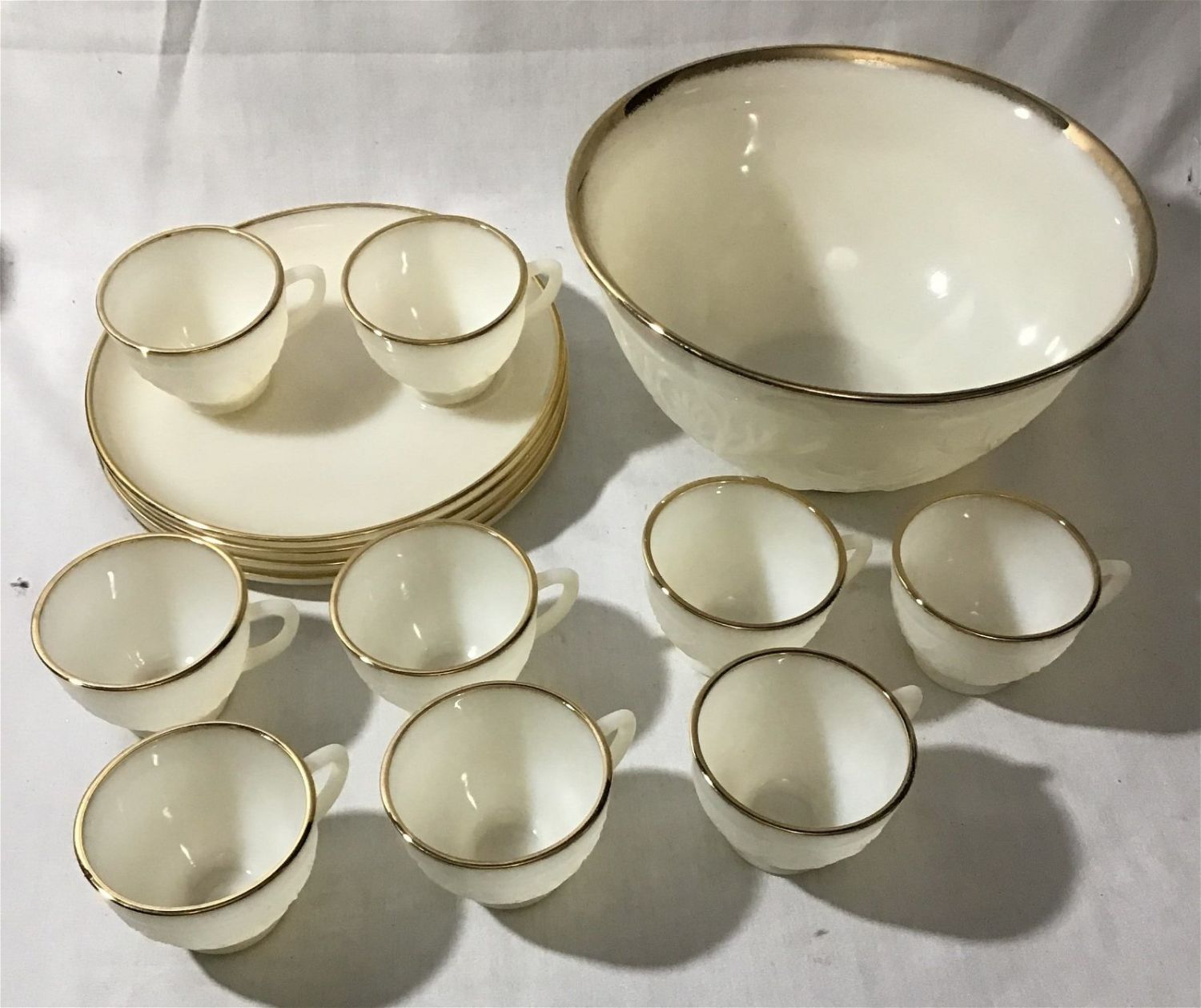 bowl with gold trim measures 10 inches across includes 9 cups and 4, 9 inch plates with gold trim