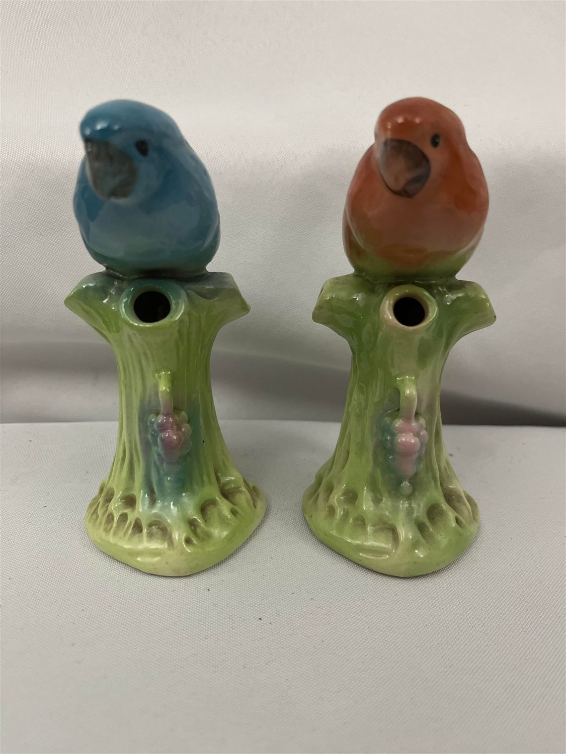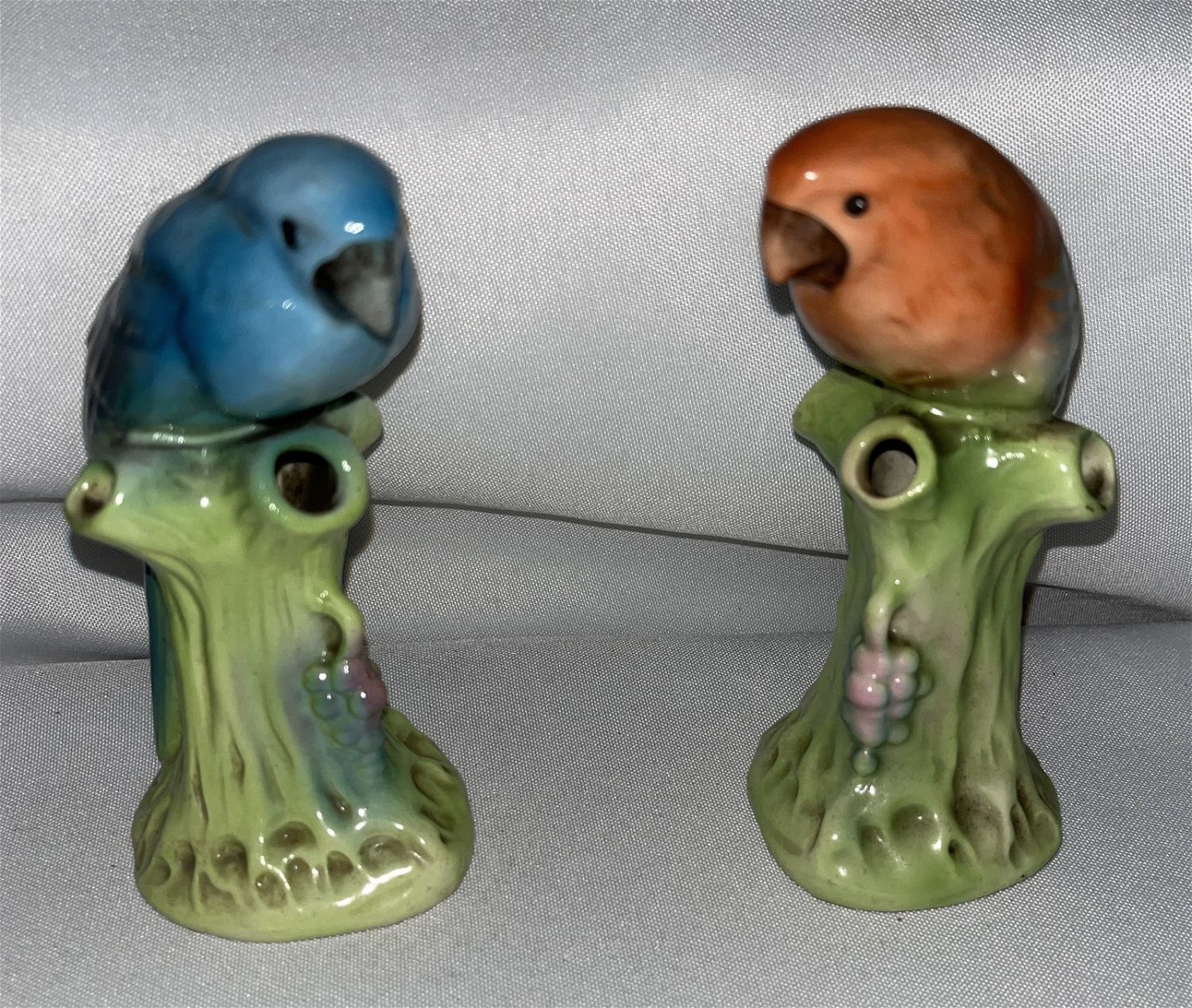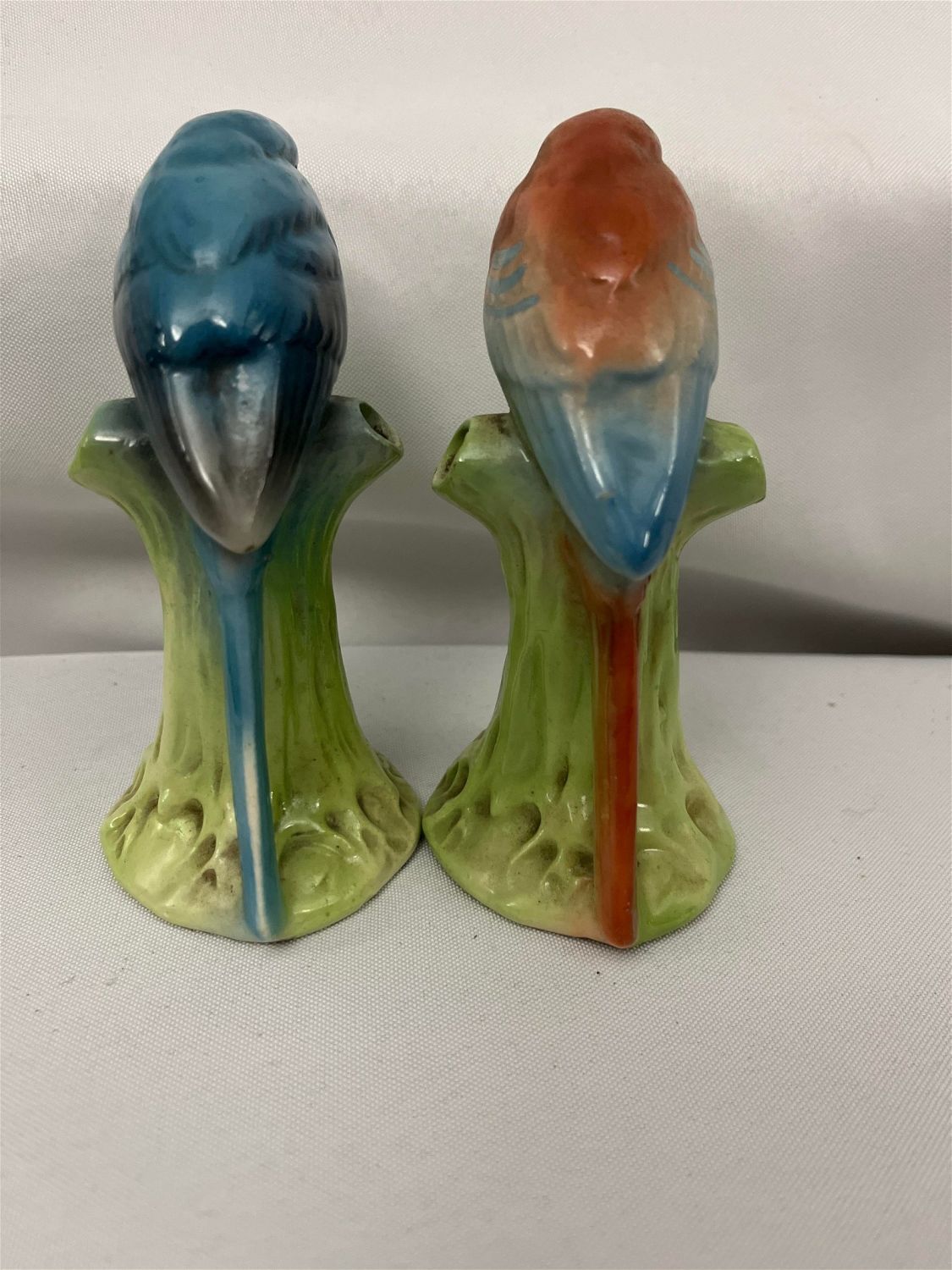 Each measures 5.5 inches tall, blue bird has slight scratch on head and rubbing on back of tail.