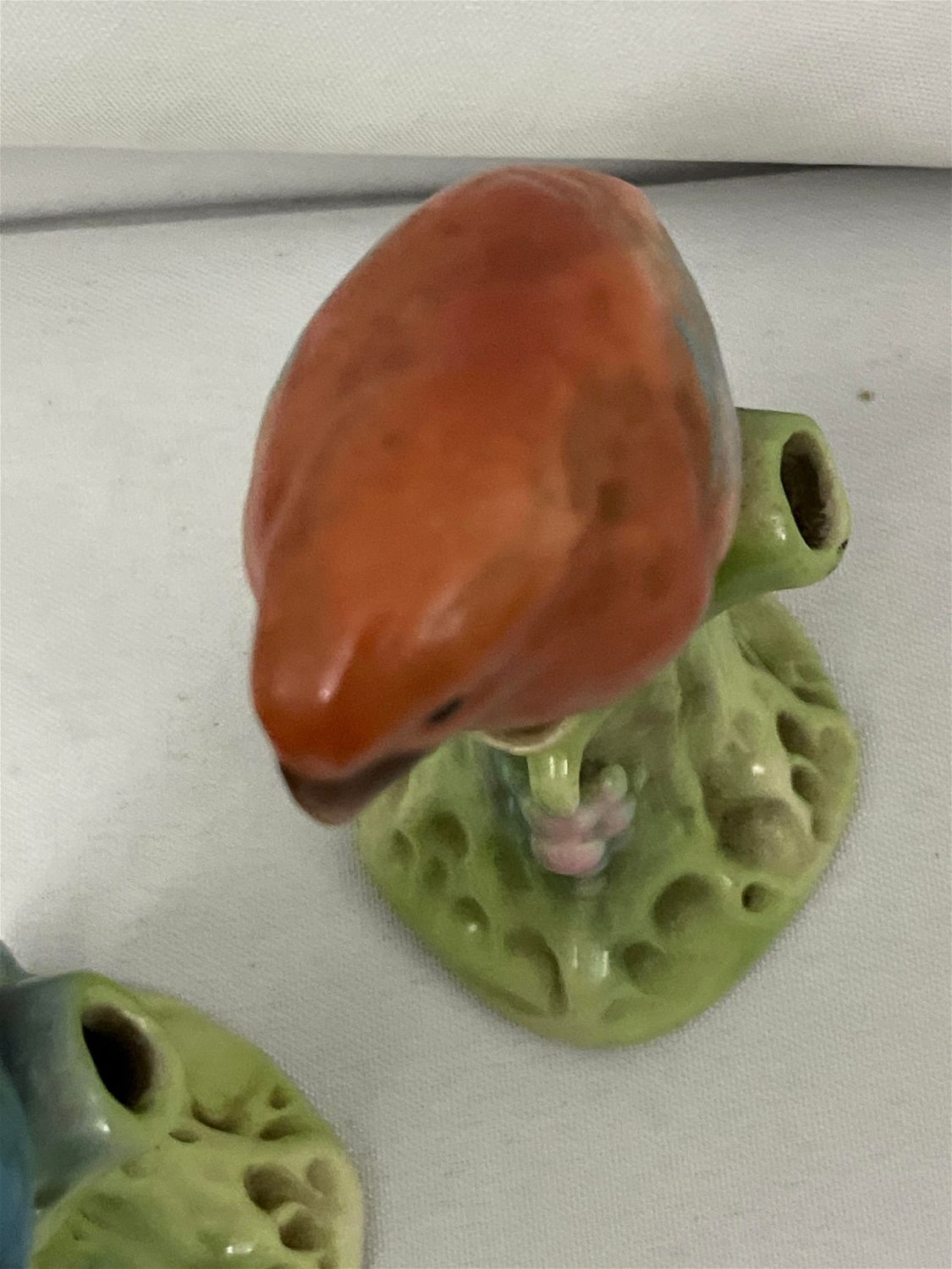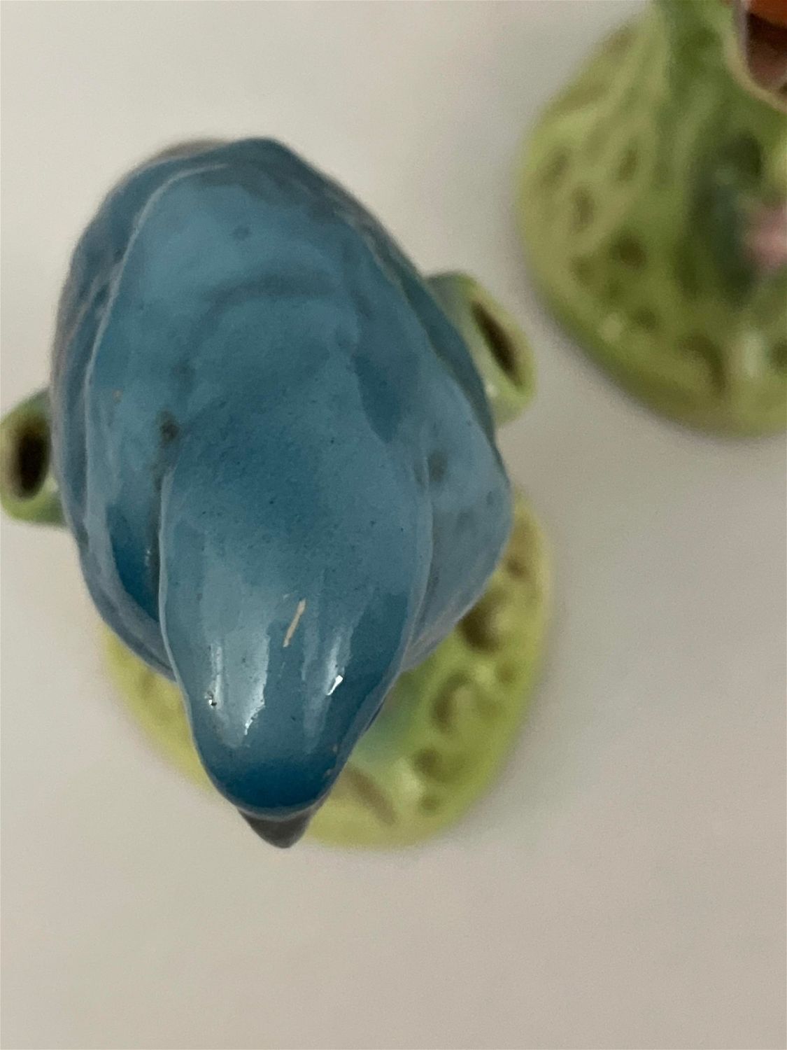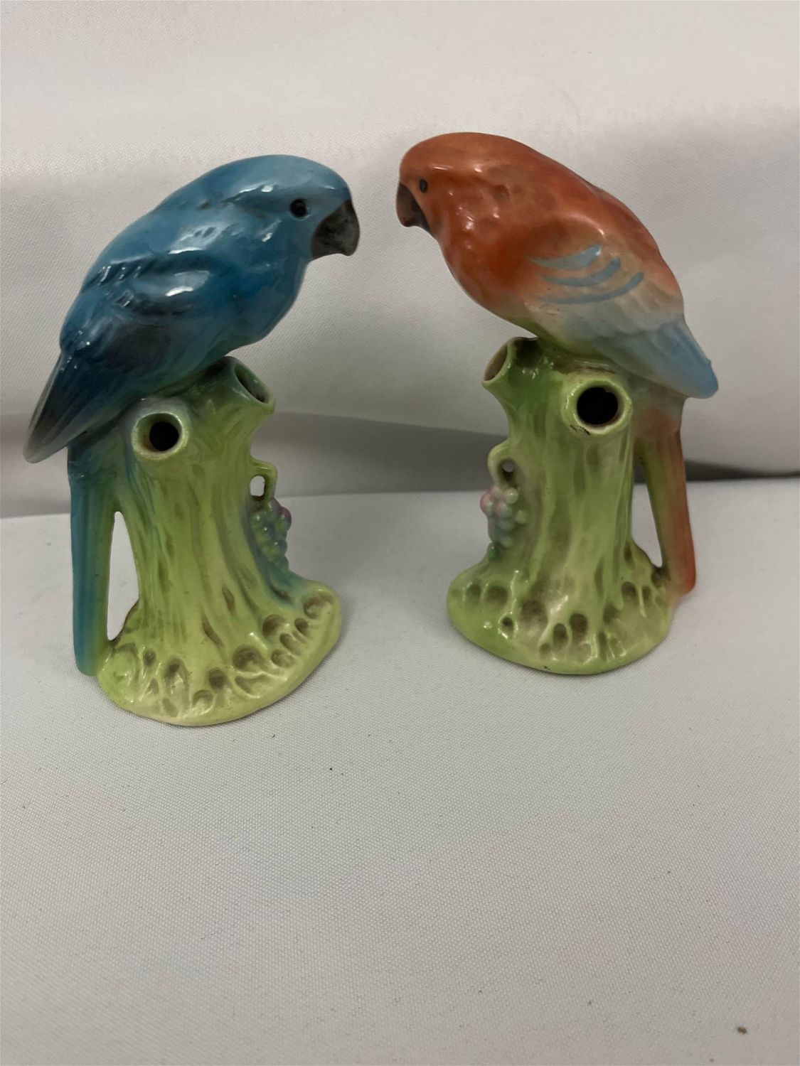 Each measures 5.5 inches tall, blue bird has slight scratch on head and rubbing on back of tail.