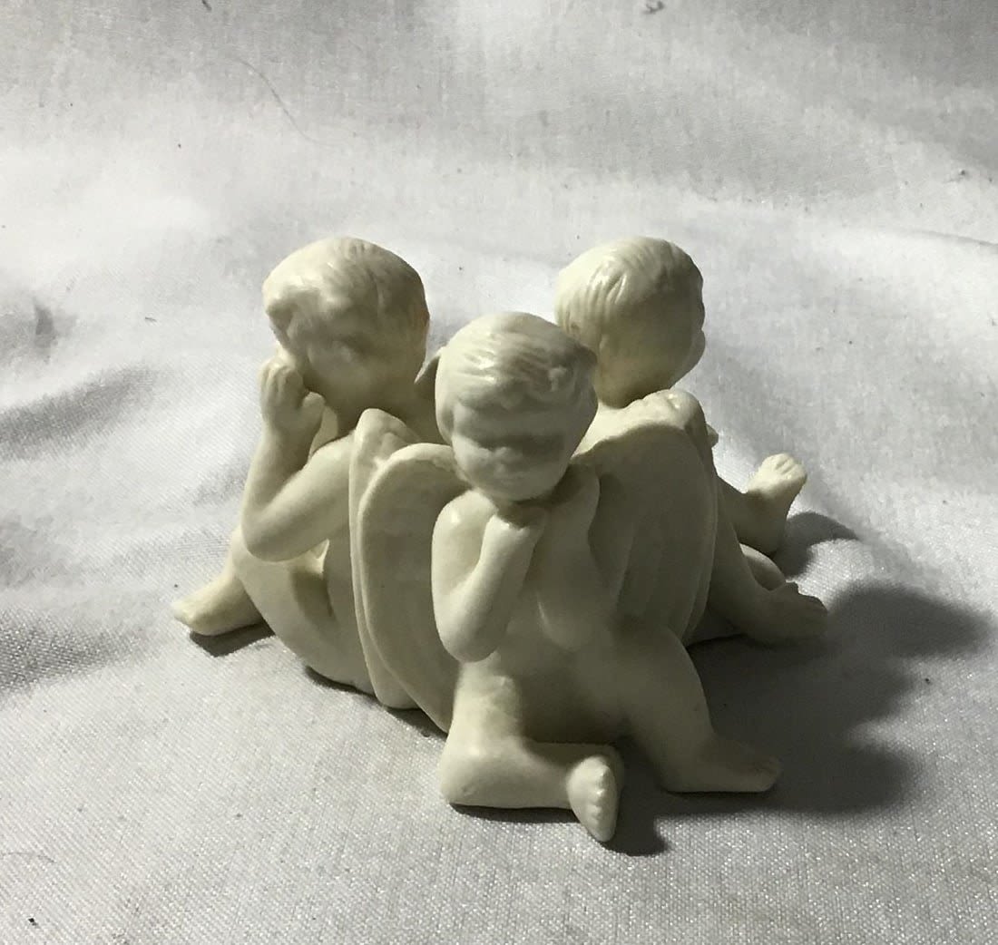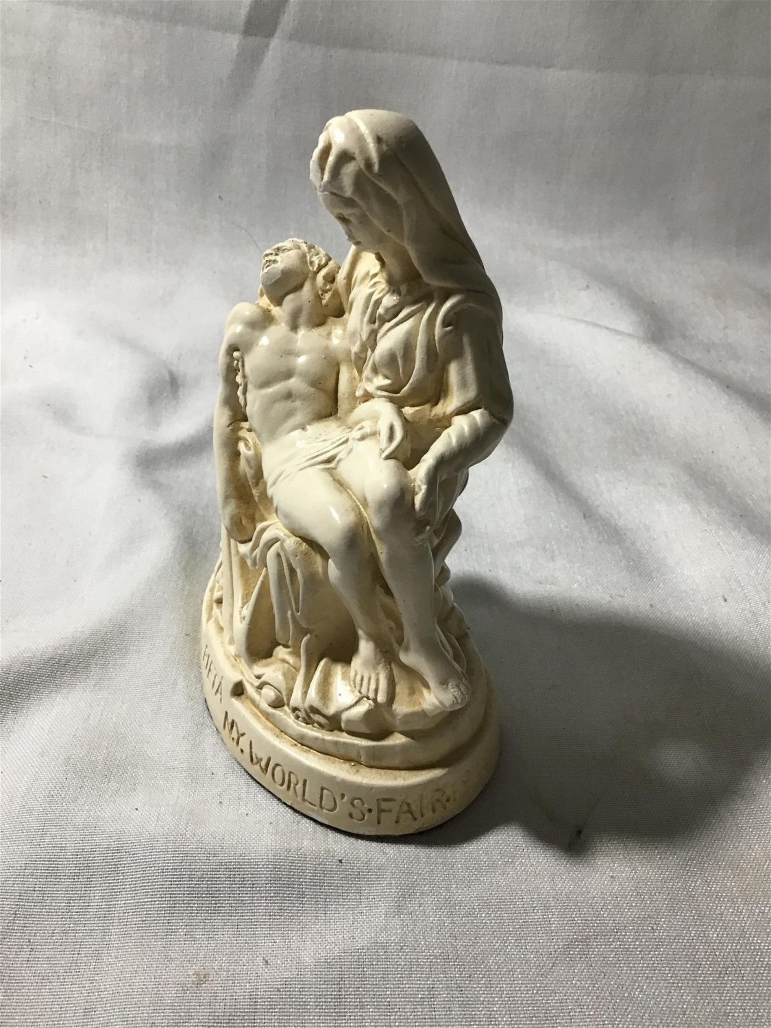 three angels at the base of a candle stick the Pieta, Christ, and Mary 1964, New York worlds fair and Mary. Praying No markings Mary the tallest at 6 1/2 inches