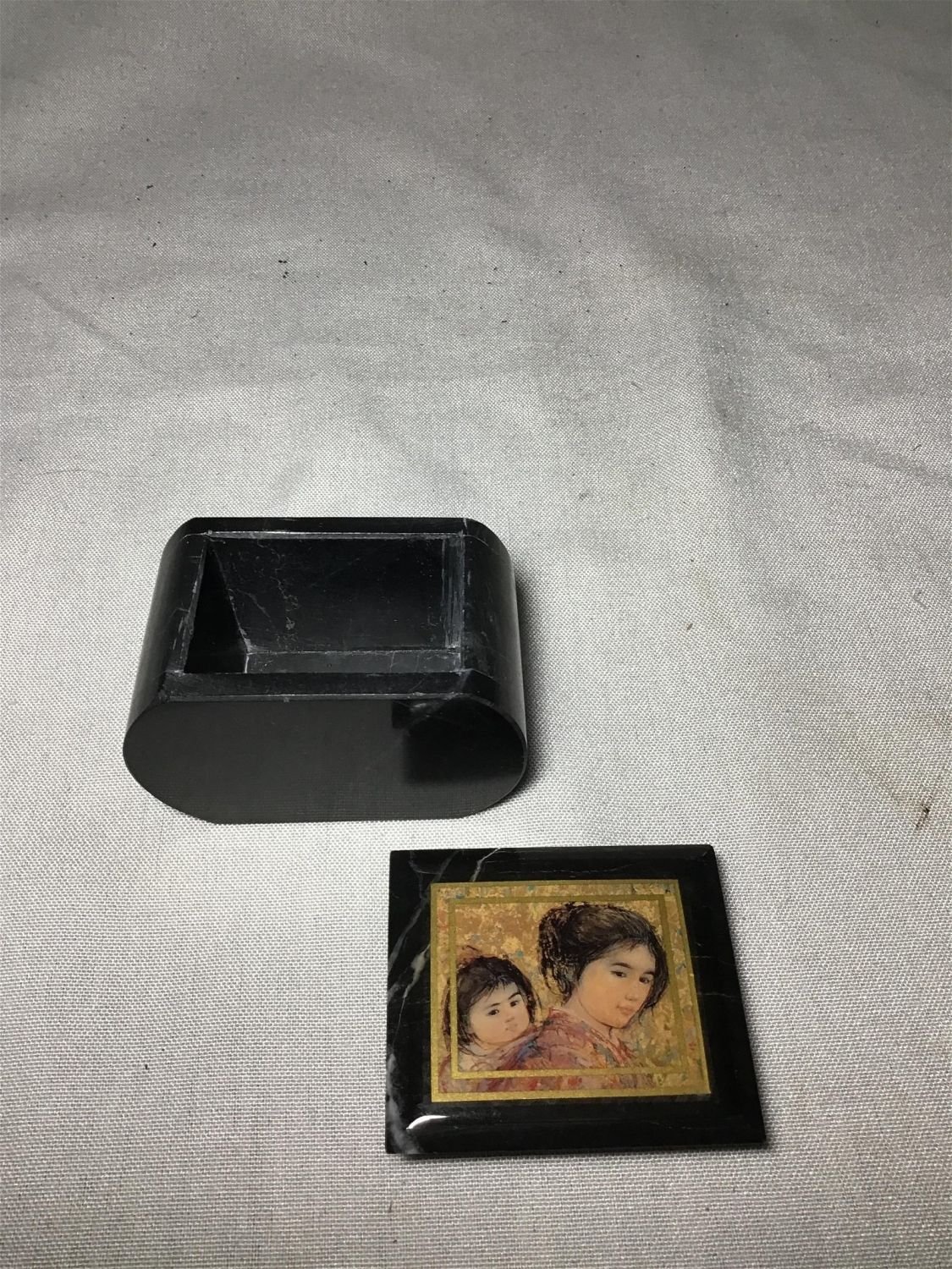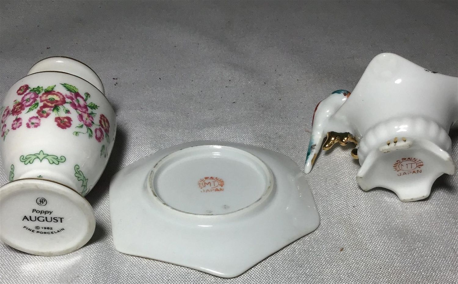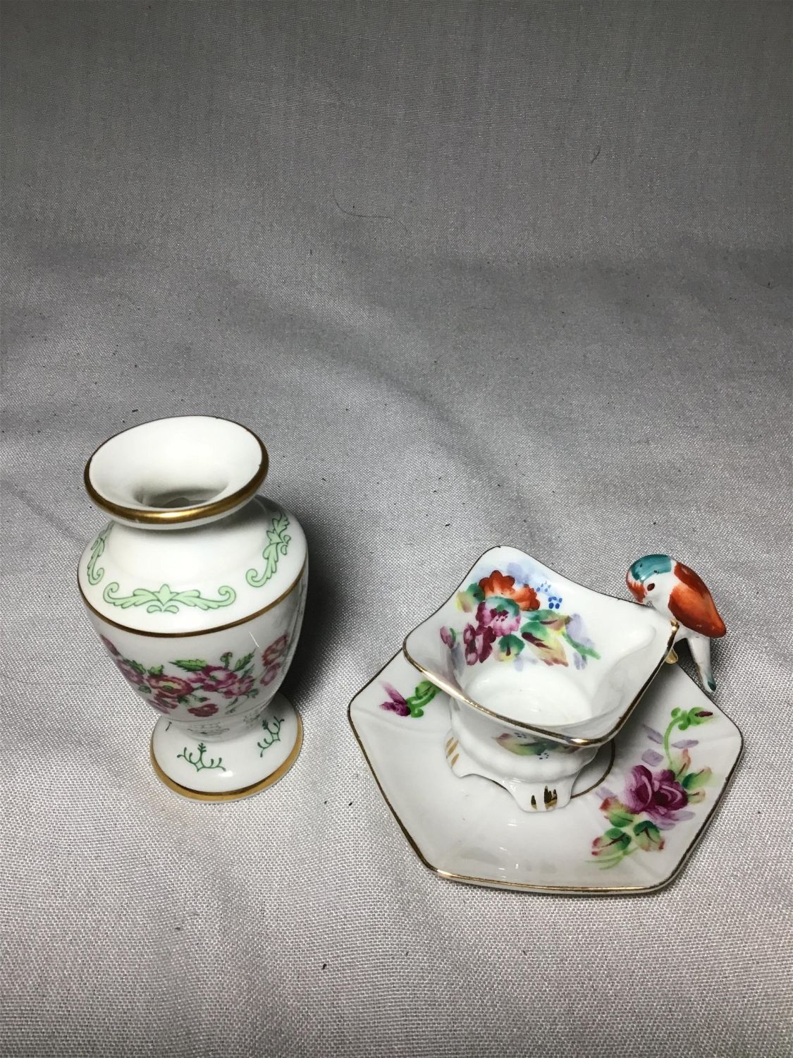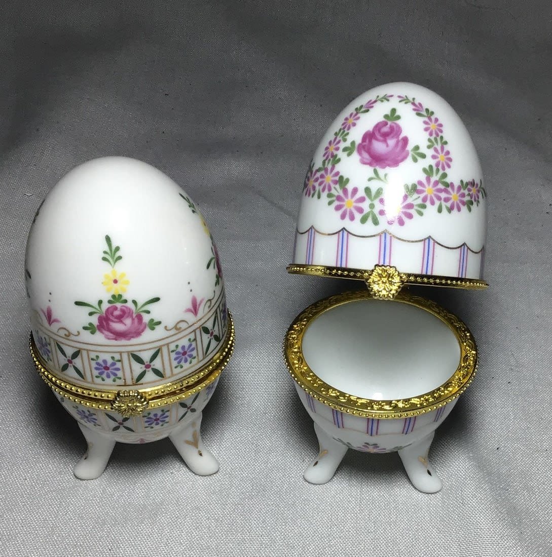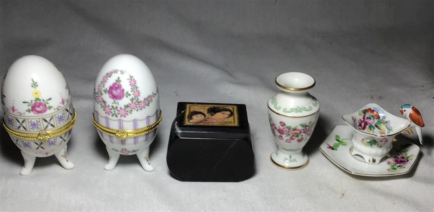 Trinket box, mother daughter picture, Two vintage ceramic Easter egg trinket boxes, 4 inches height. One small flowered face, gold, trim, and One miniature, hand-painted, MK, Japan, bird on Bowl.