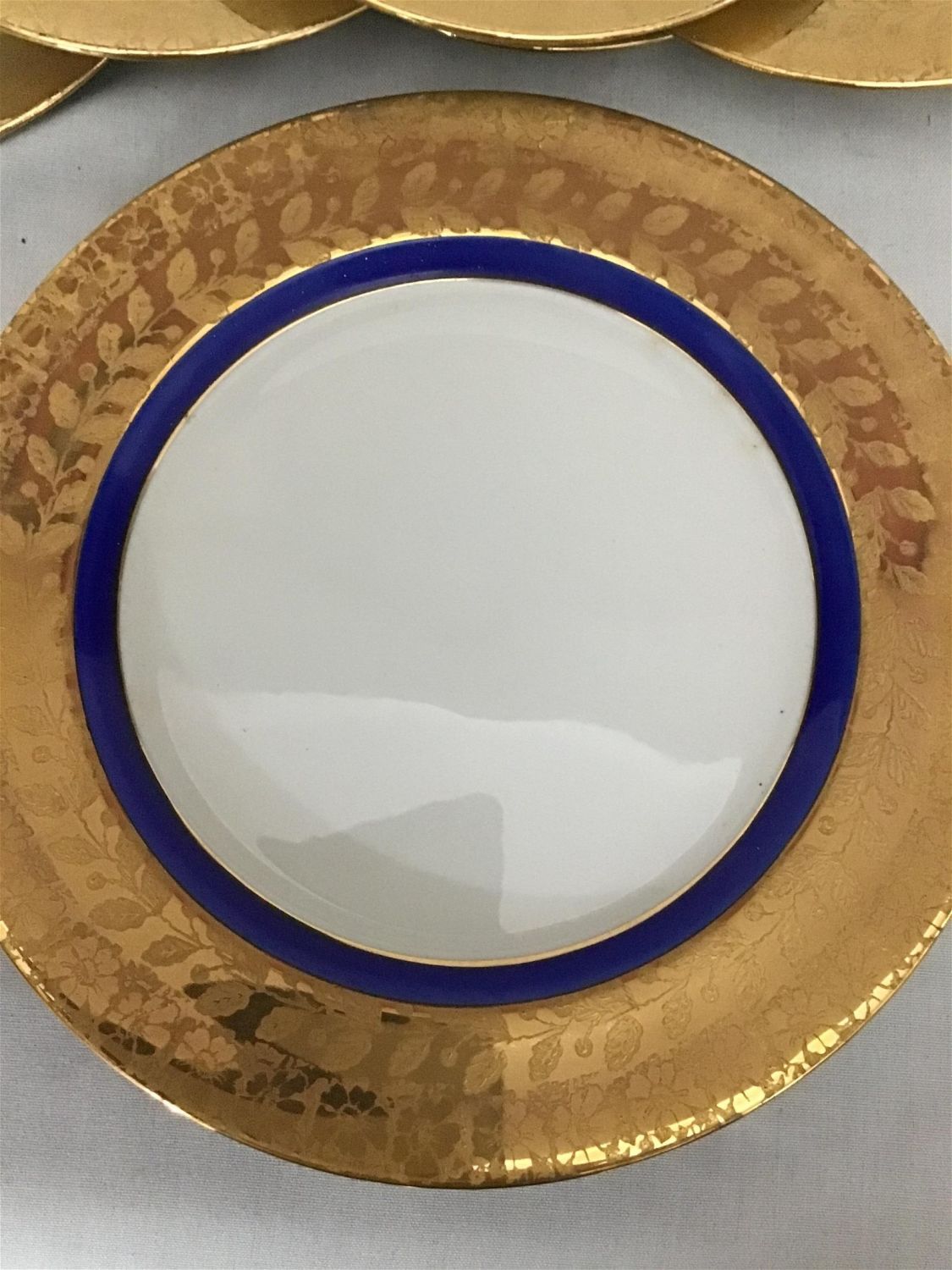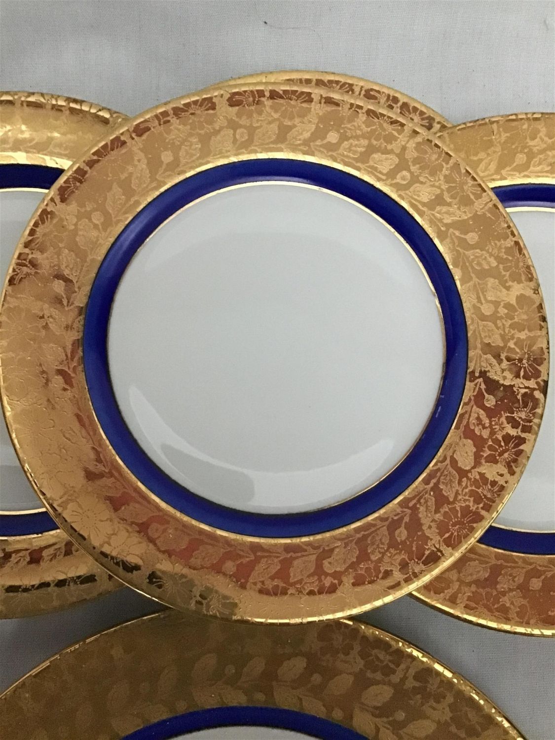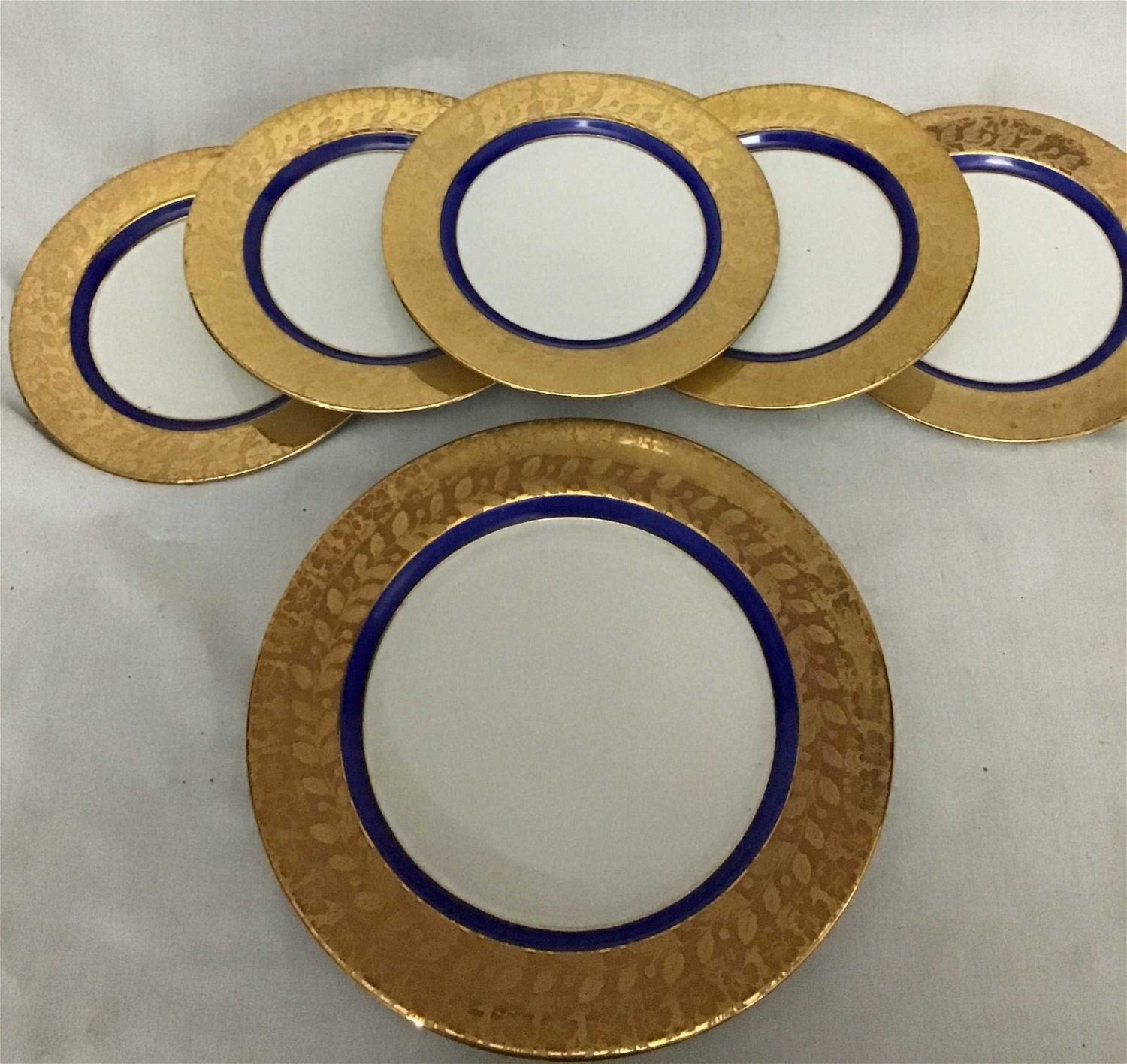 six 7 1/2 inch plates and one 10 1/4 inch plate, striking gold and blue color seven plates total.