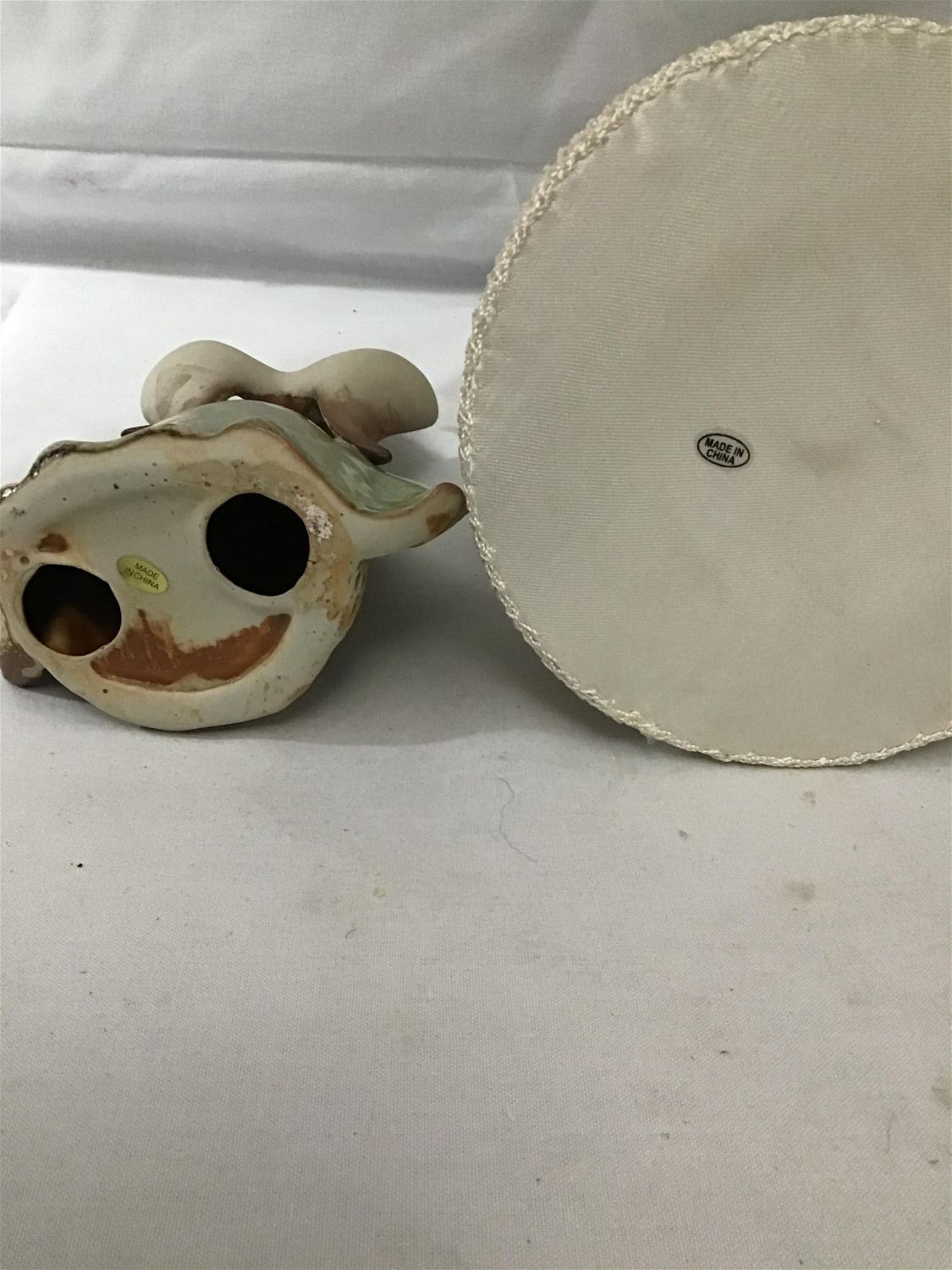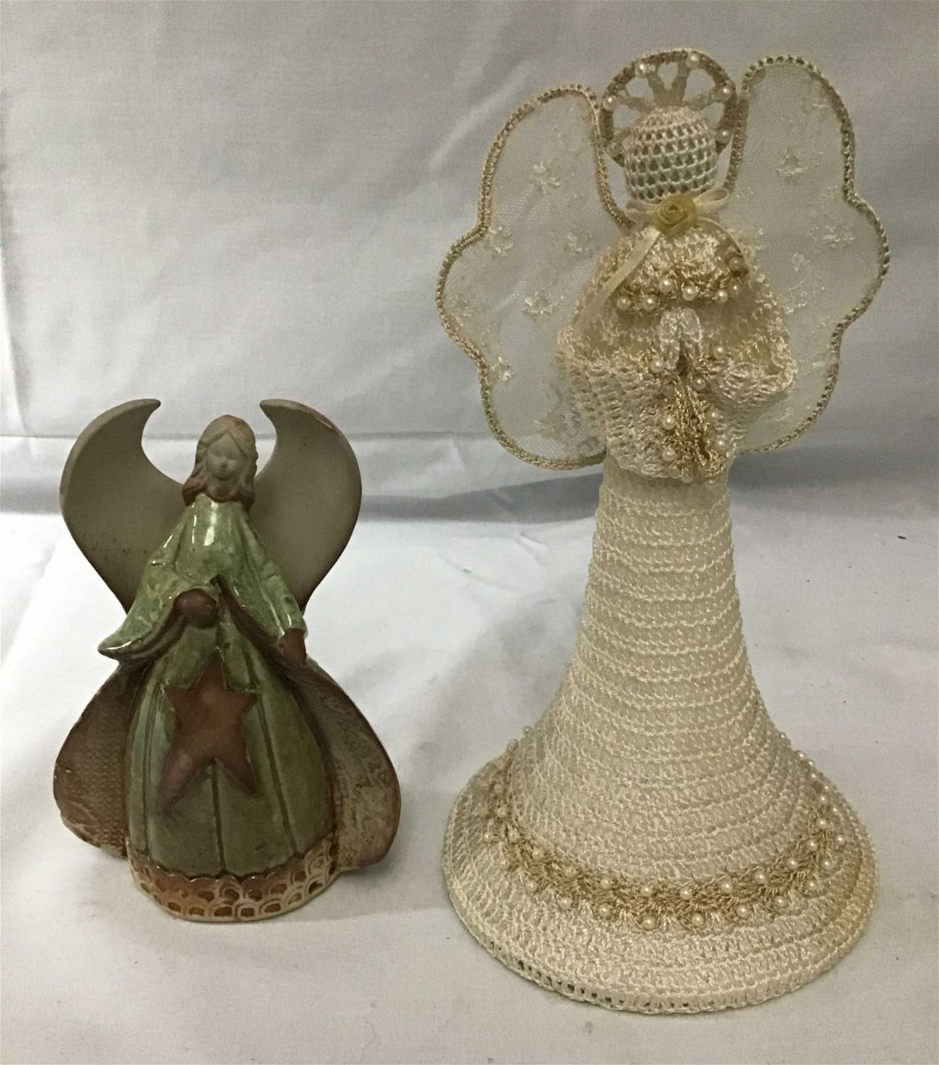 Greenplace angel with star in front measure 7 inches high by 4 inches at base fabric angel with pearl highlights maybe crocheted measures 10 1/2 inches high by 6 inches at base