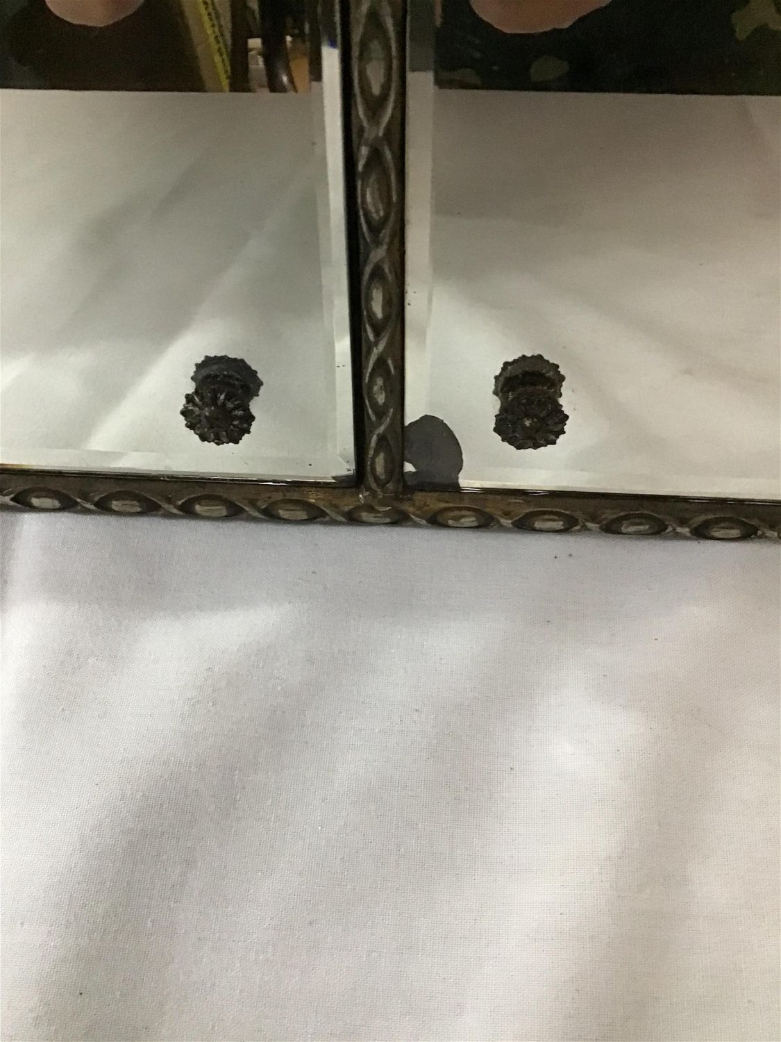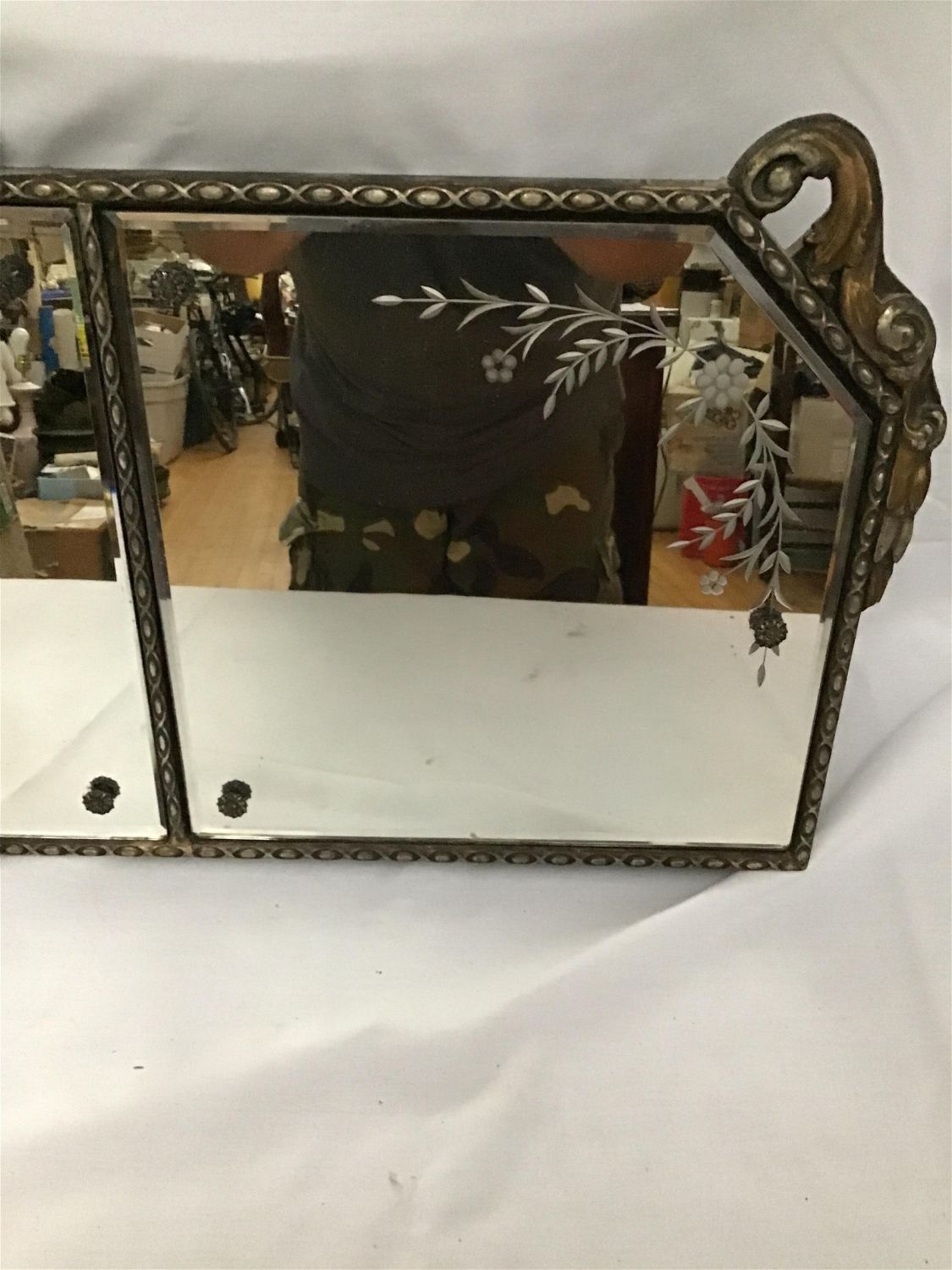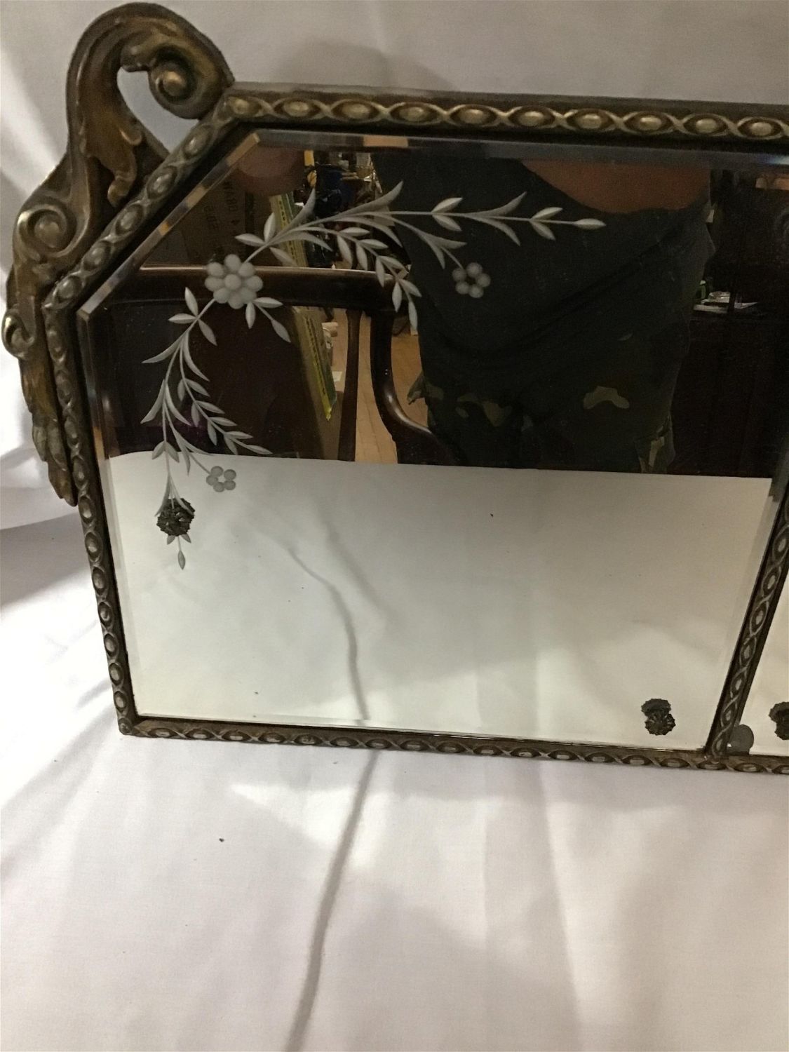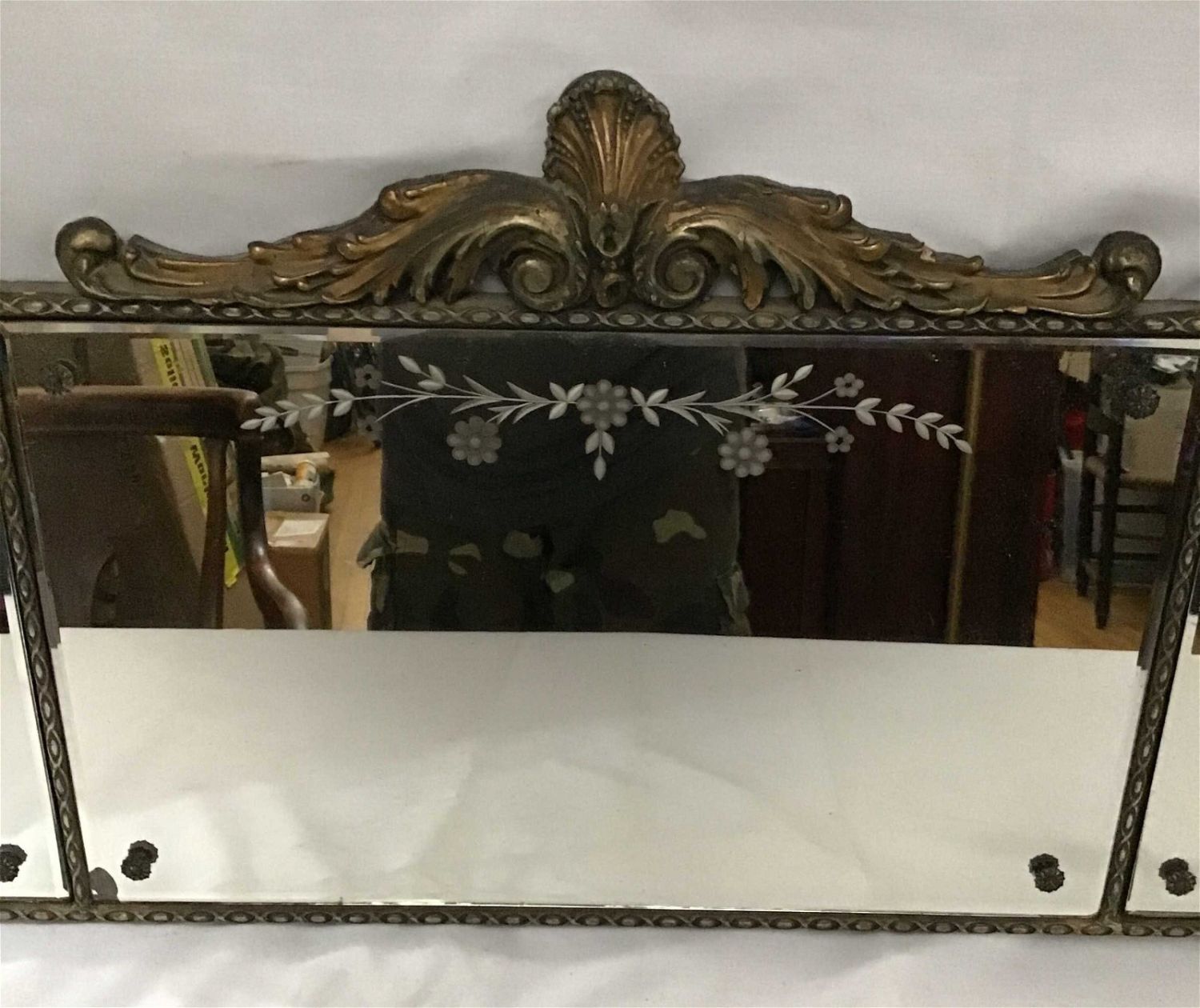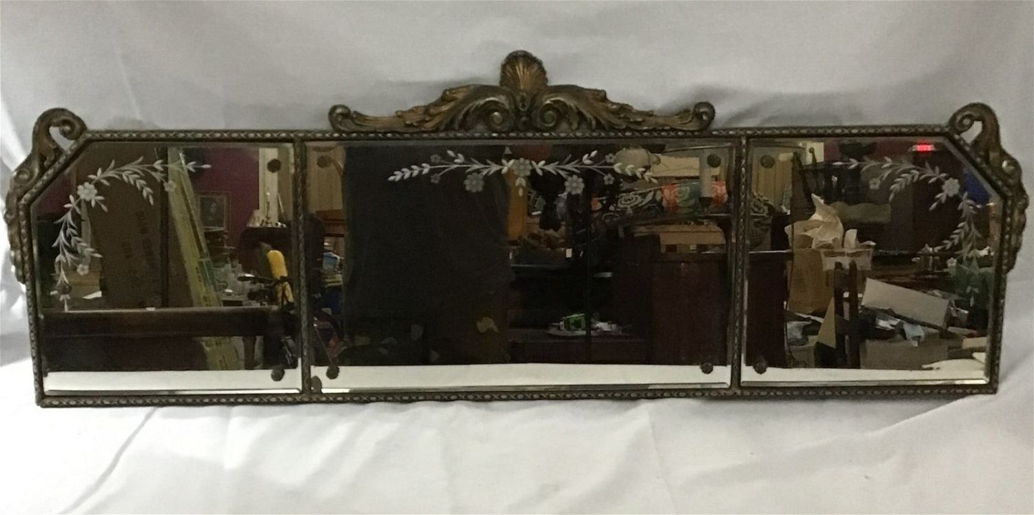 measuring 45 1/2, 16 1/2 at center comprised of three individual etched mirrors And a decorative metal over wood frame.