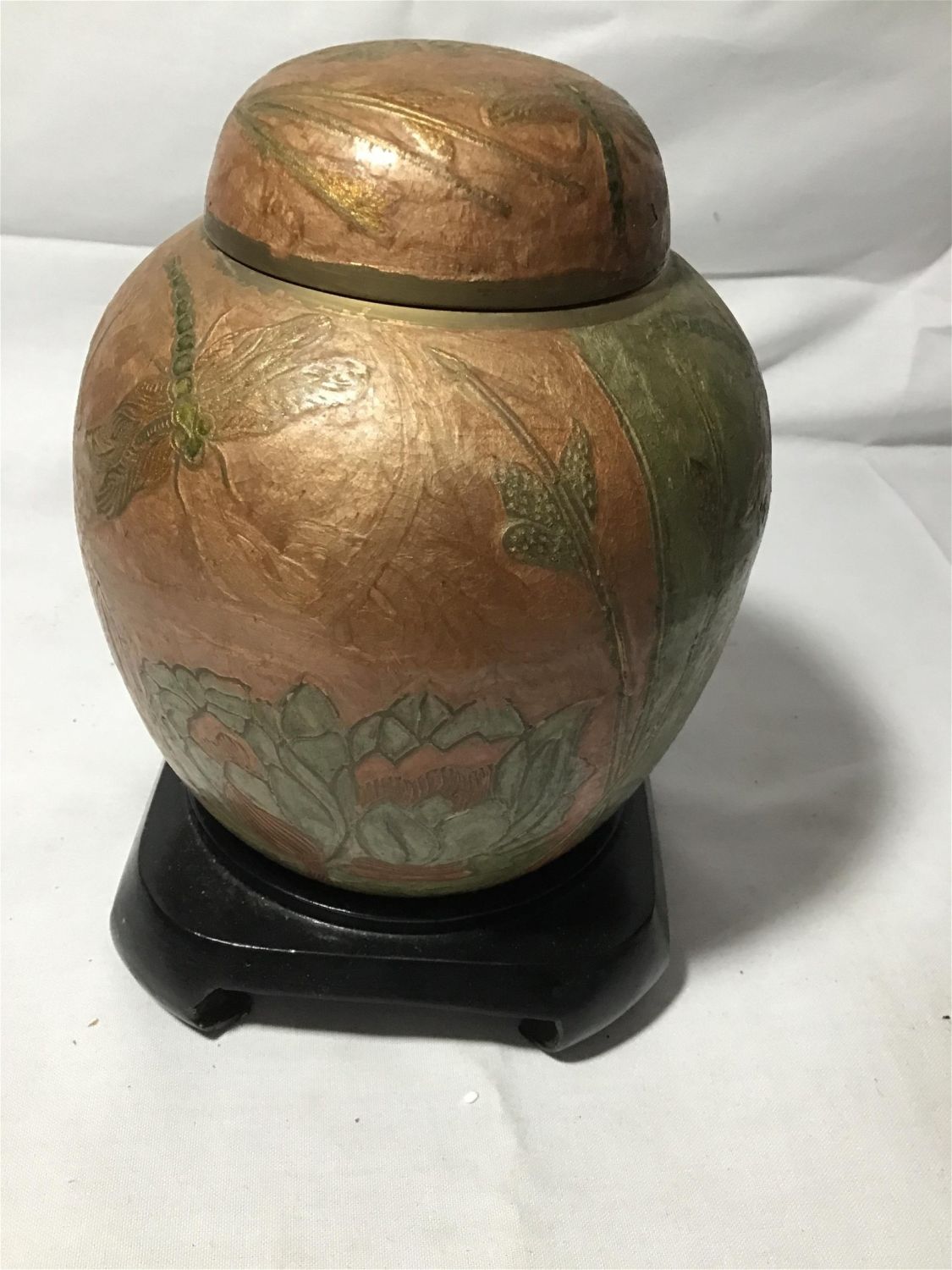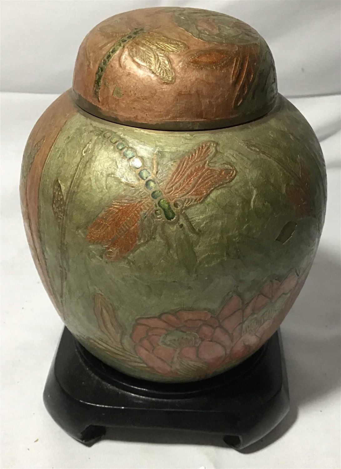 includes wooden stand, and lid. measures 8 1/2 inches tall