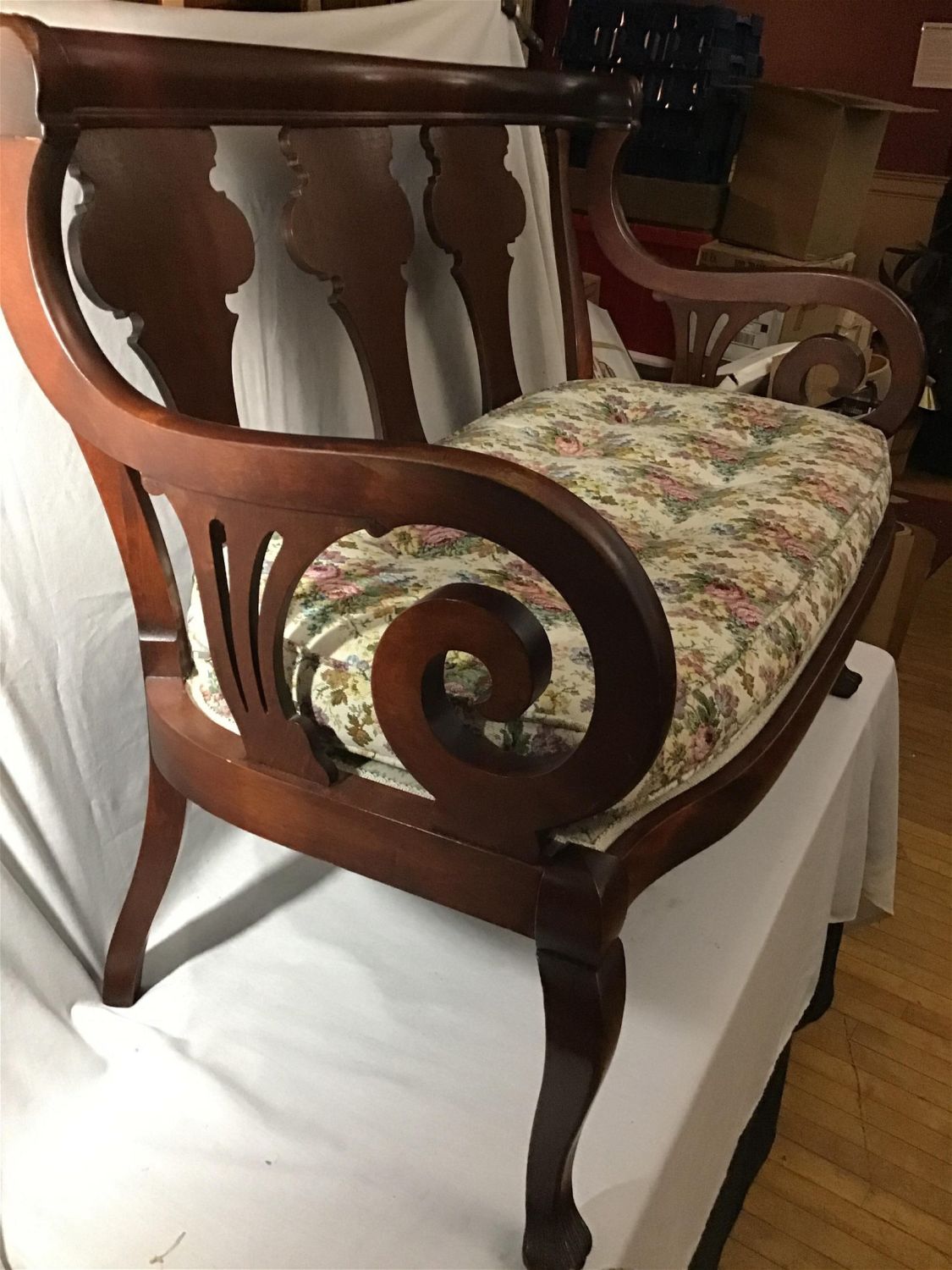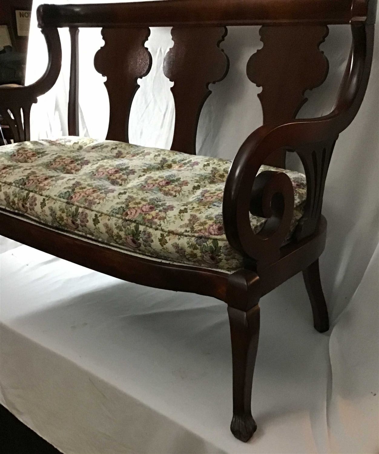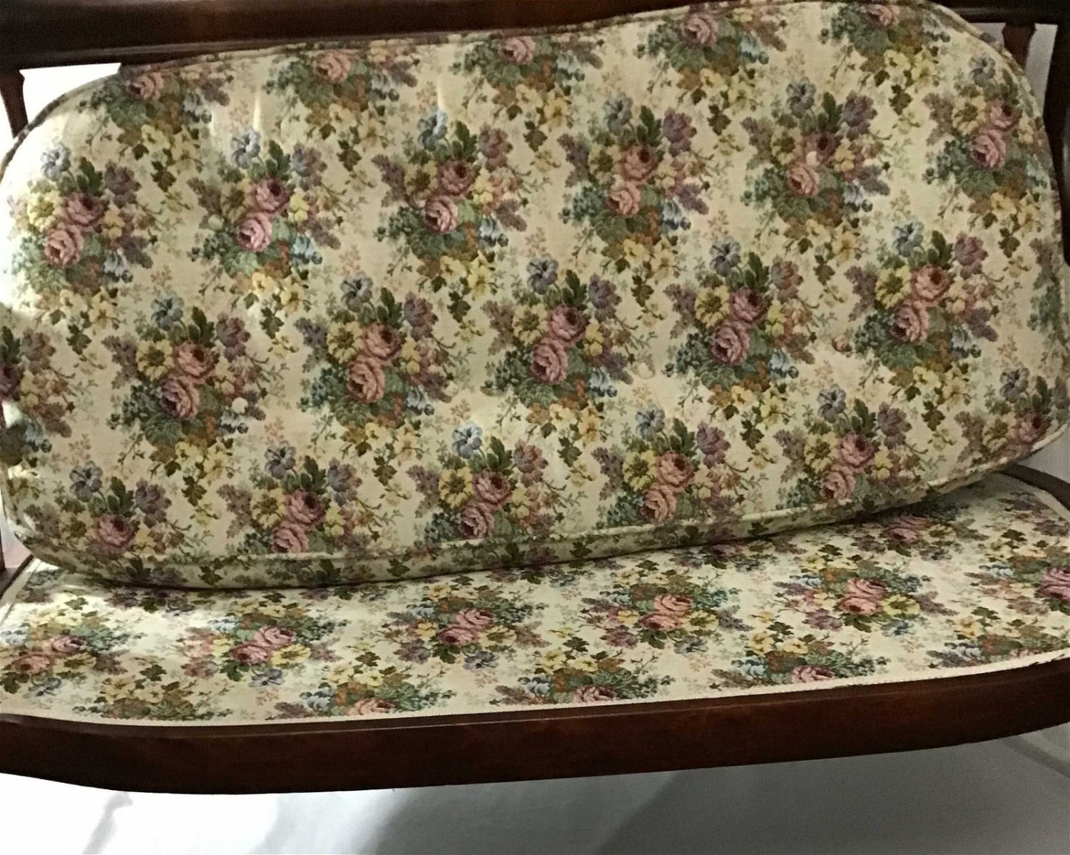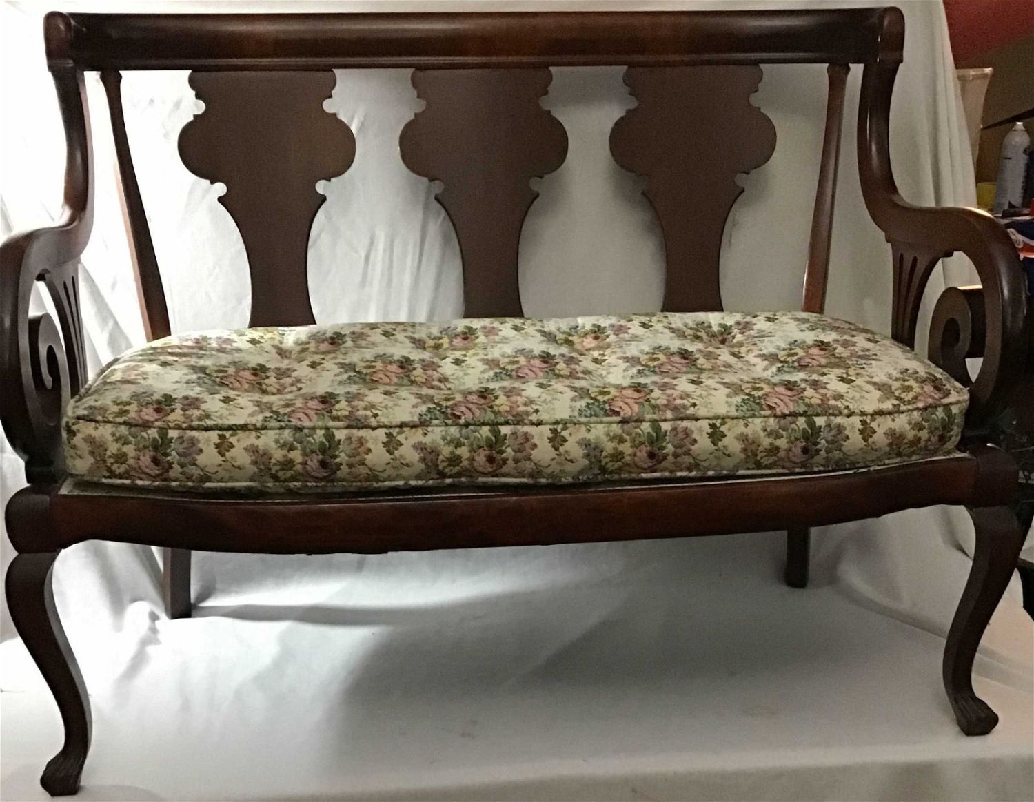 Vintage bench with floral pattern measures 33 to back of top 17 at the cushion 20 deep 43 wide