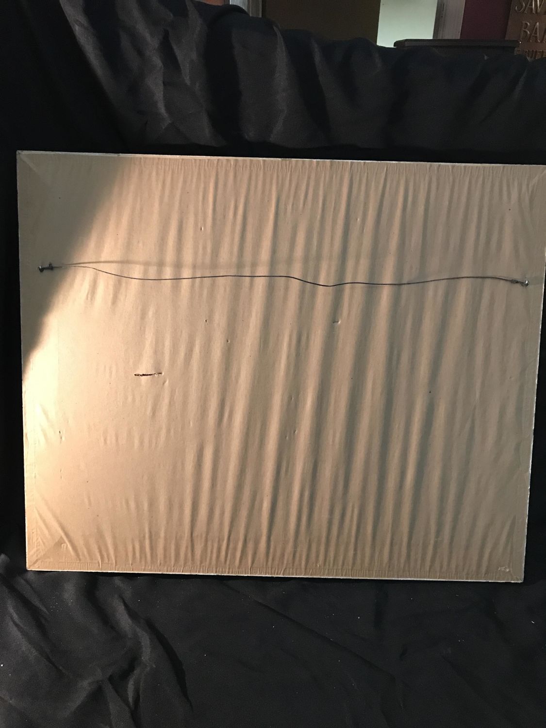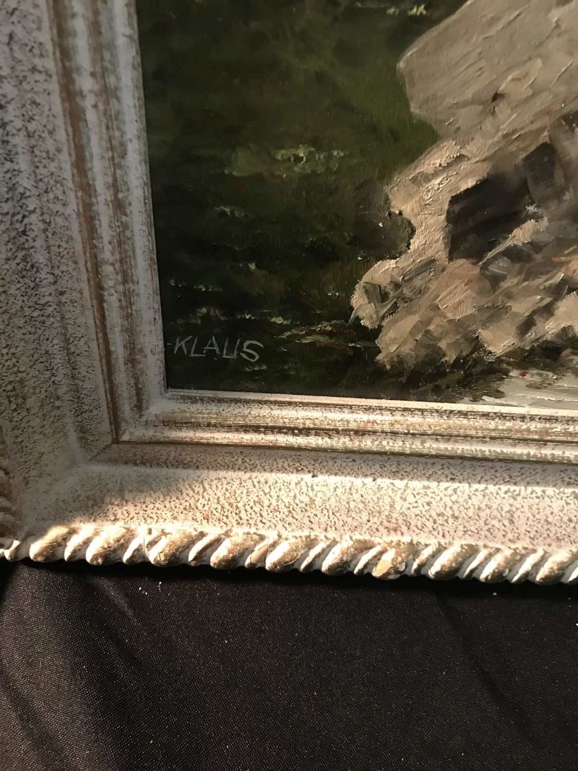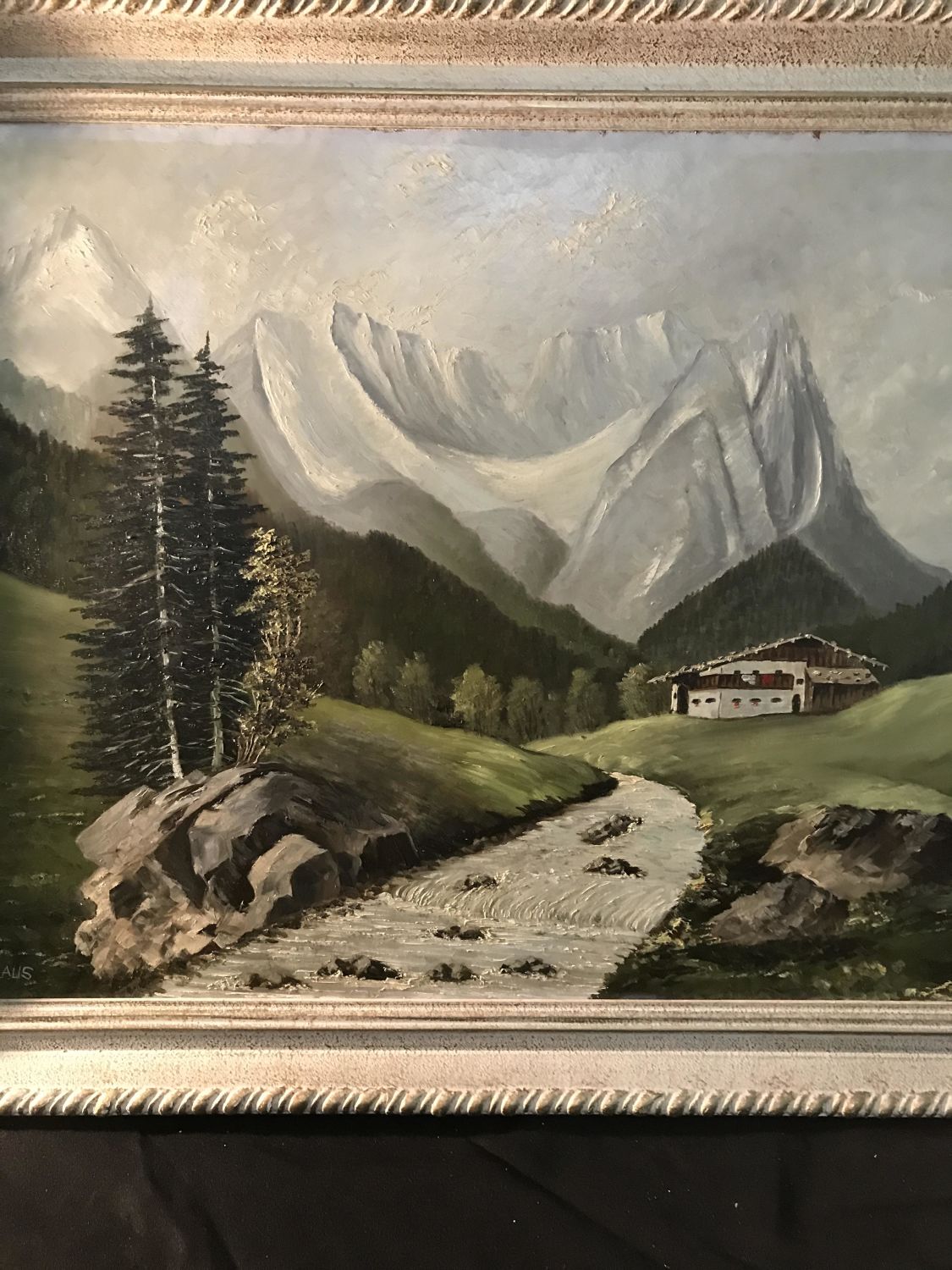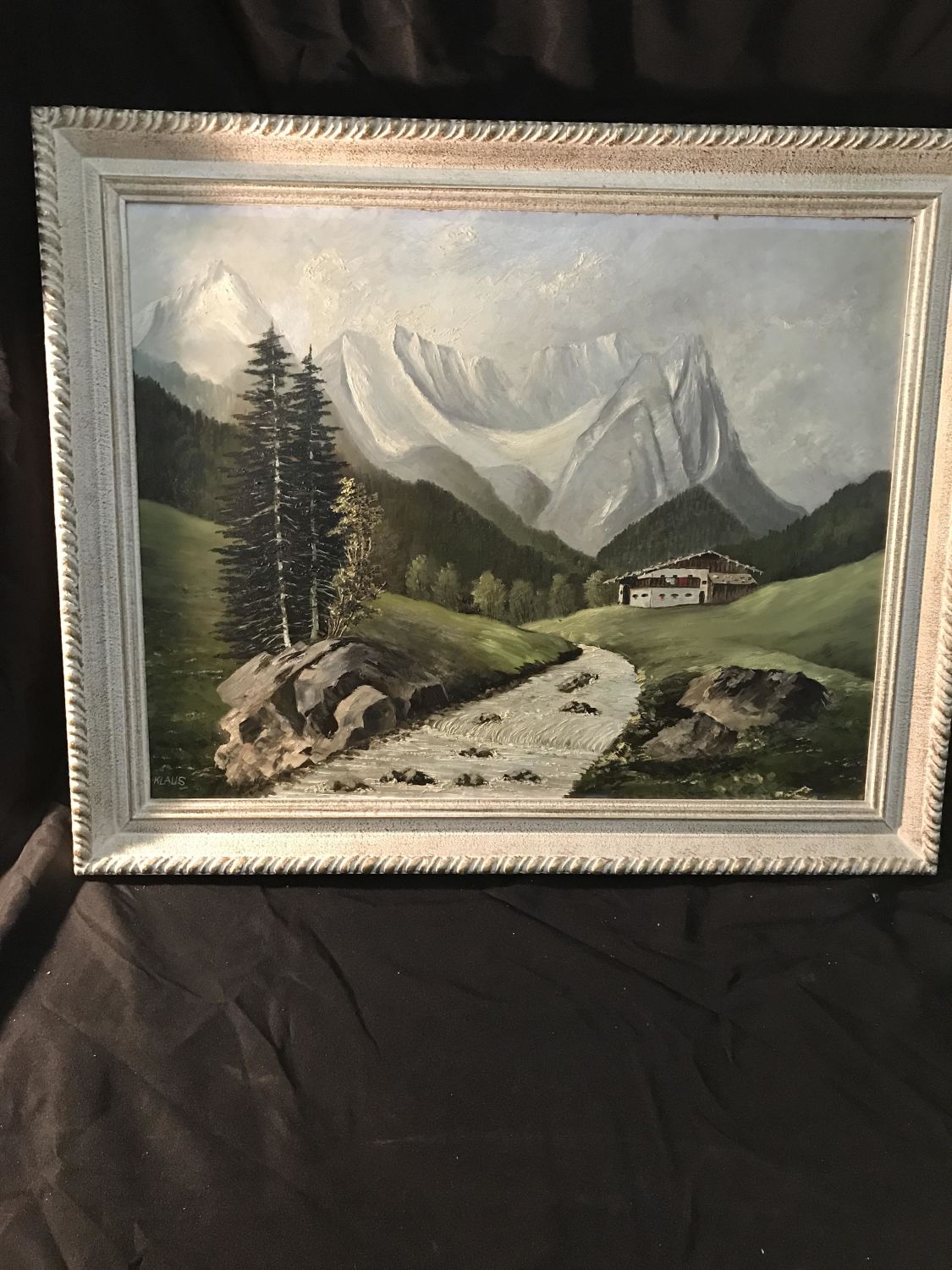 mountain view with a cabin and stream off-white wooden frame measuring 33 x 27 inches
