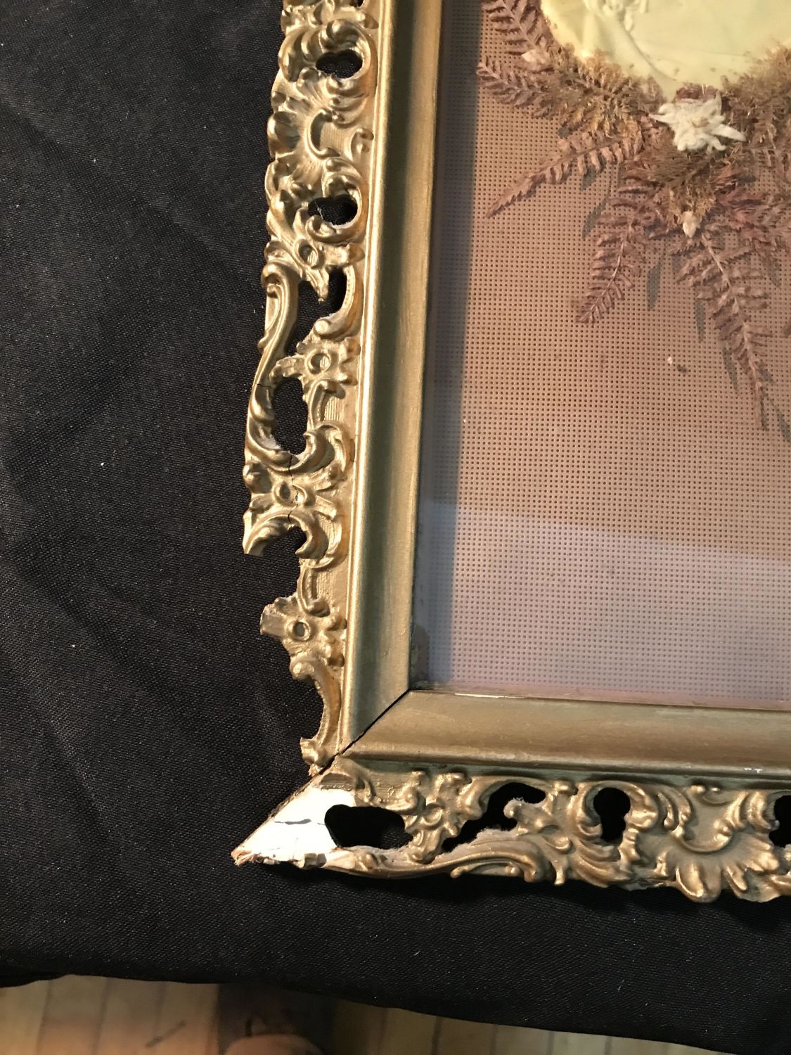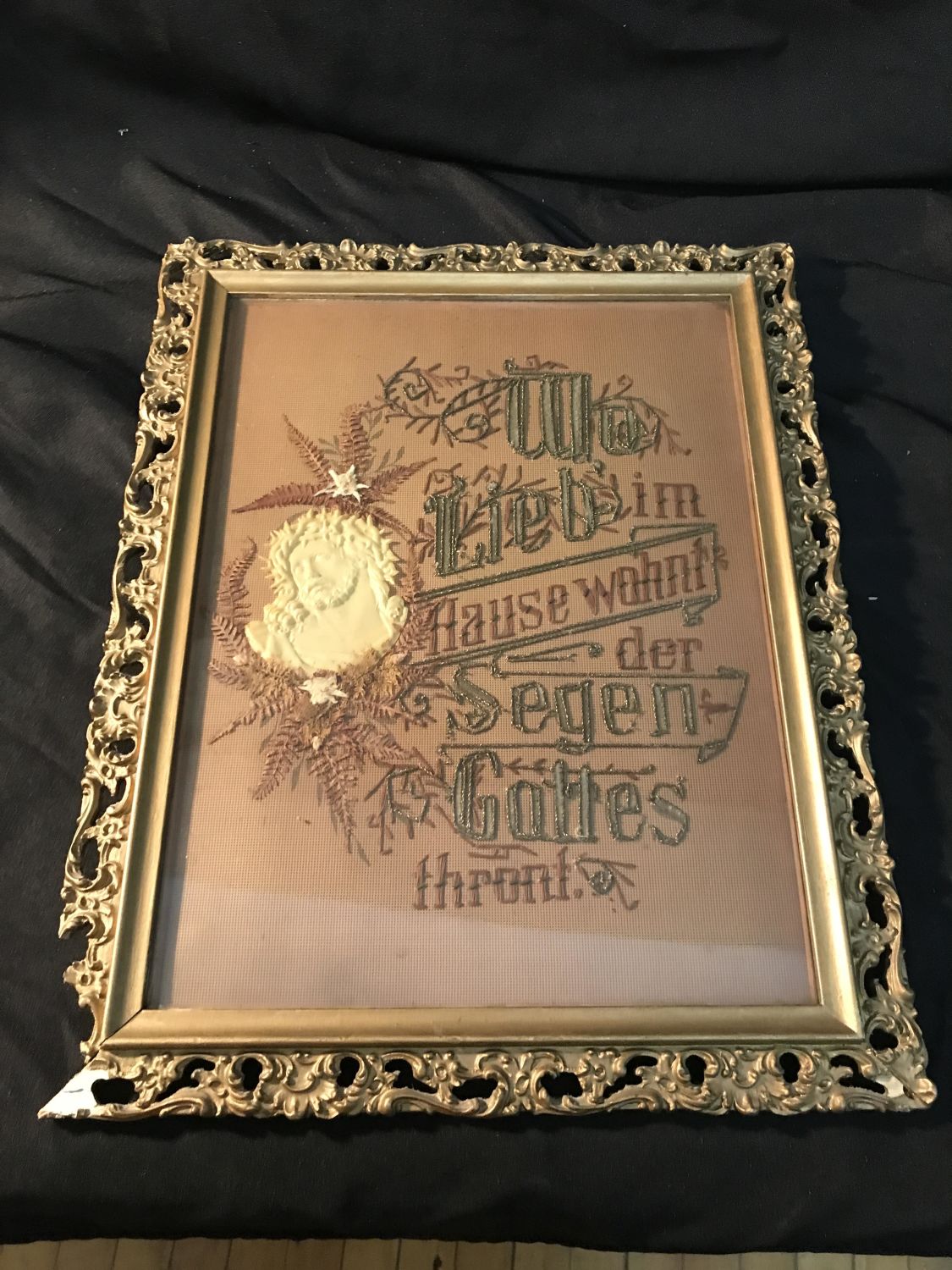 Lot 284: Victorian Filigree Gold Frame Embroidered Blessing