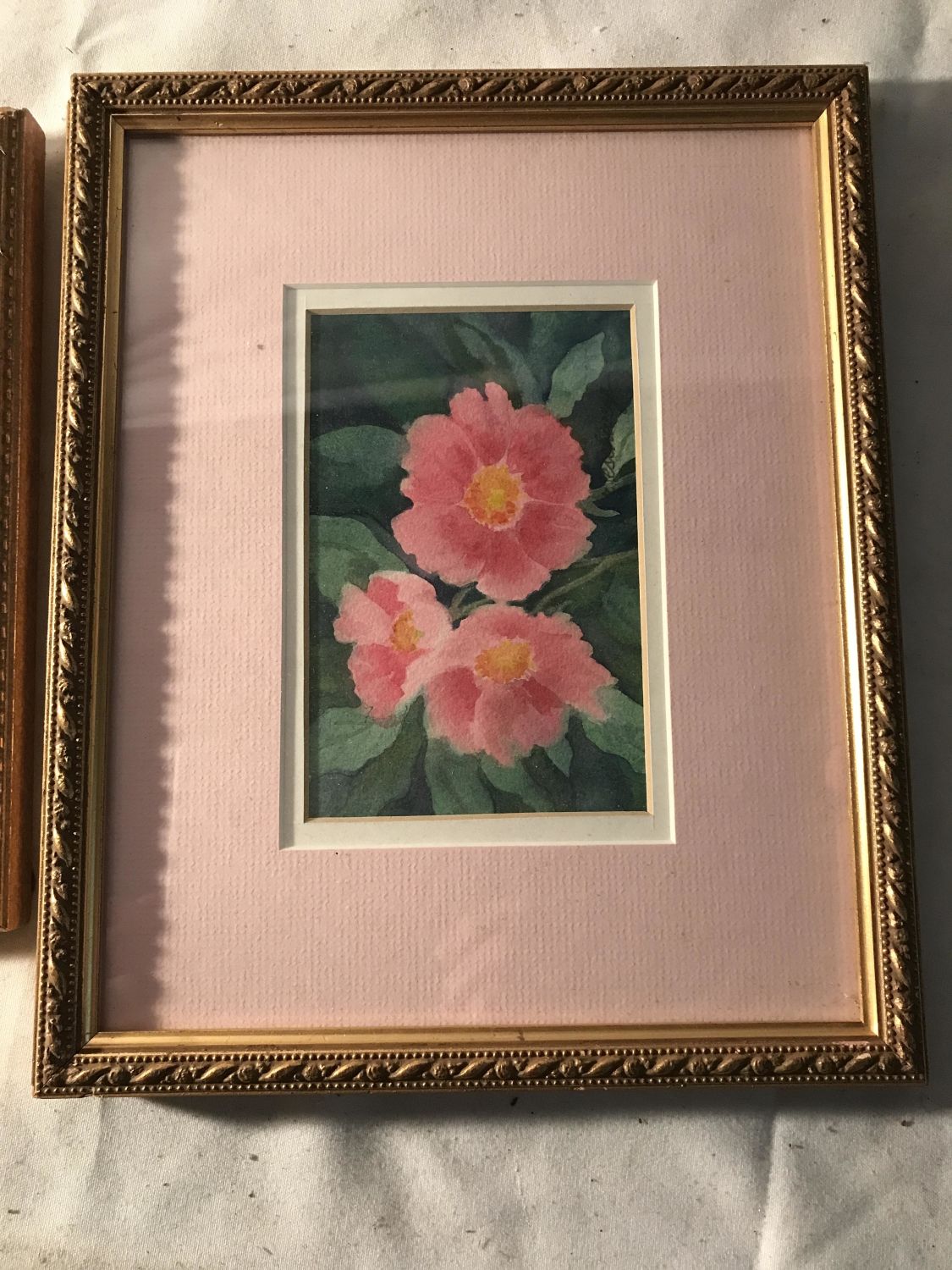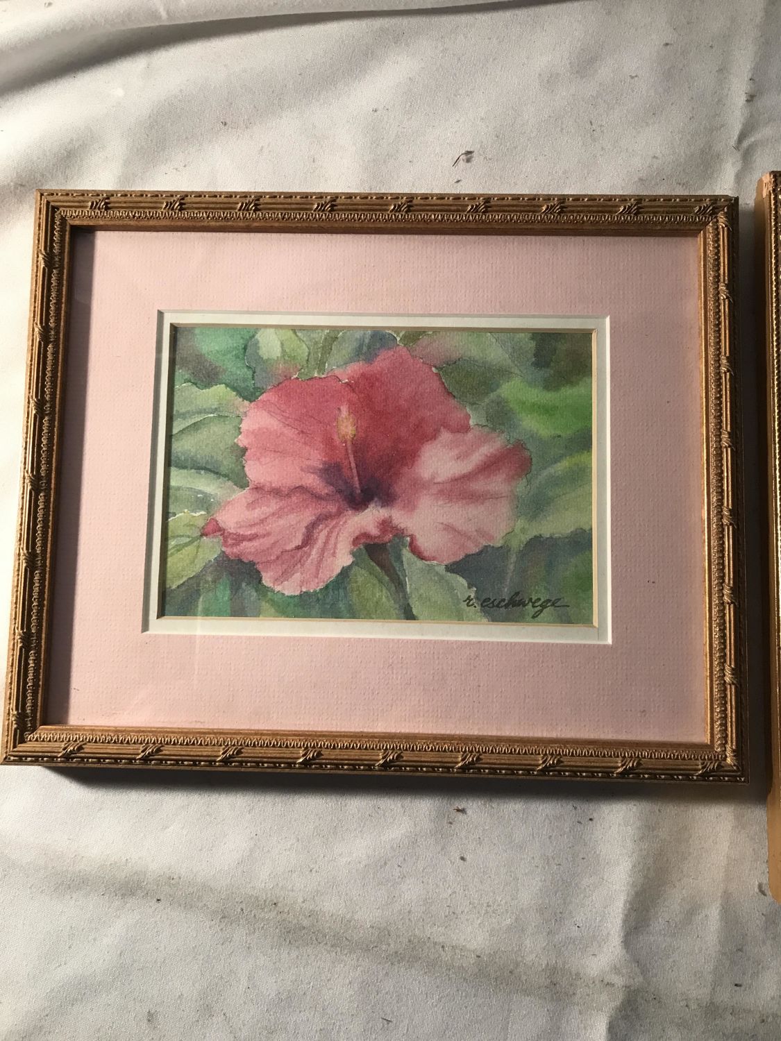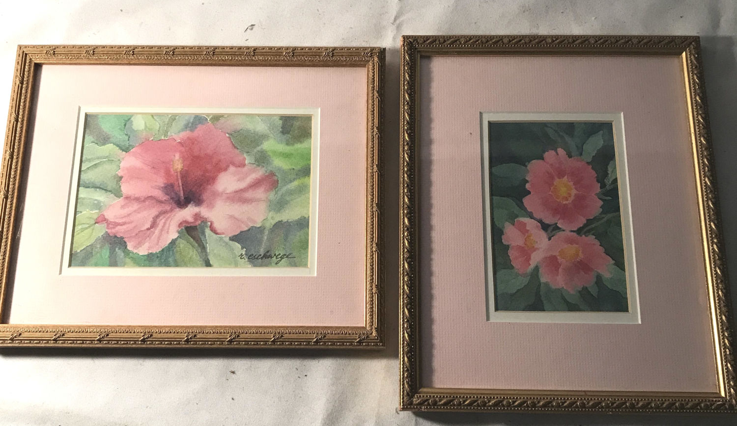 Each measuring 10 3/4 x 8 3/4 inches, both depicting pink flowers, one of which is a hibiscus