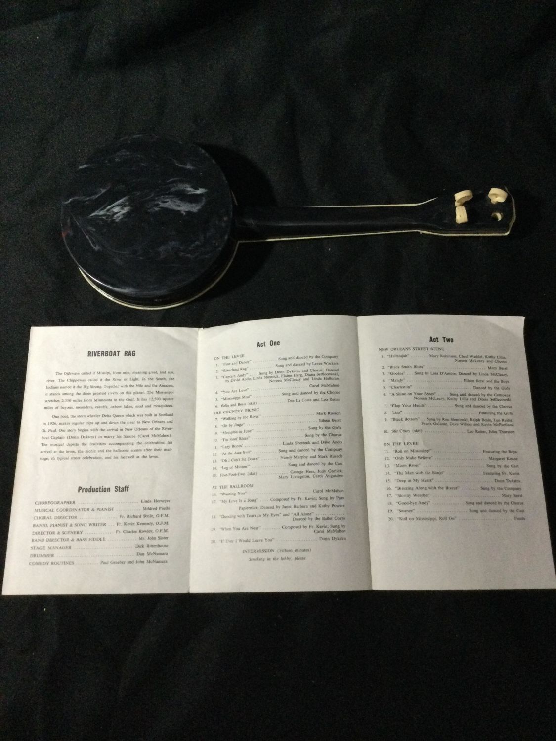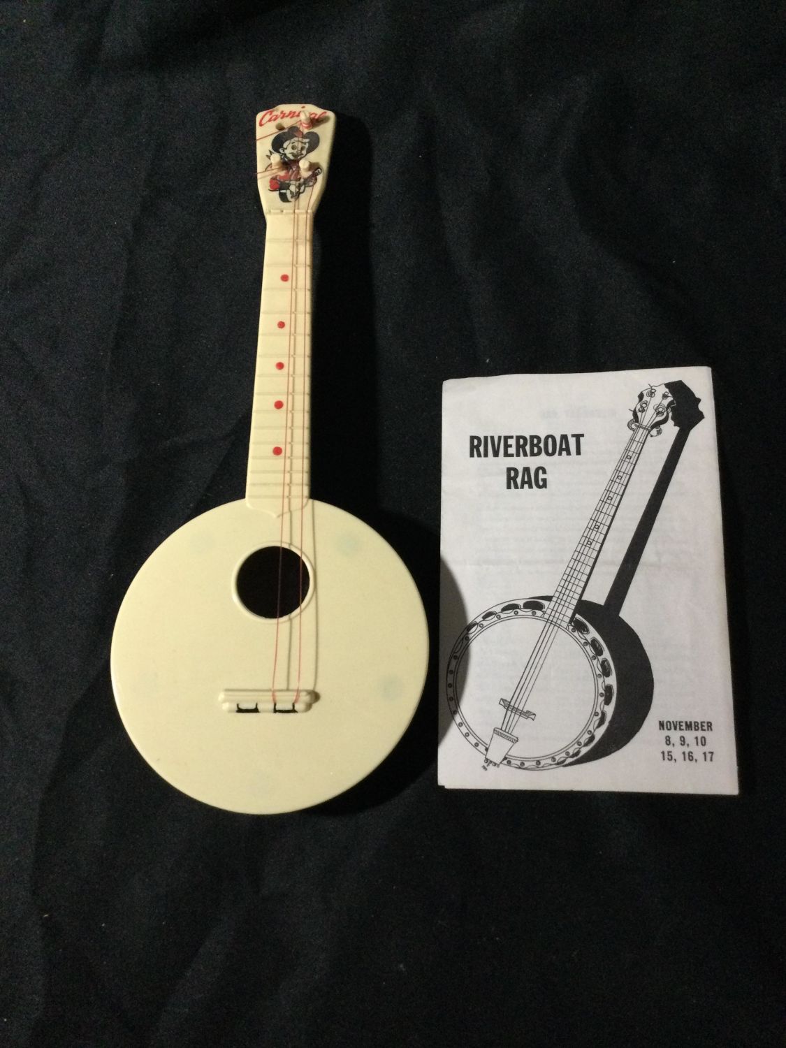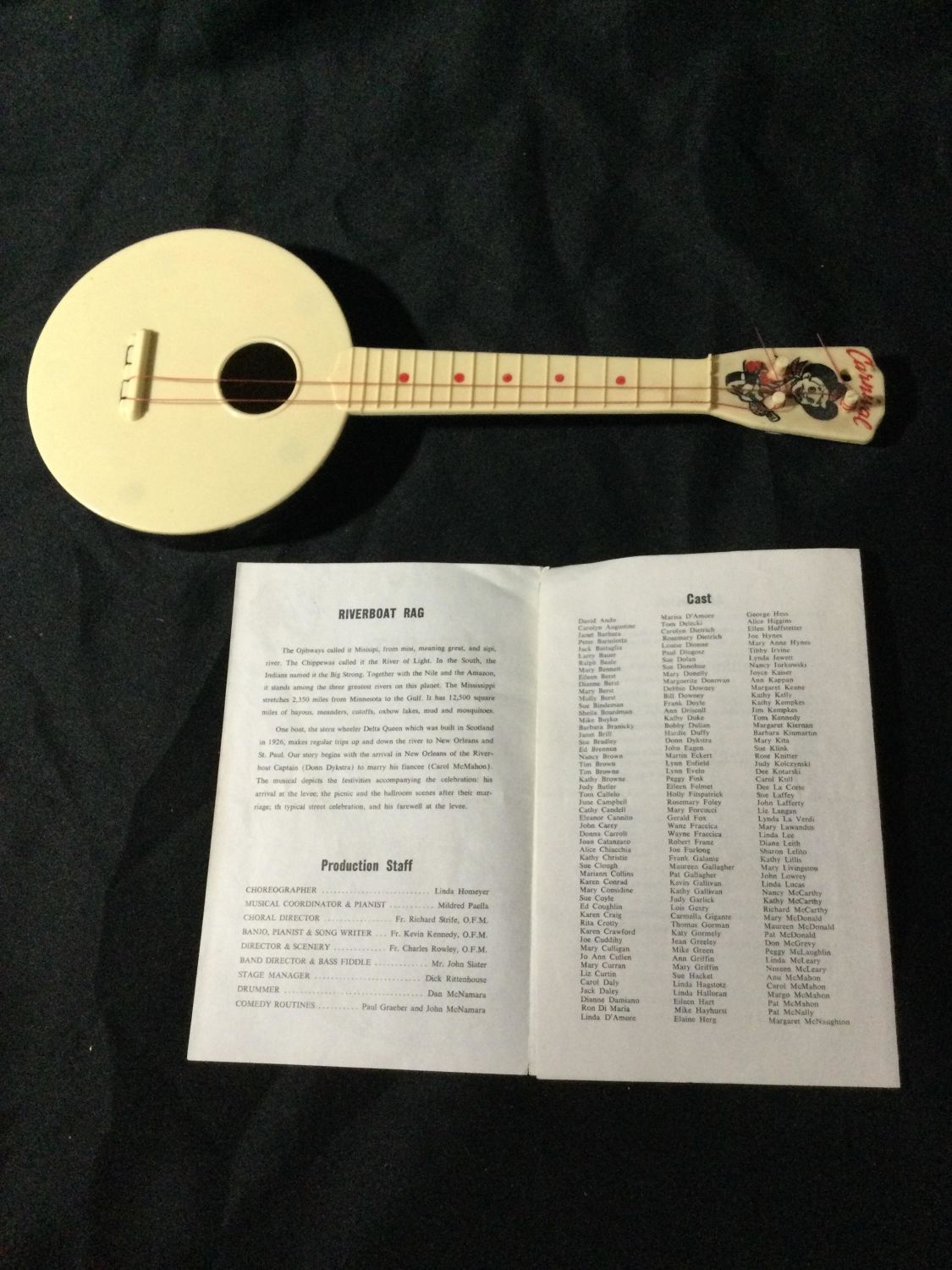 Play bill from river boat rag musical, banjo -2 strings made of plastic measures 15 1/2 inches