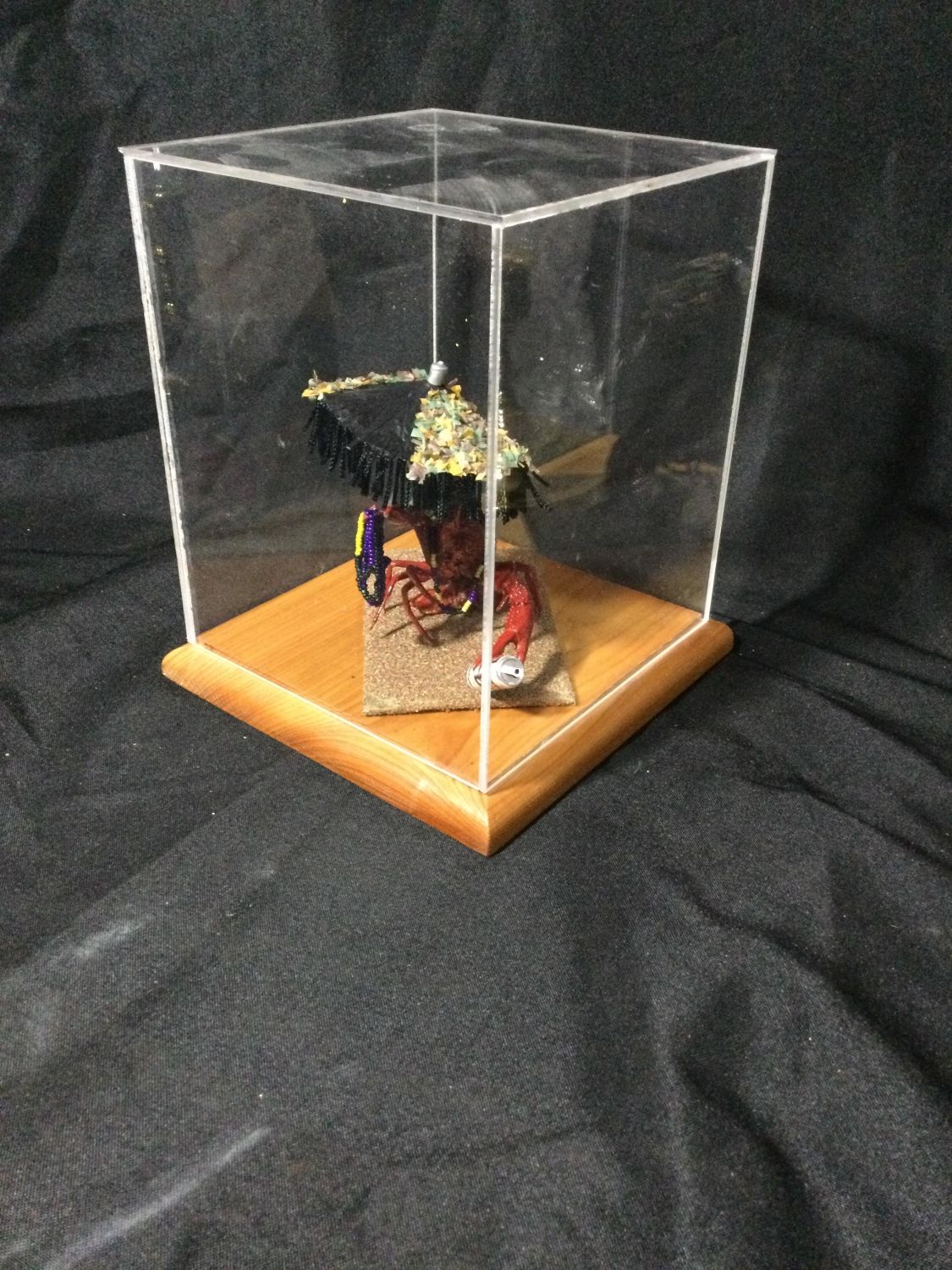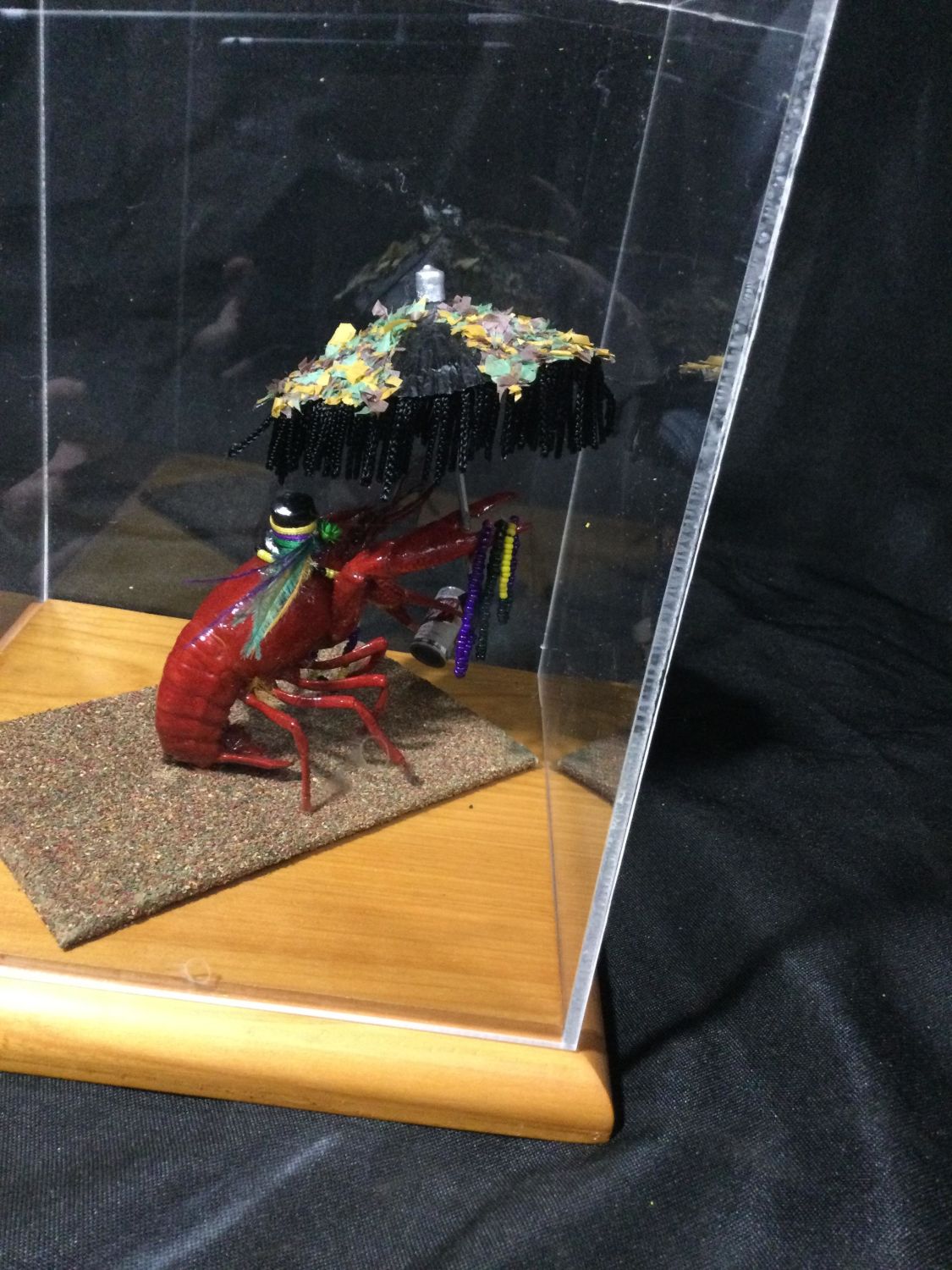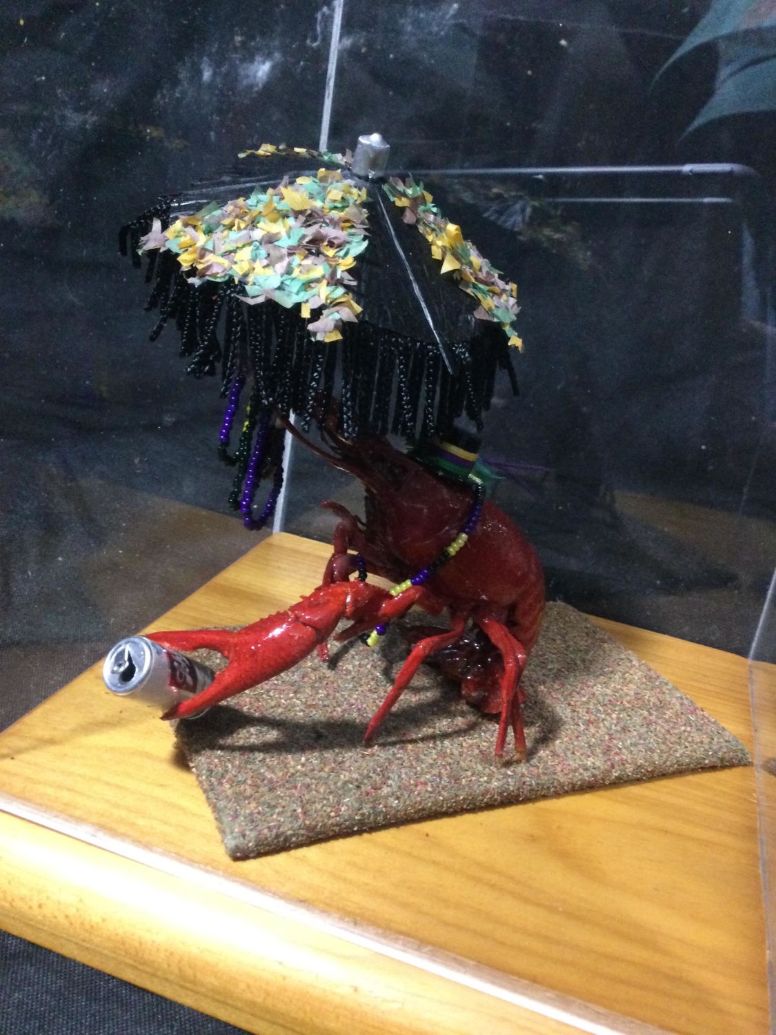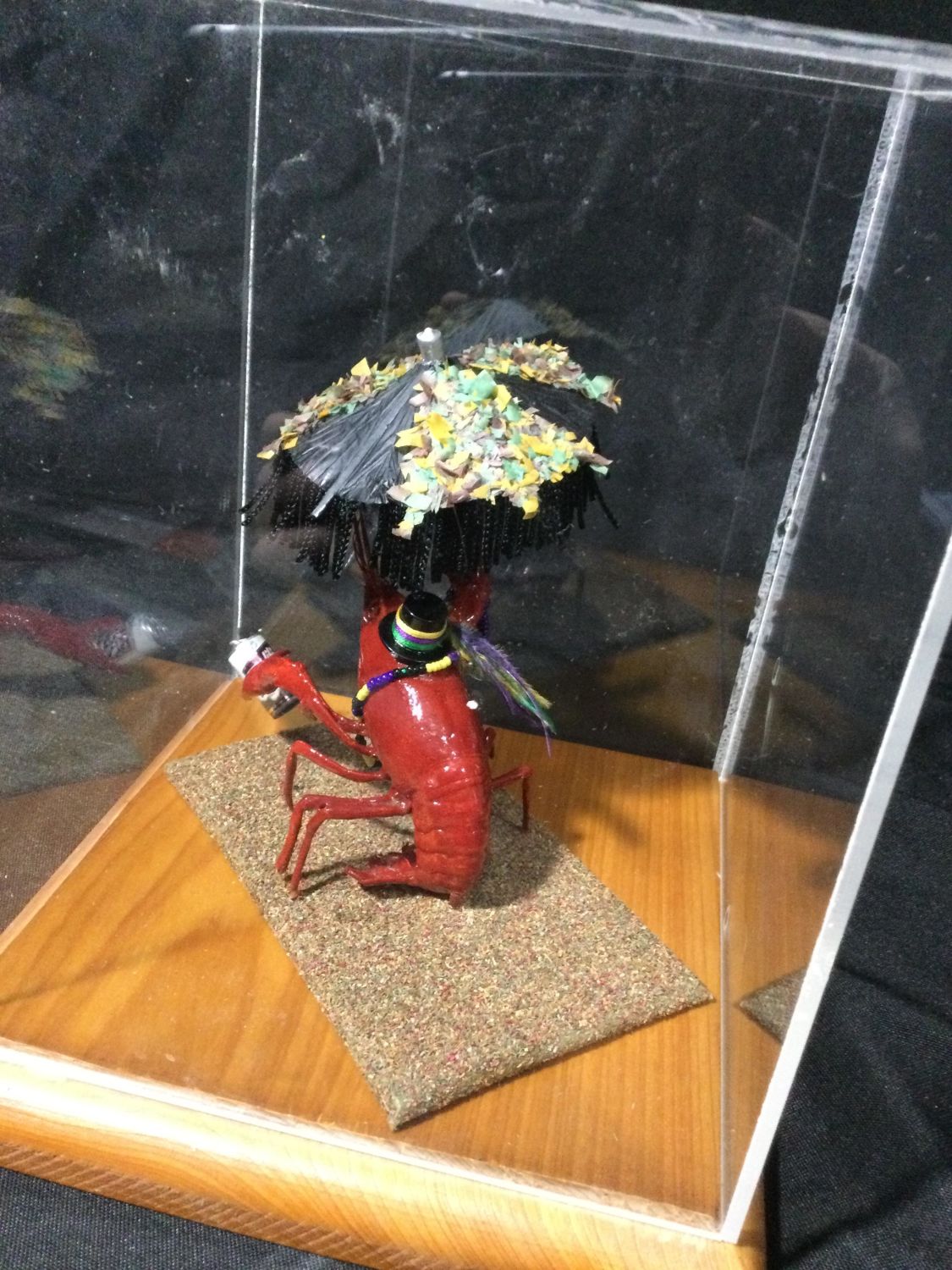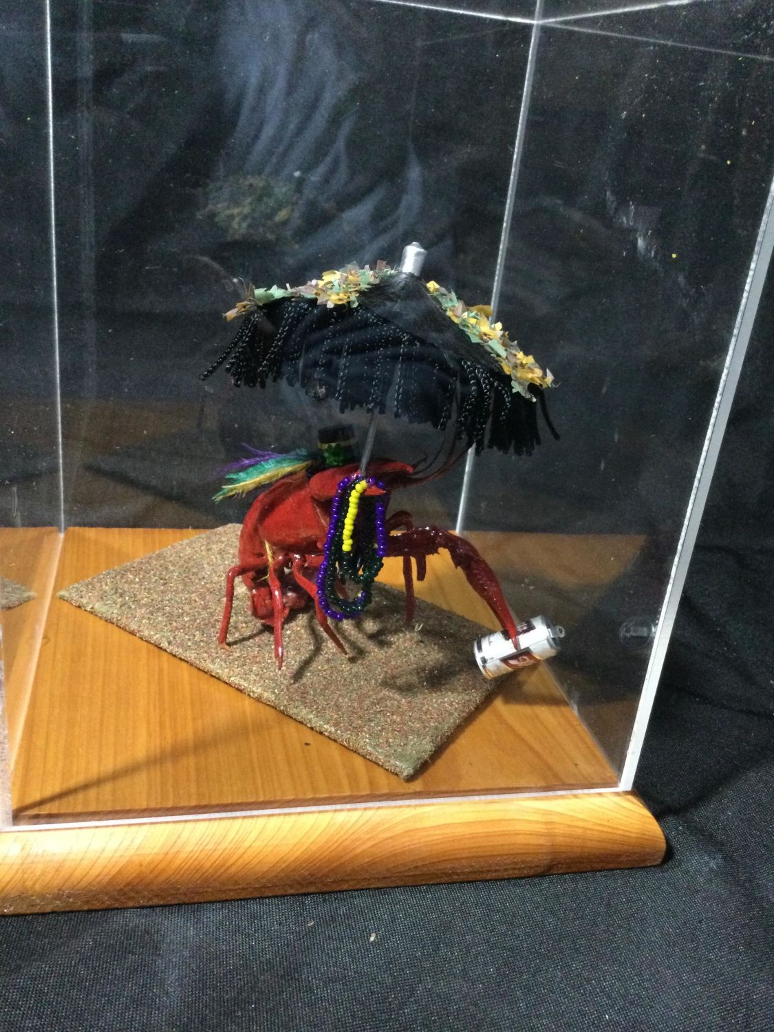plexiglass case crawdad has his beads, beer can and umbrella, ready to celebrate, display measures 9 x 6 1/2 inches