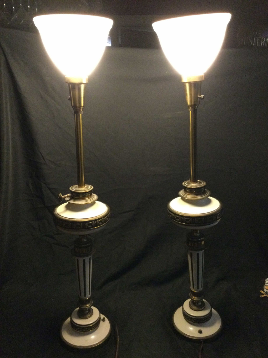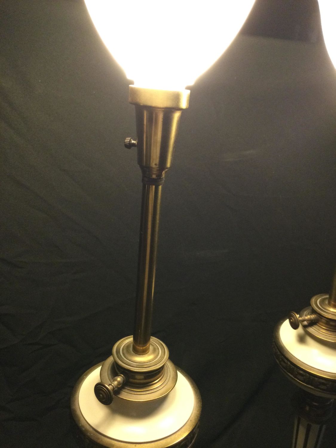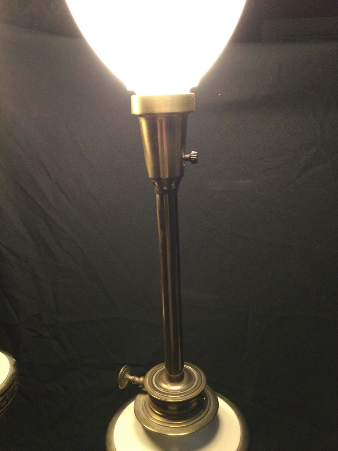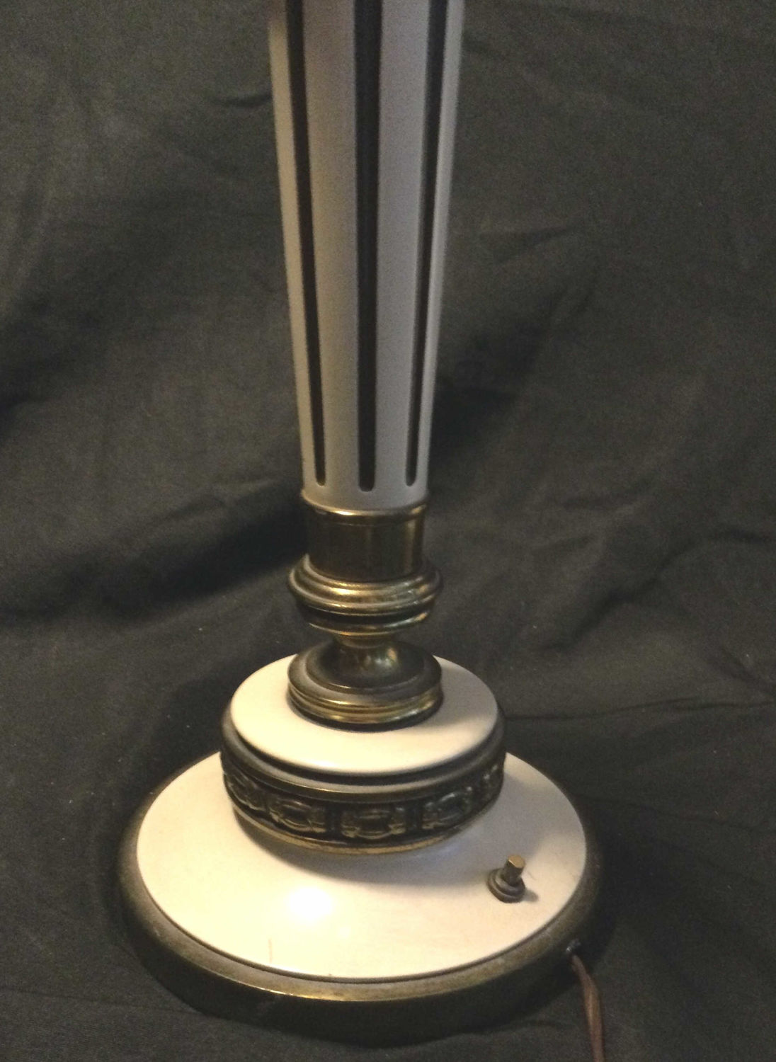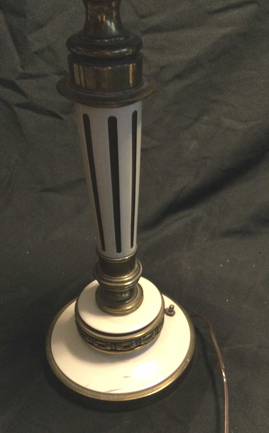 brass lamps switch a top and at bottom ,glass shade at top ,measurements 38 1/2 inches from bottom to top of shade,work great.