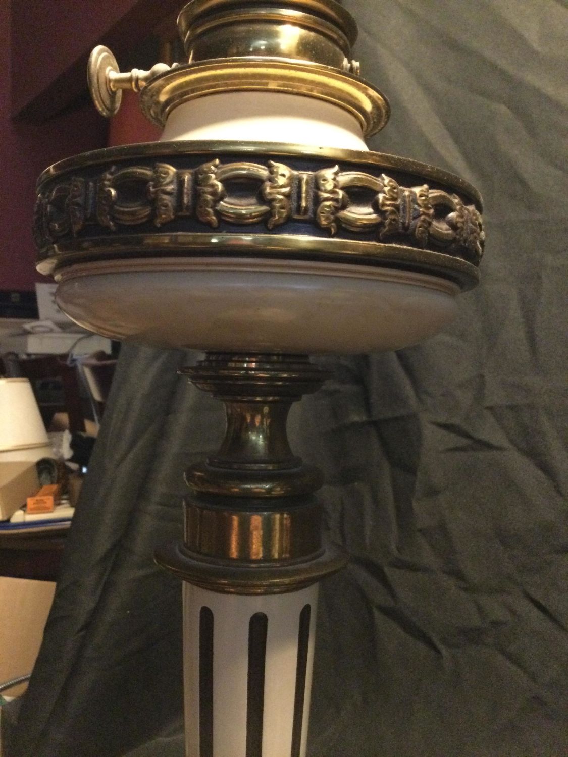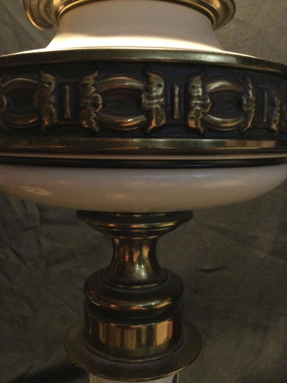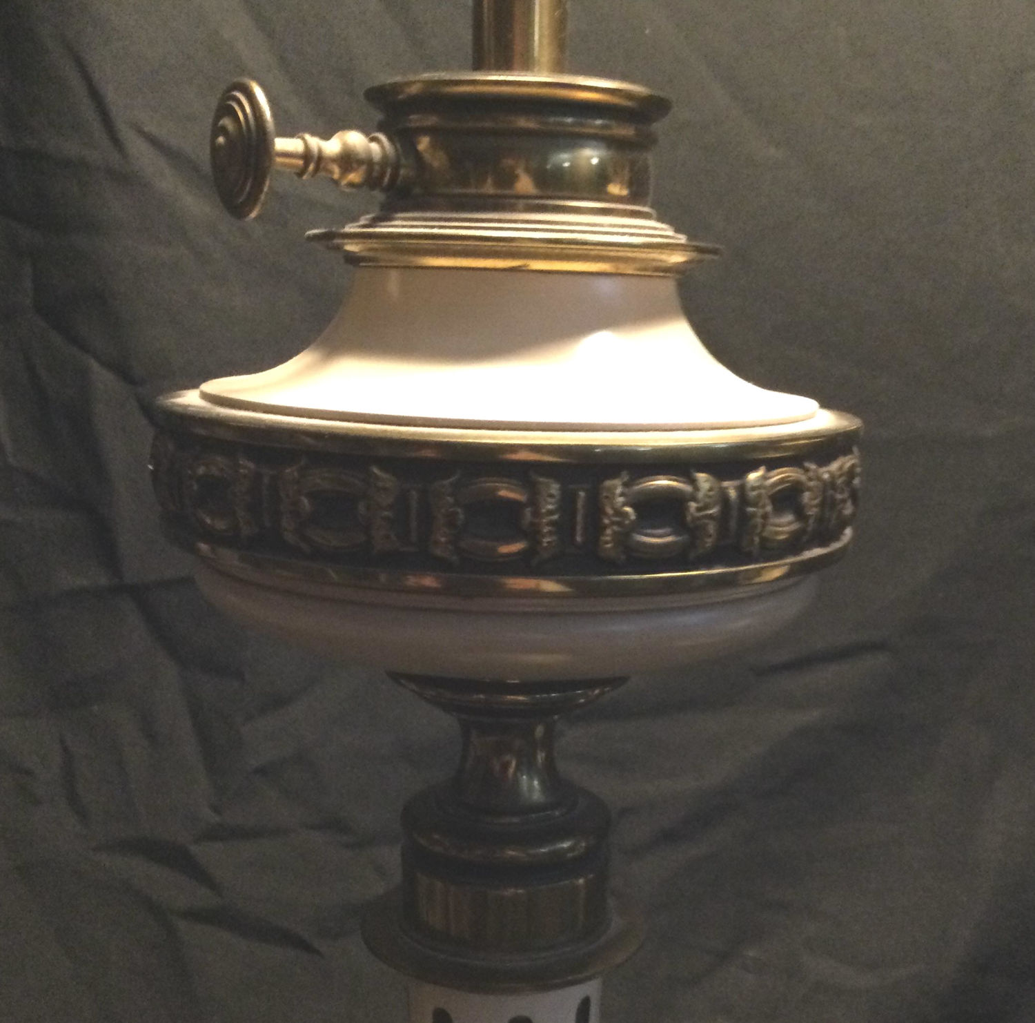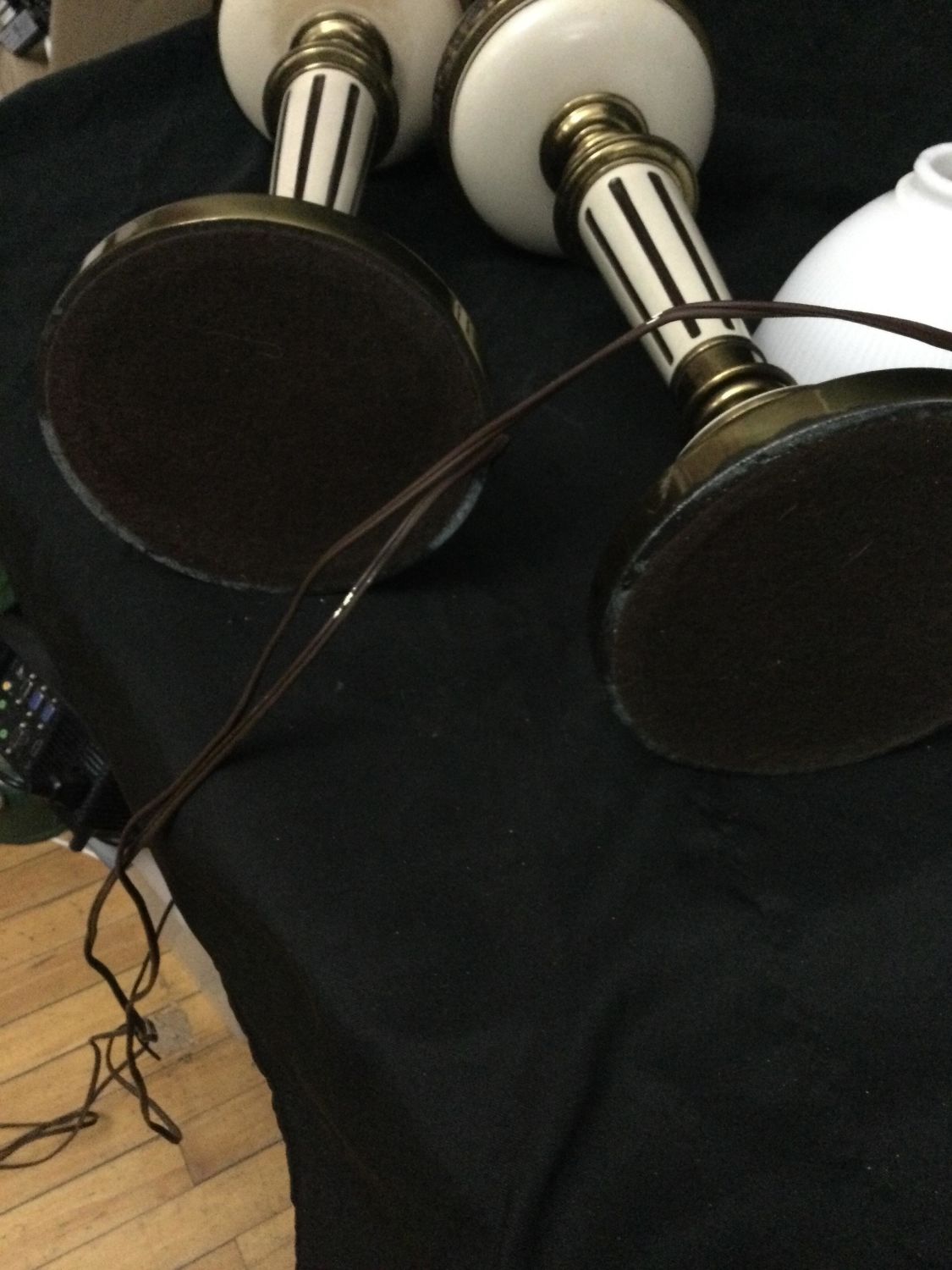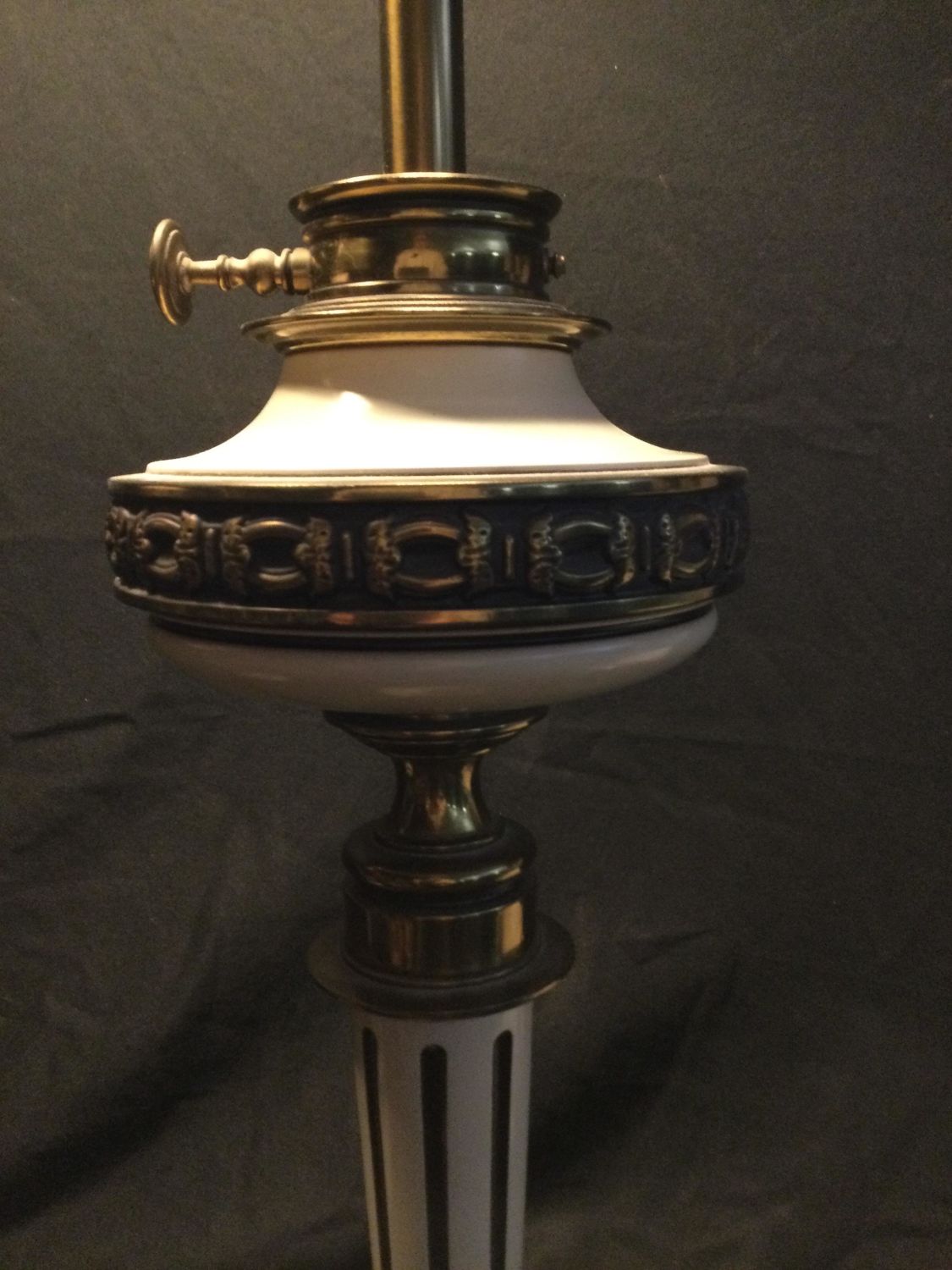 brass lamps switch a top and at bottom ,glass shade at top ,measurements 38 1/2 inches from bottom to top of shade,work great.