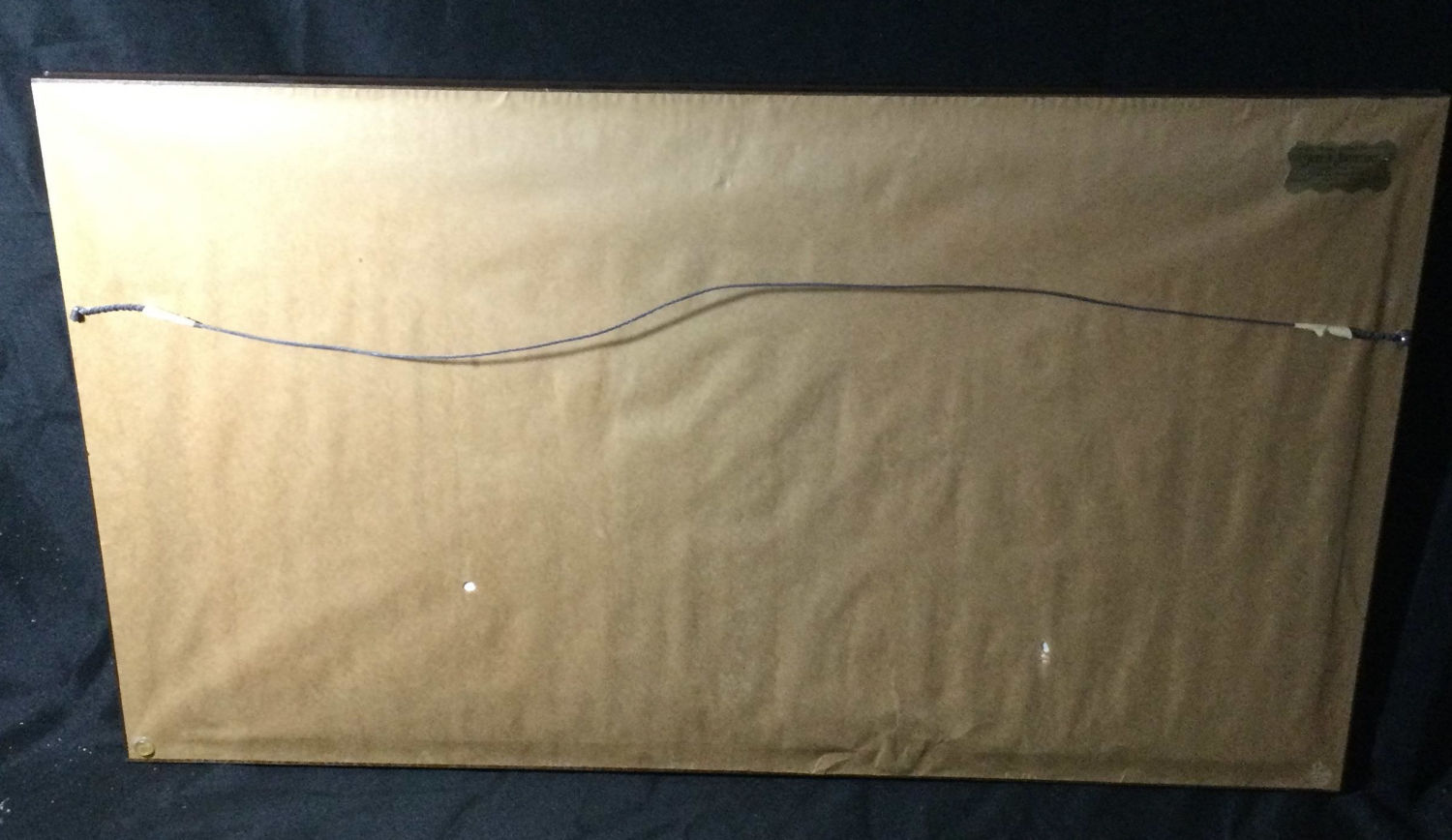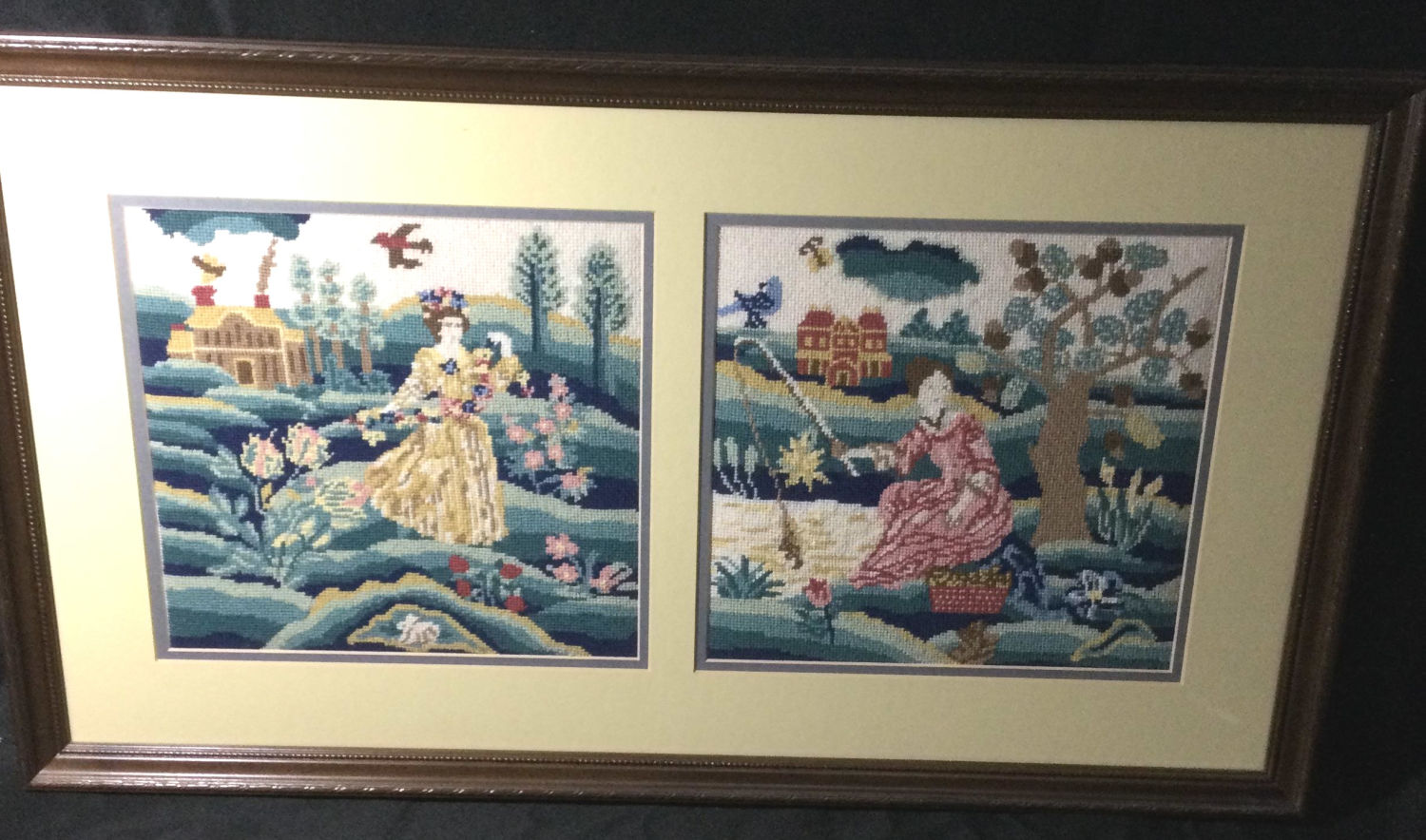 First scene is of a woman collecting flowers the other is of a woman fishing. Wooden frame and glass measures 28 x 16 inches