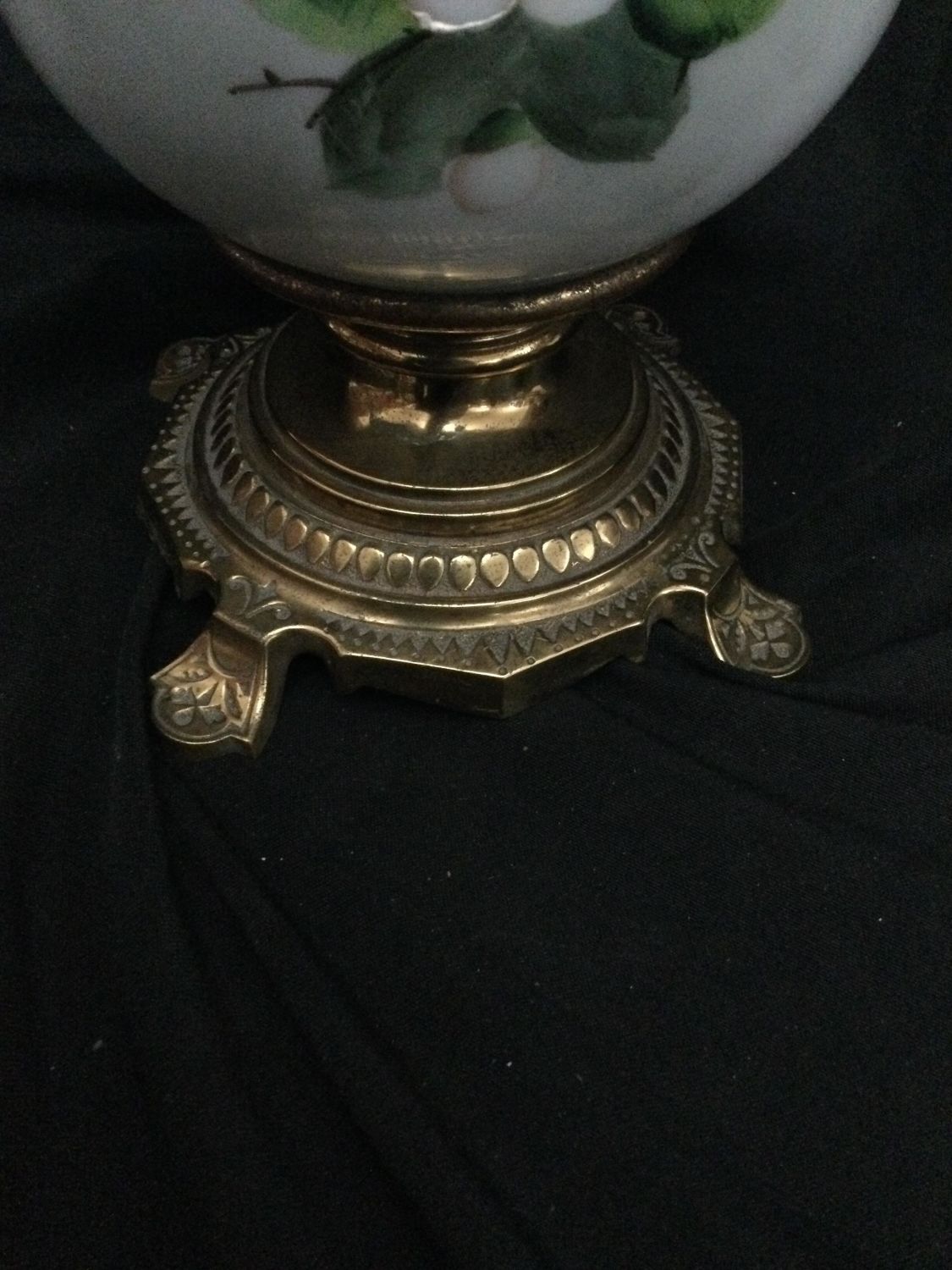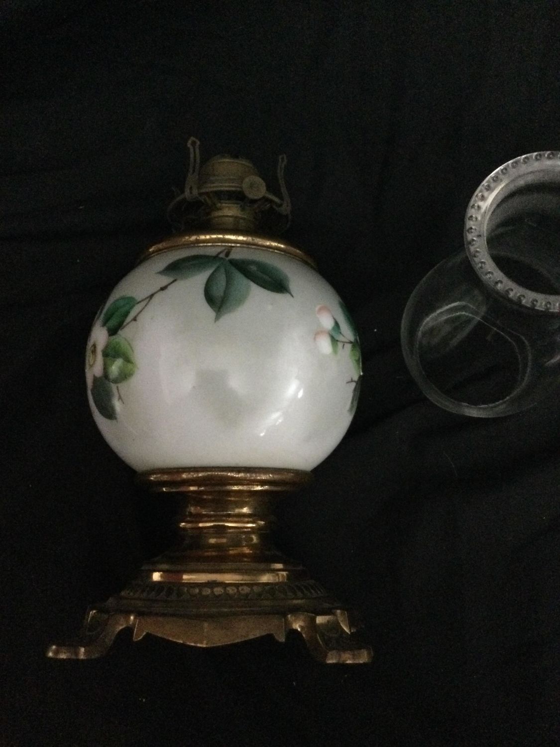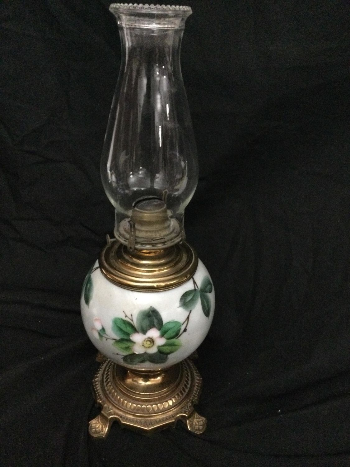 Lot 184: Vintage Hand Painted Brass and Glass Oil Lamp