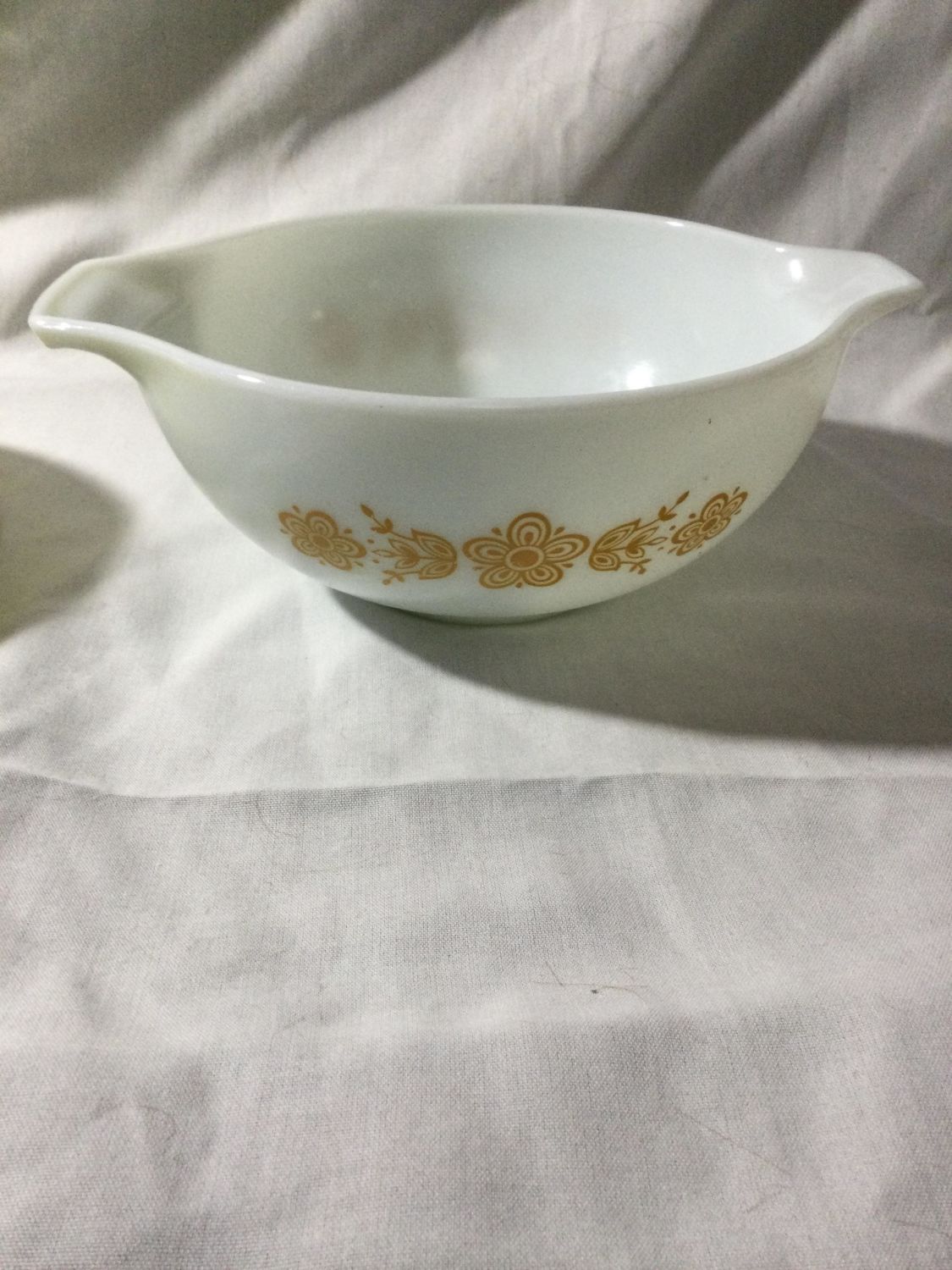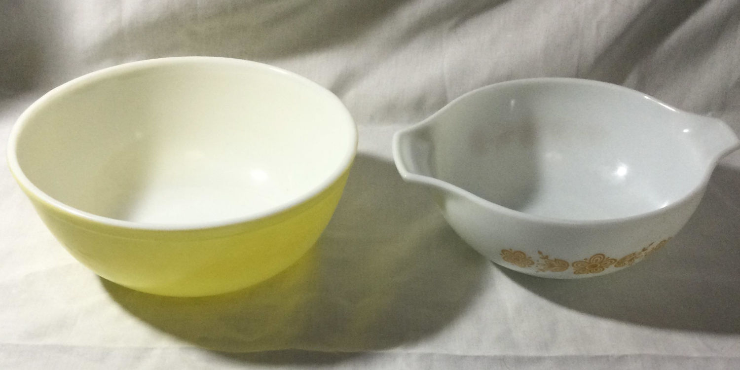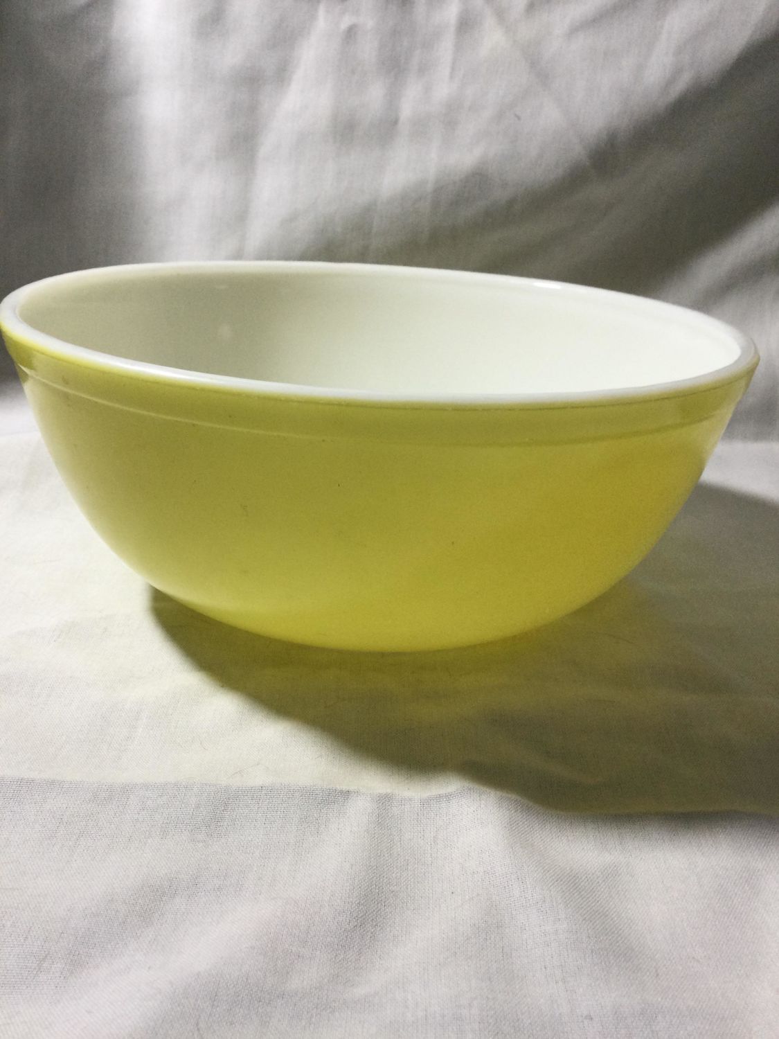 One Mixing Bowl & one serving yellow measures 4 1/2 inches high and 10 1/2 inches across ,print serving bowl measures four inches high And 10 and three-quarter inches across