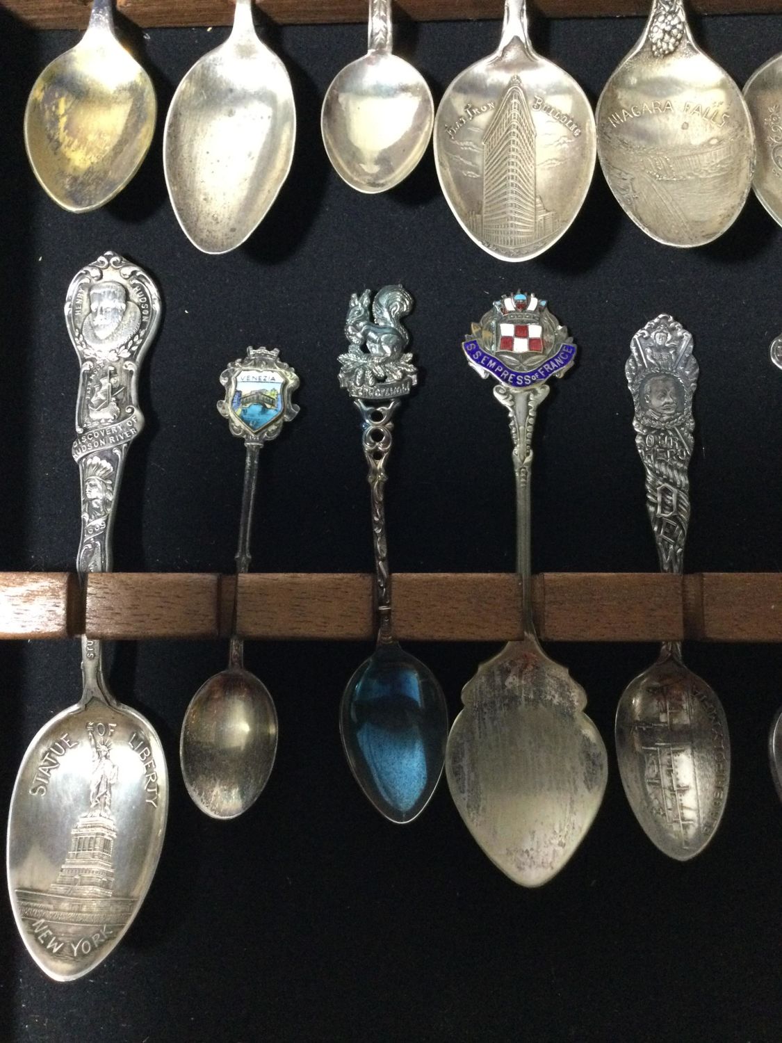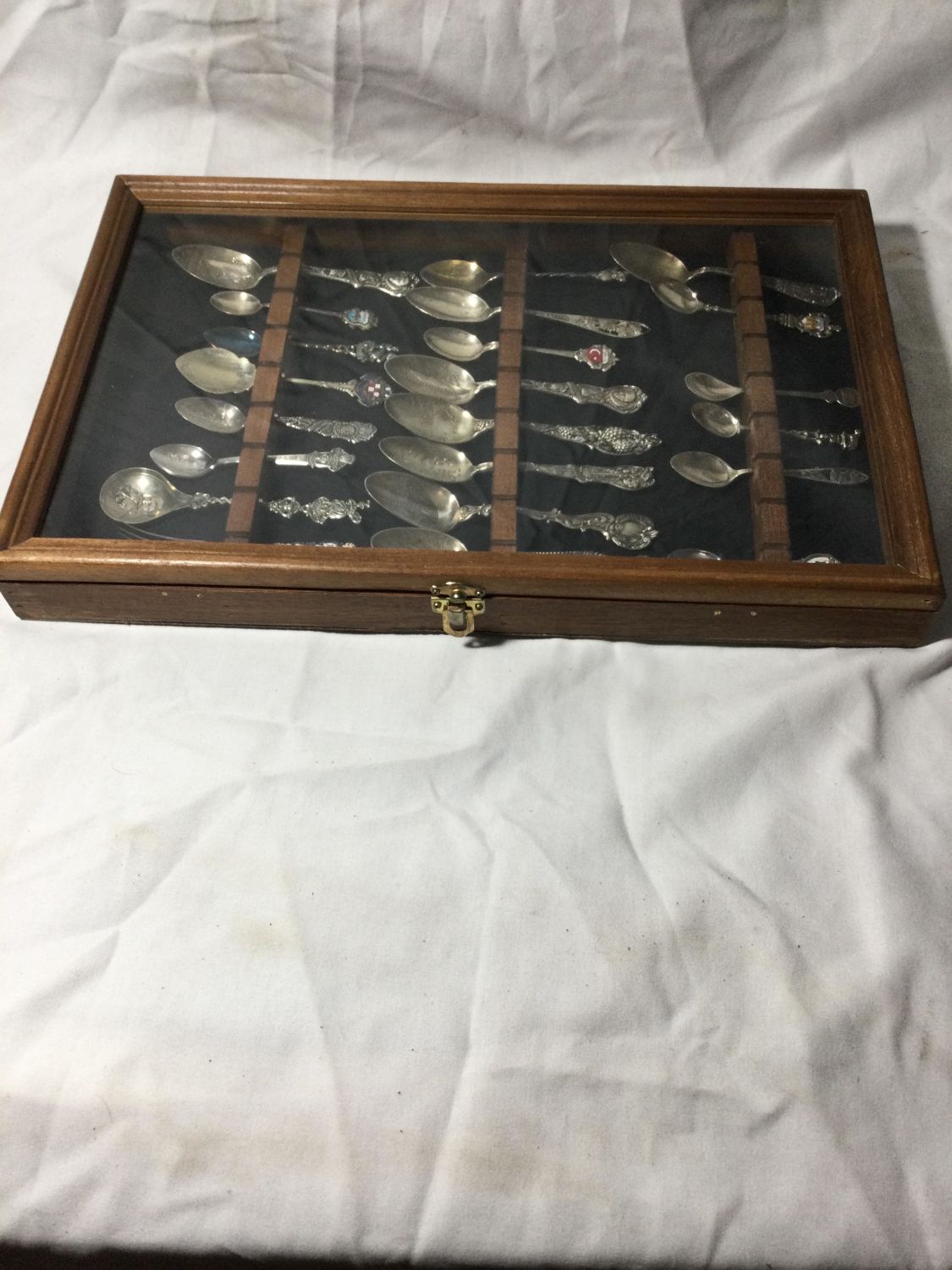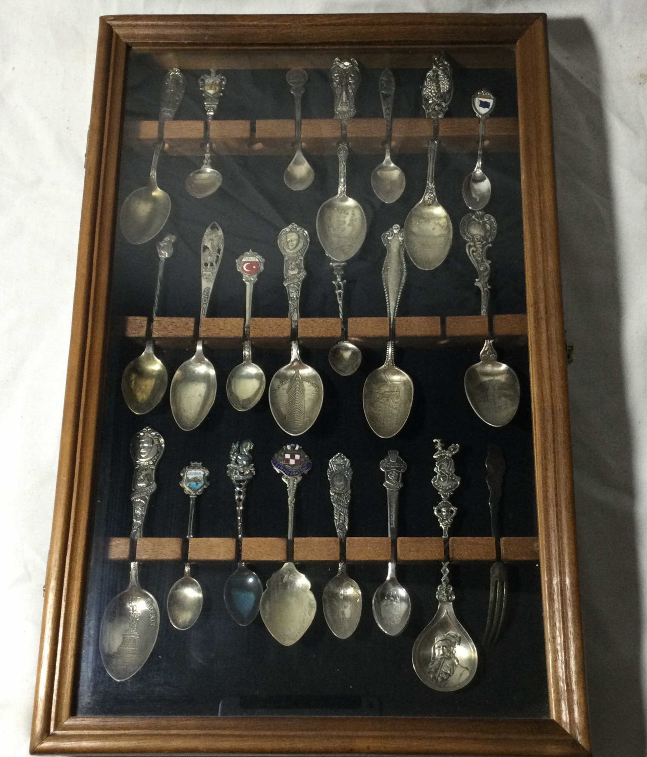 wooden case with glass measures 17 1/2 x 11 can be wall hung Set includes 21 spoons one fork