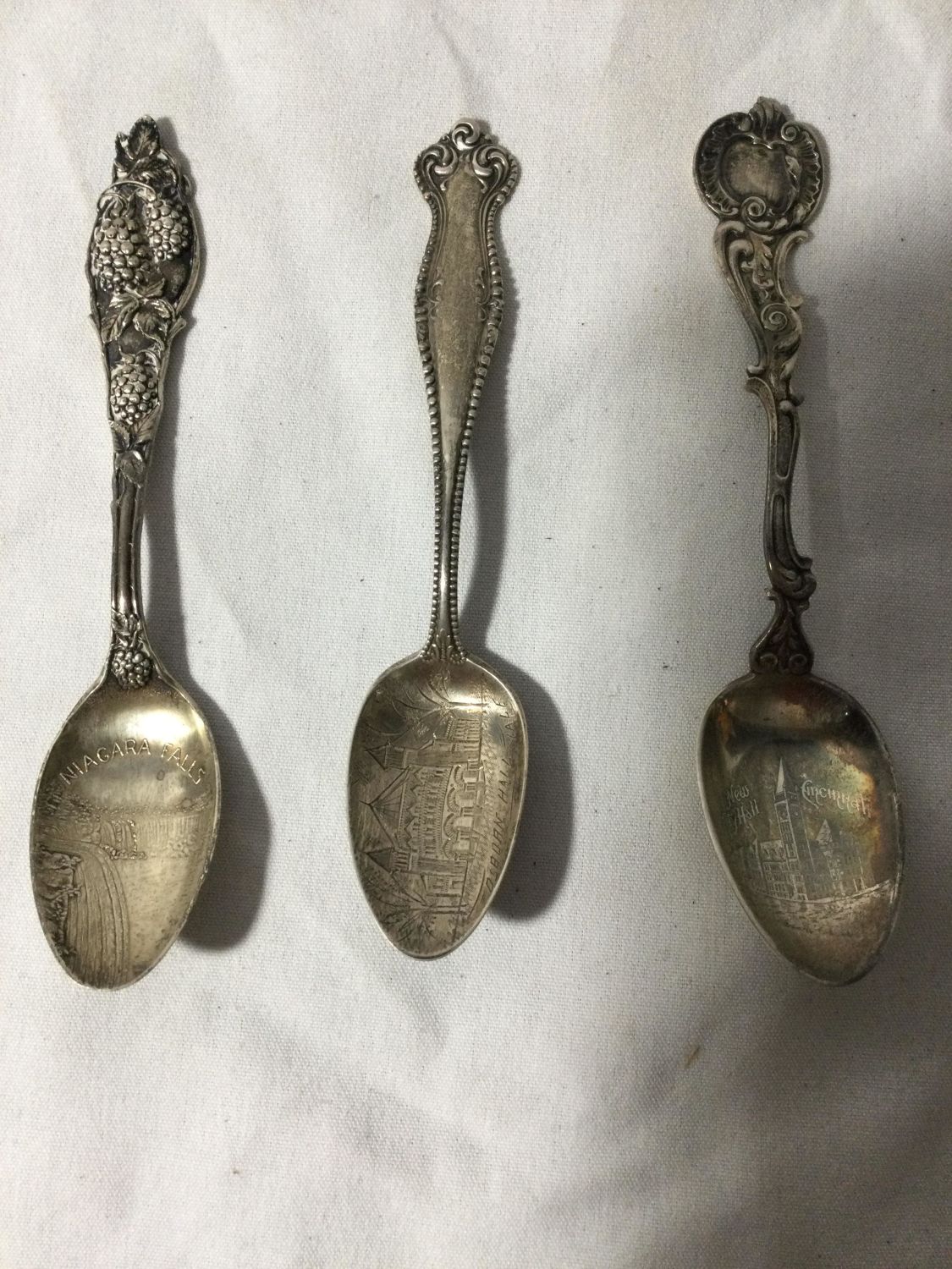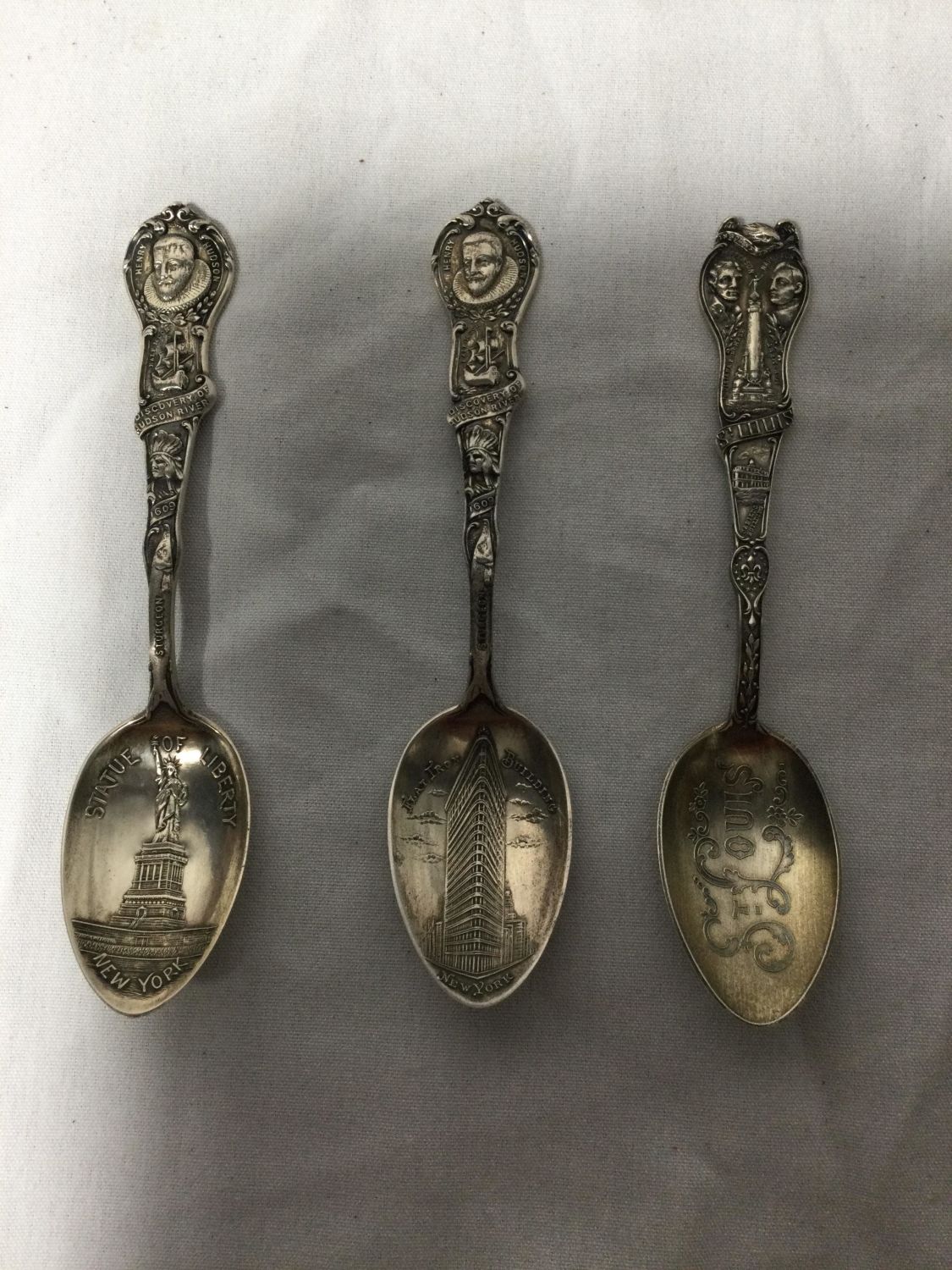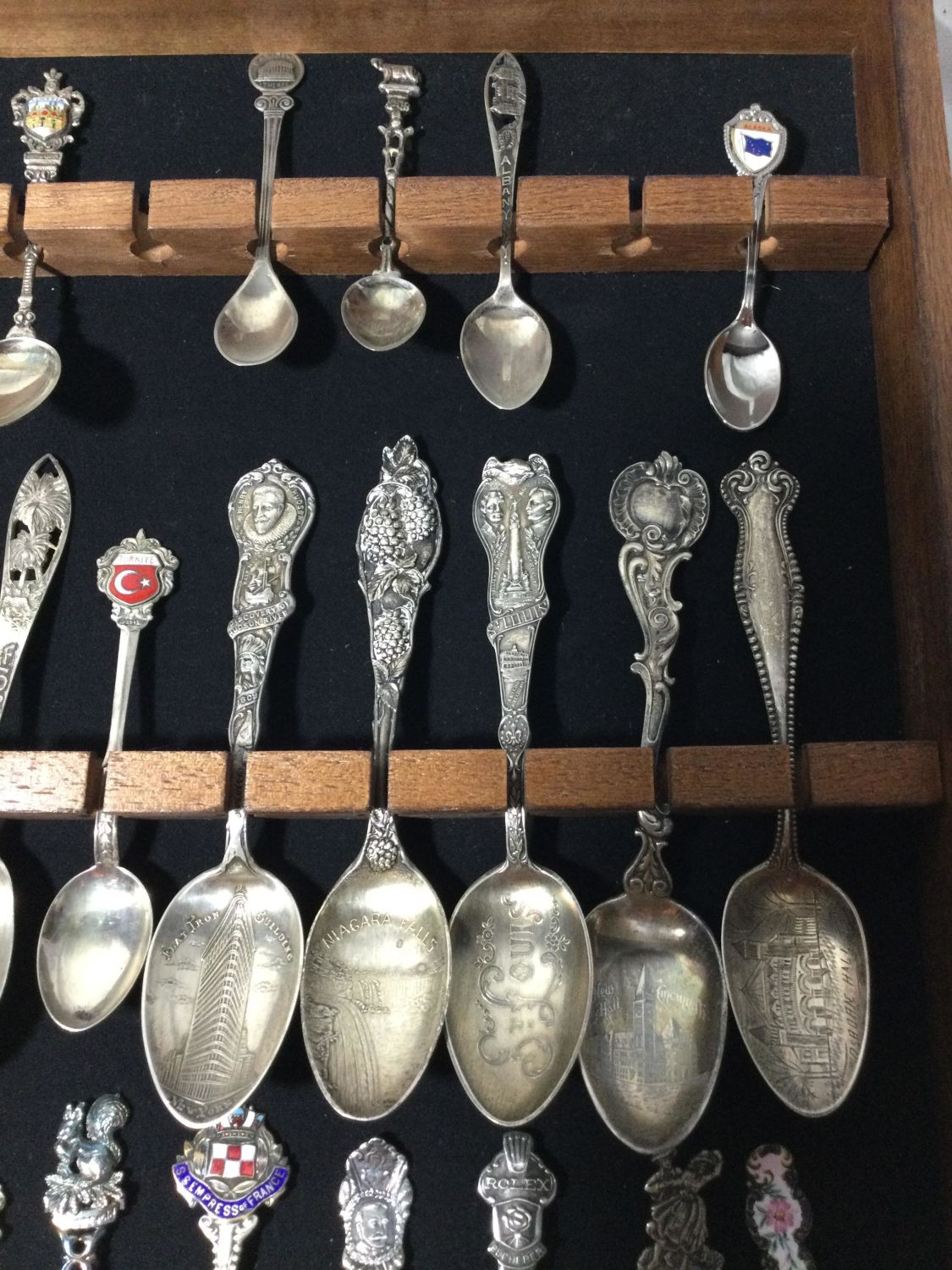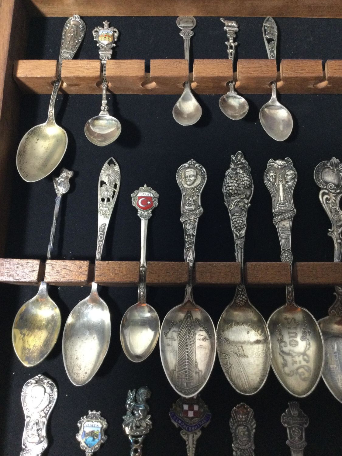 wooden case with glass measures 17 1/2 x 11 can be wall hung Set includes 21 spoons one fork