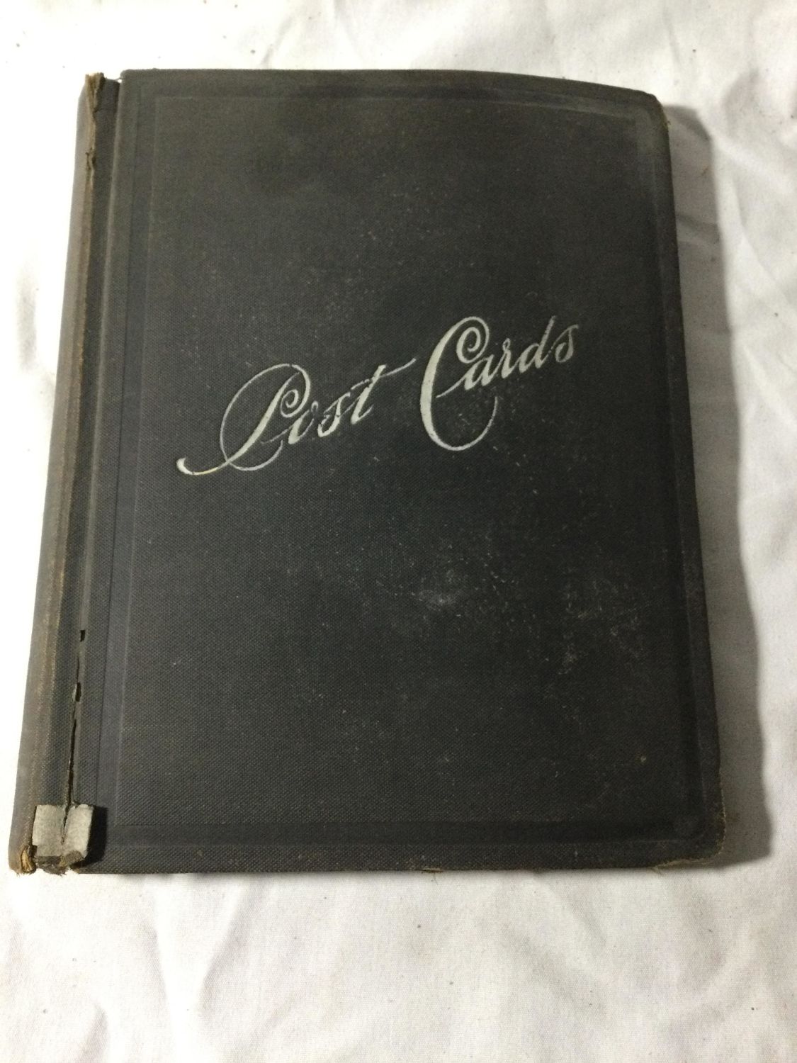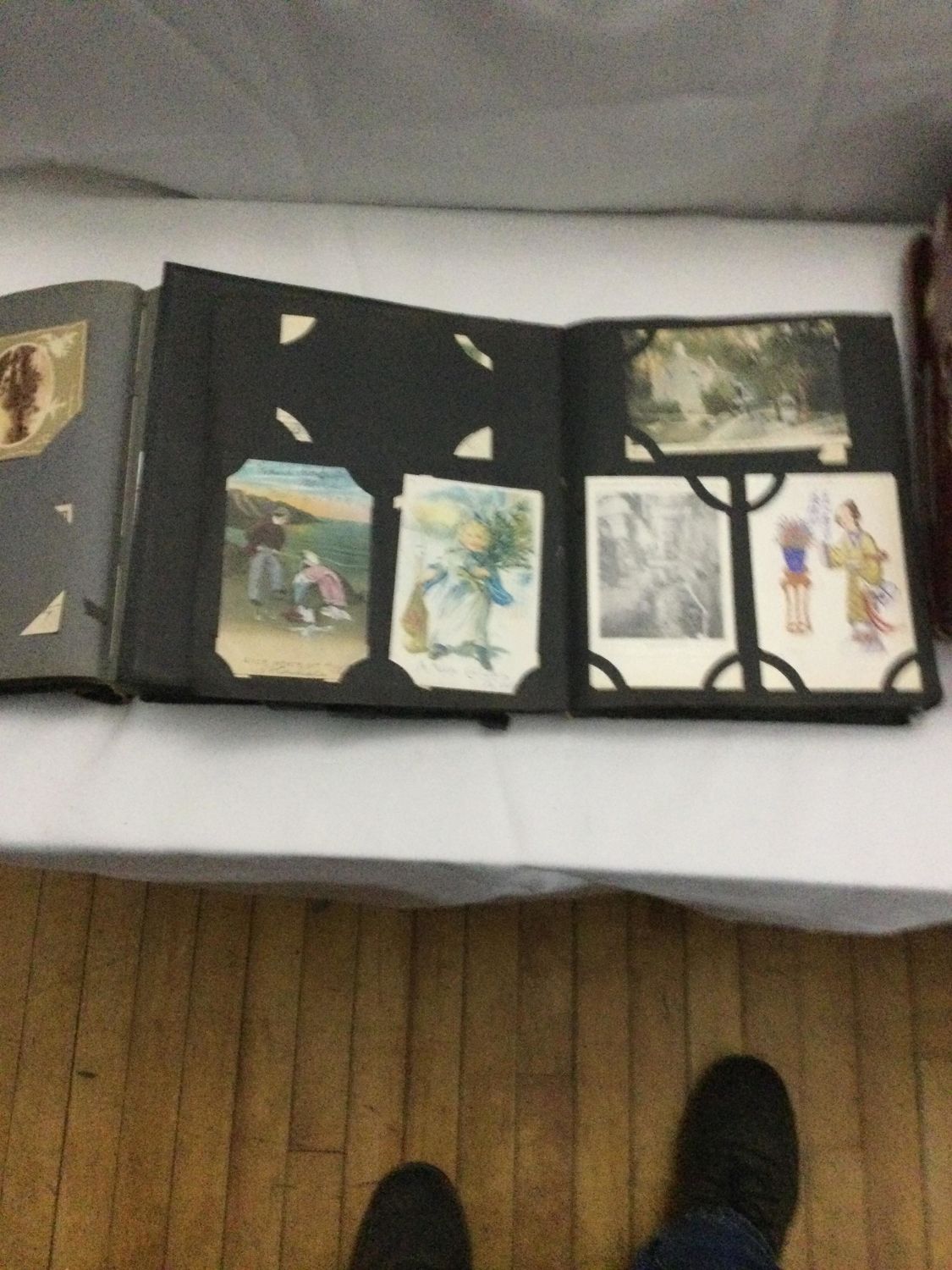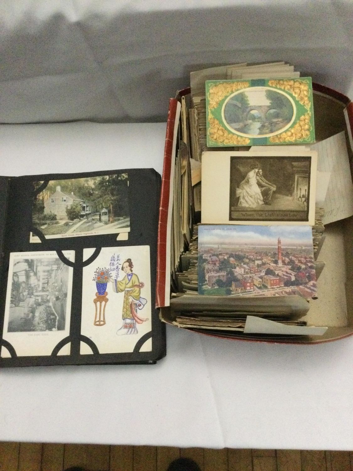 Over 300 color and black and white postcards in two albums and many loose in a box