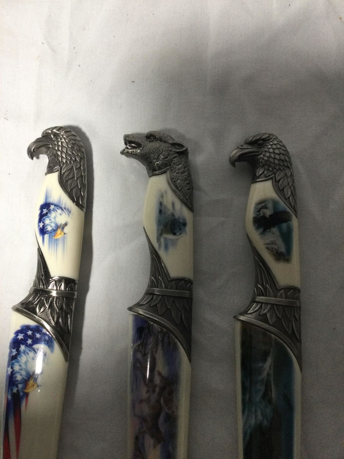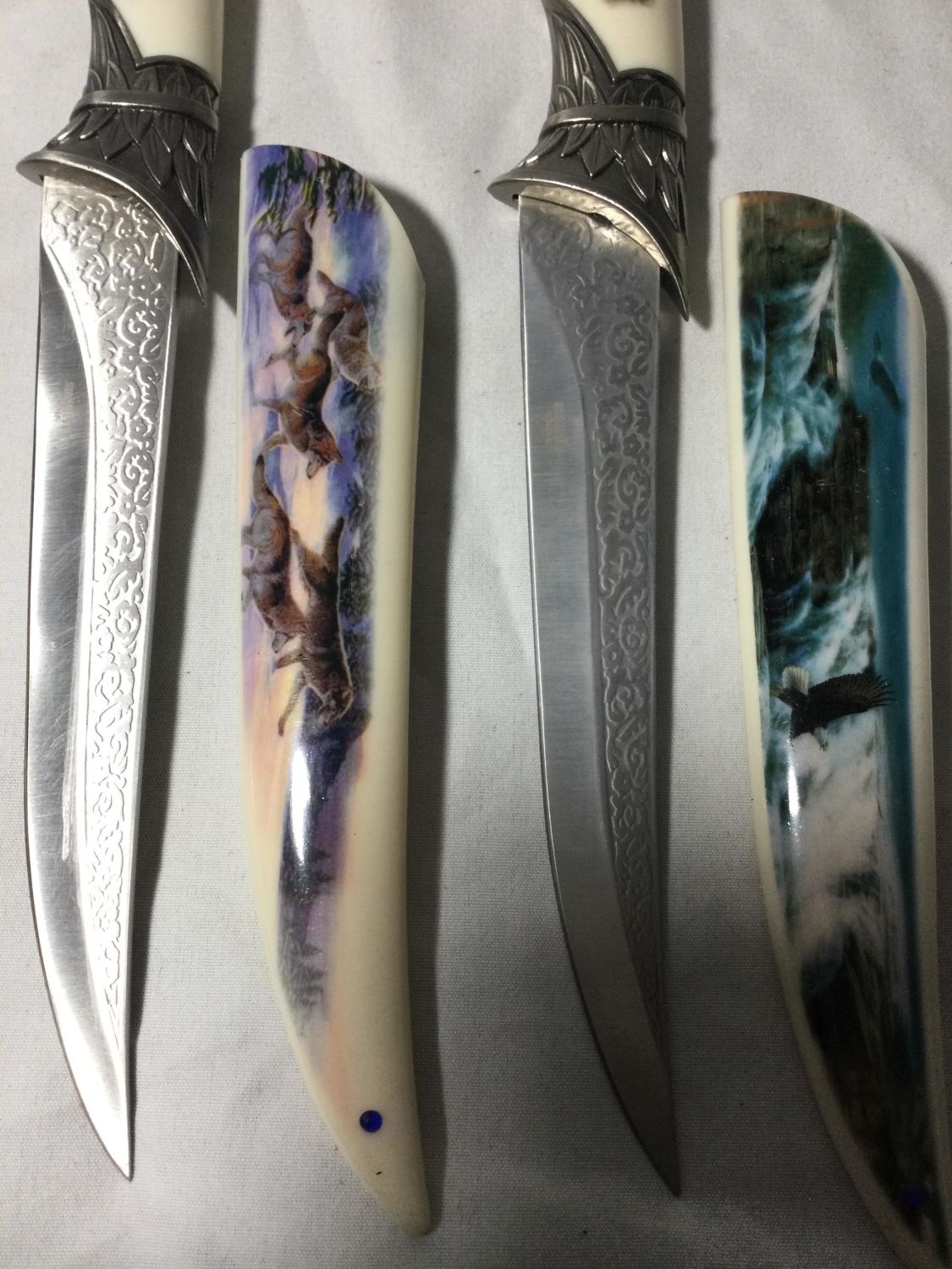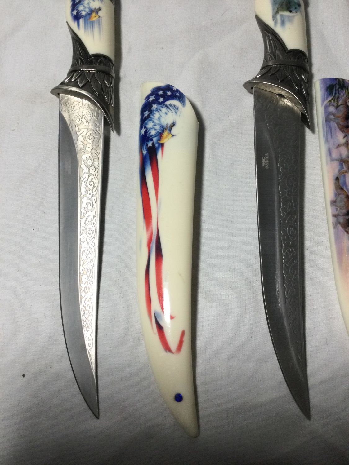 with silver blade and also very decorative sheaths and handles,American eagle ,wolves ,and flying eagle are depicted