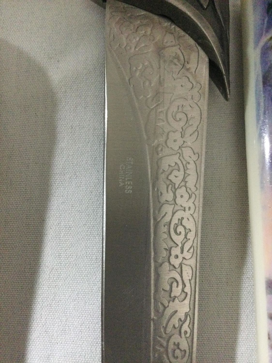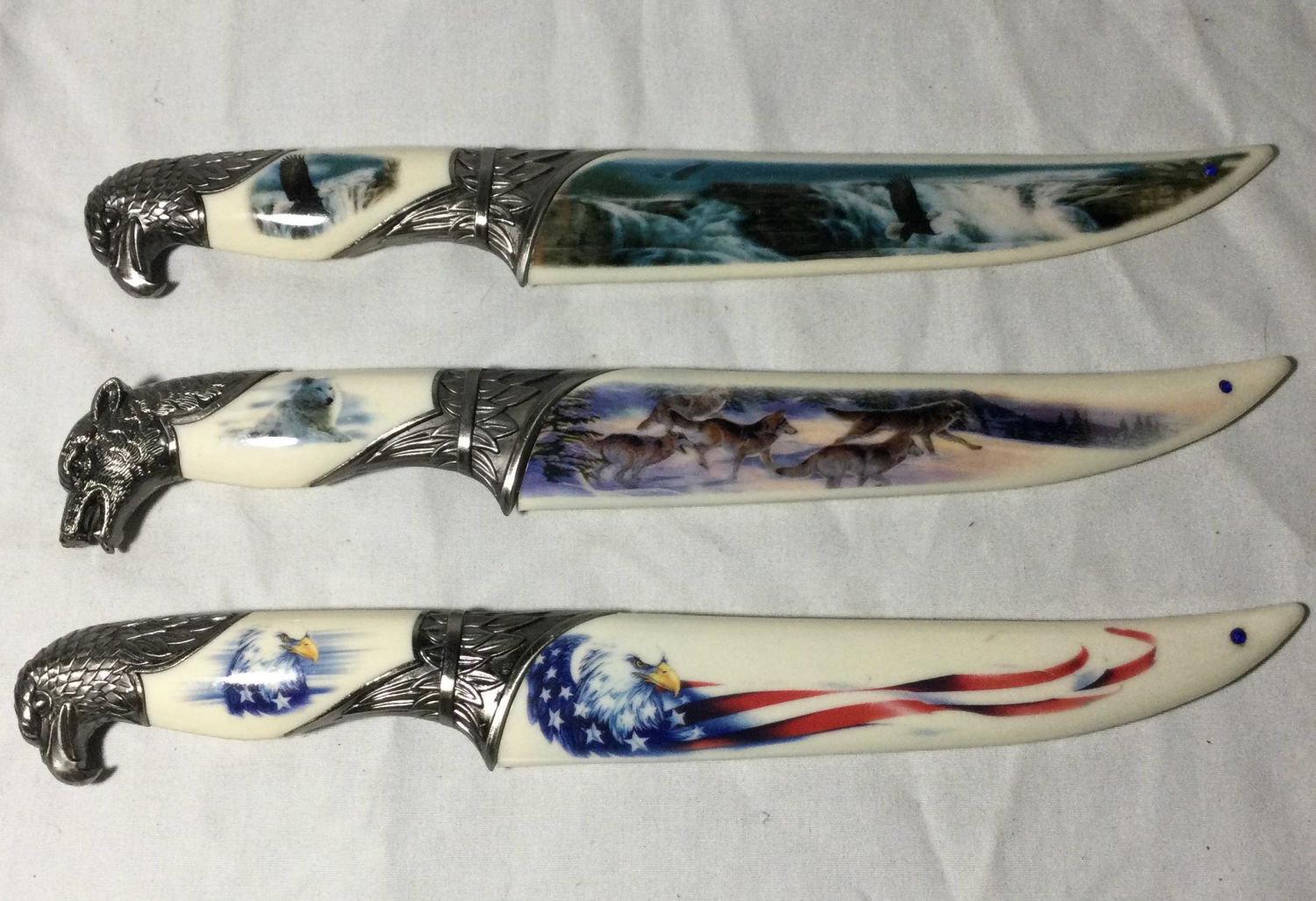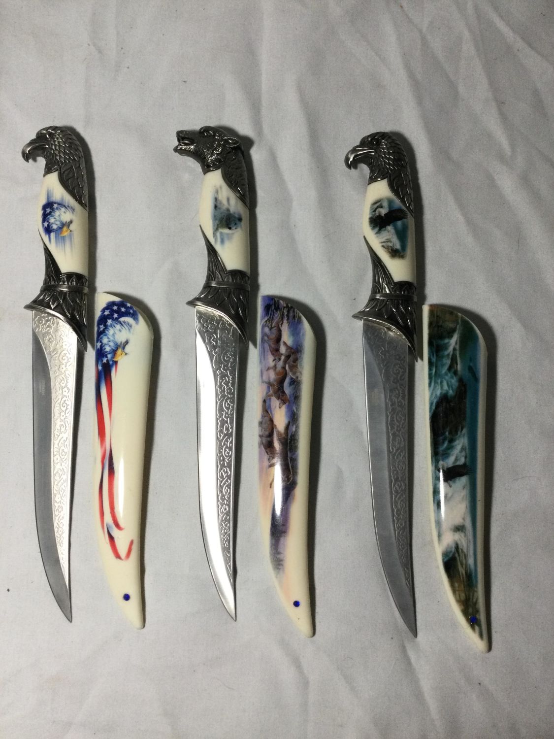 with silver blade and also very decorative sheaths and handles,American eagle ,wolves ,and flying eagle are depicted