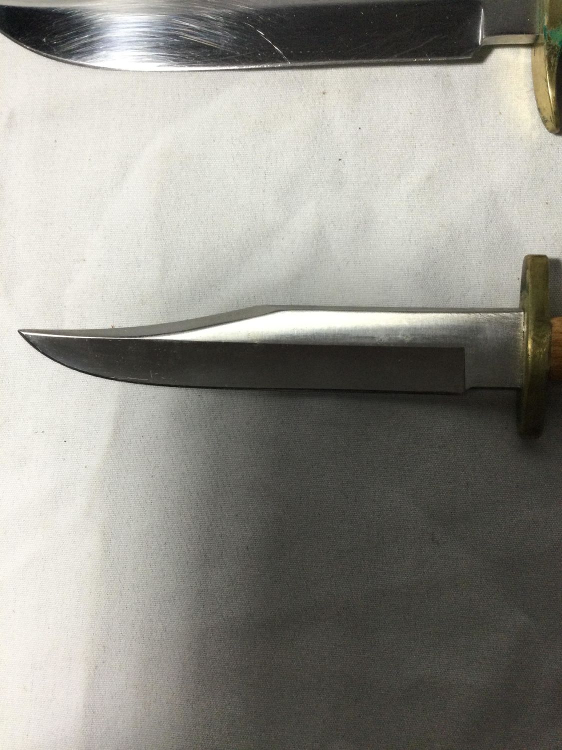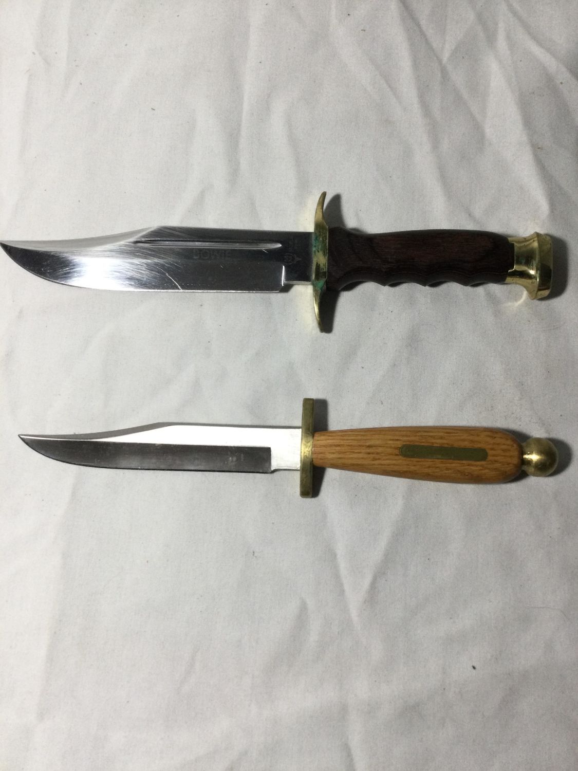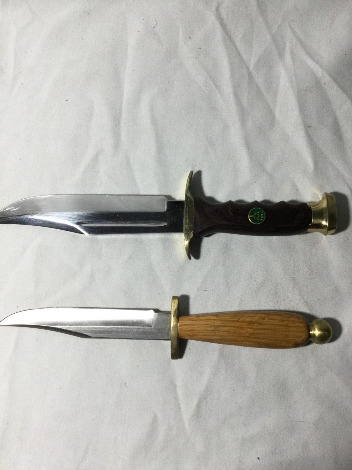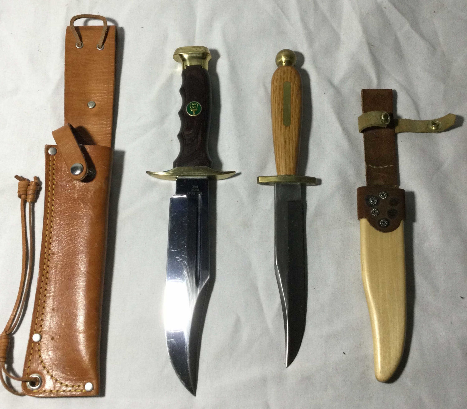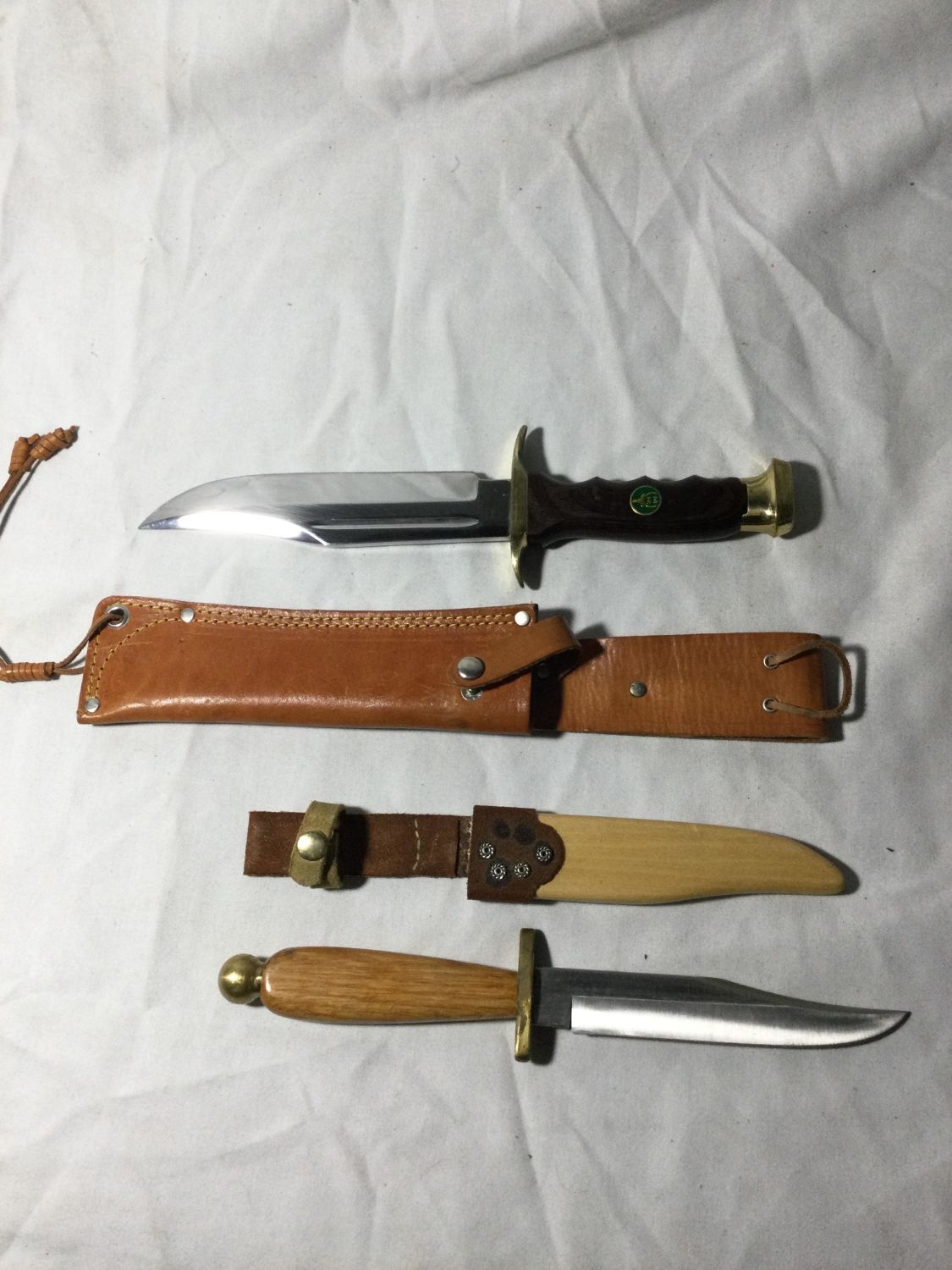 One with leather the other wooden sheath.Measures 12 inches and 11 inches