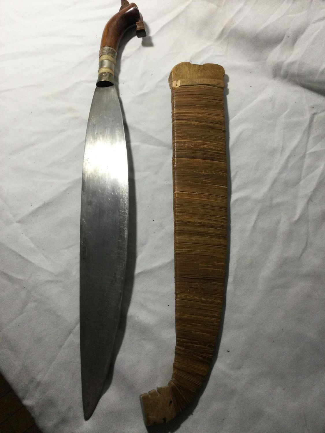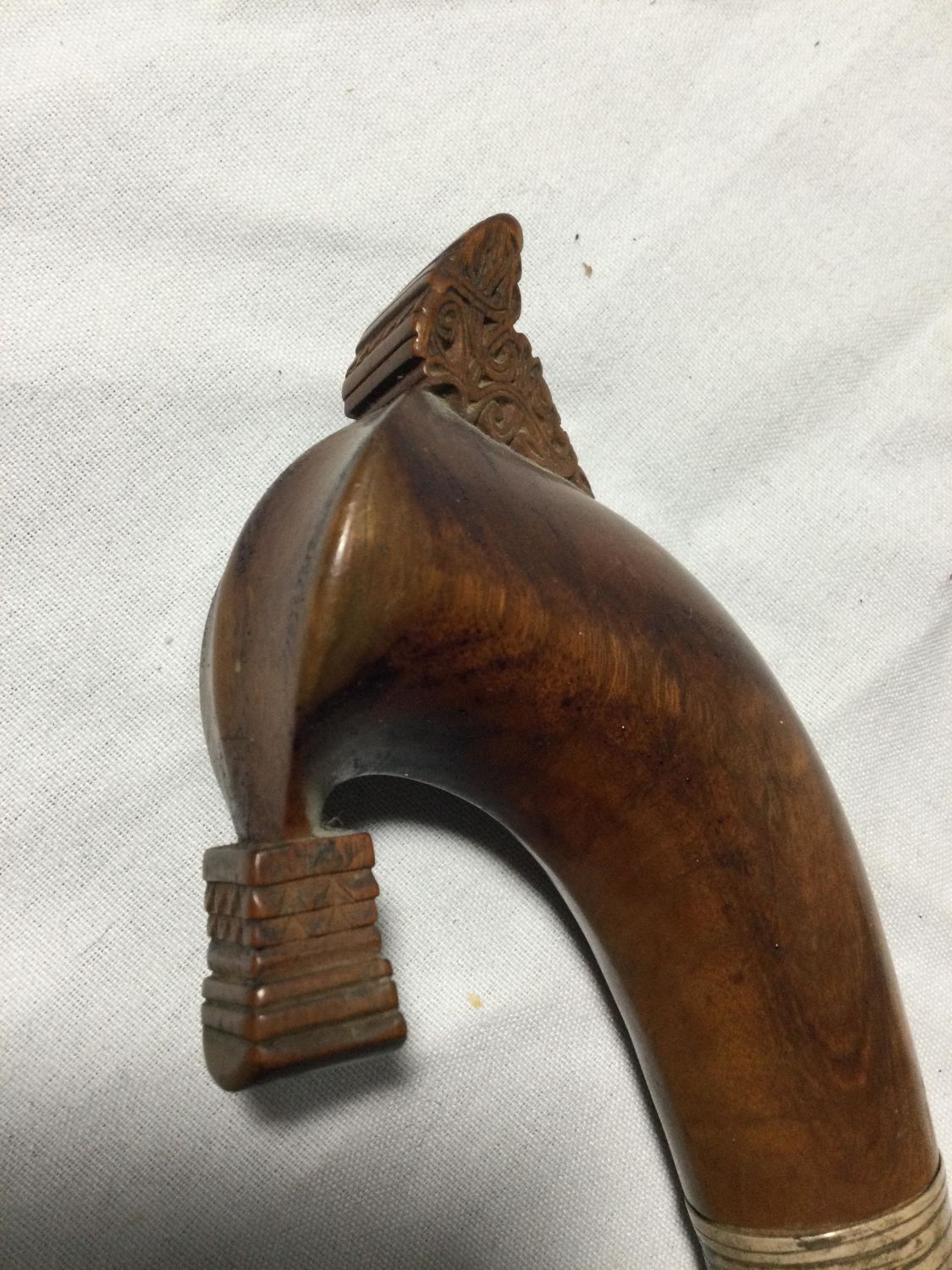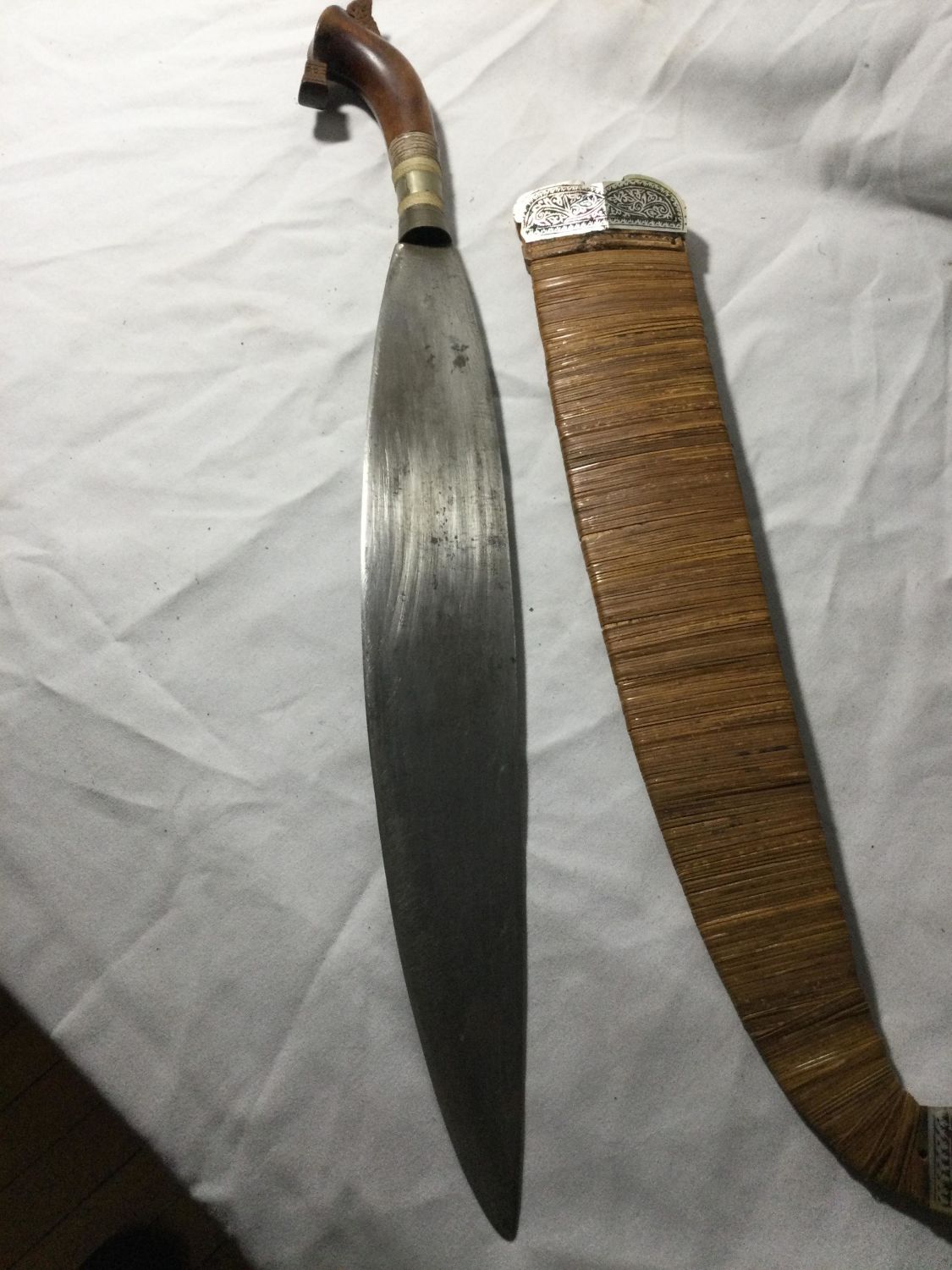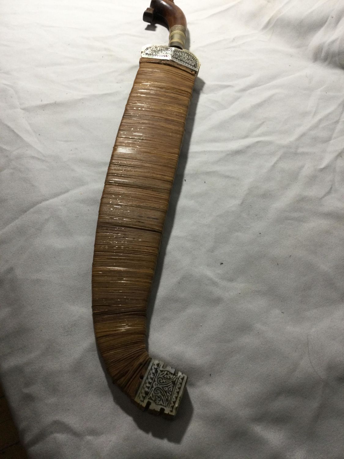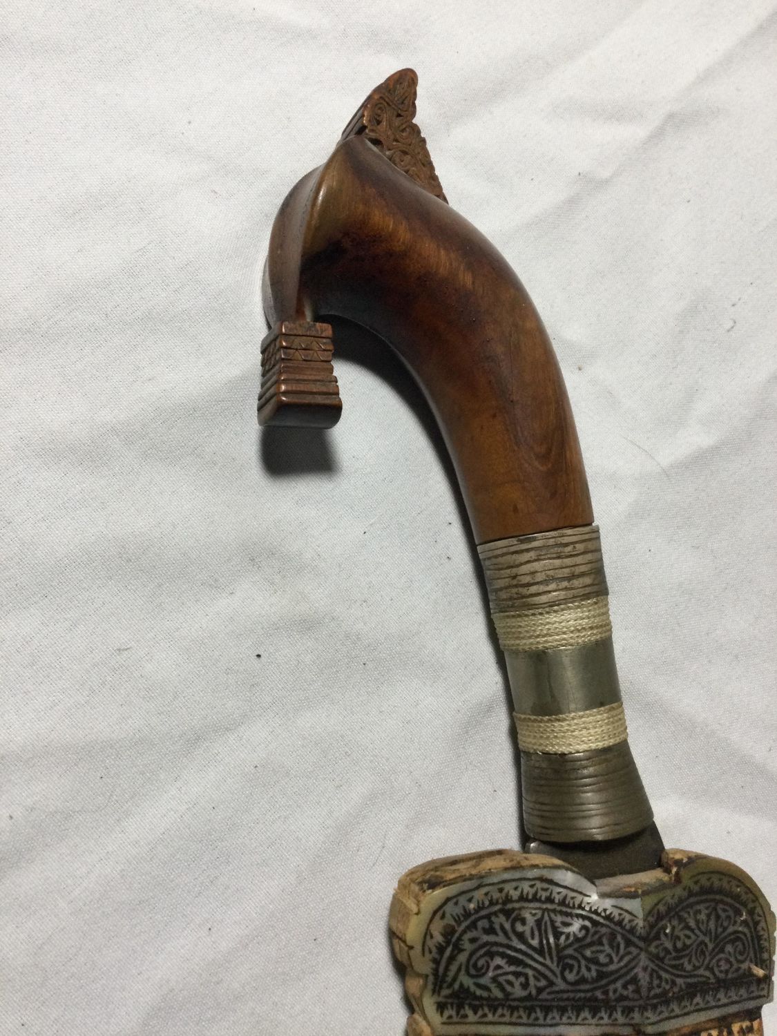 With decorative scabbard blade measures 17 and three-quarter inches long ,decorative wooden handle