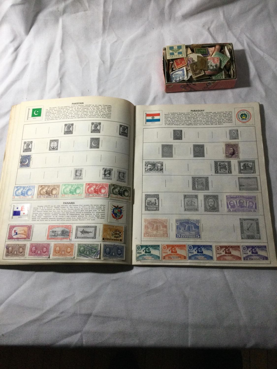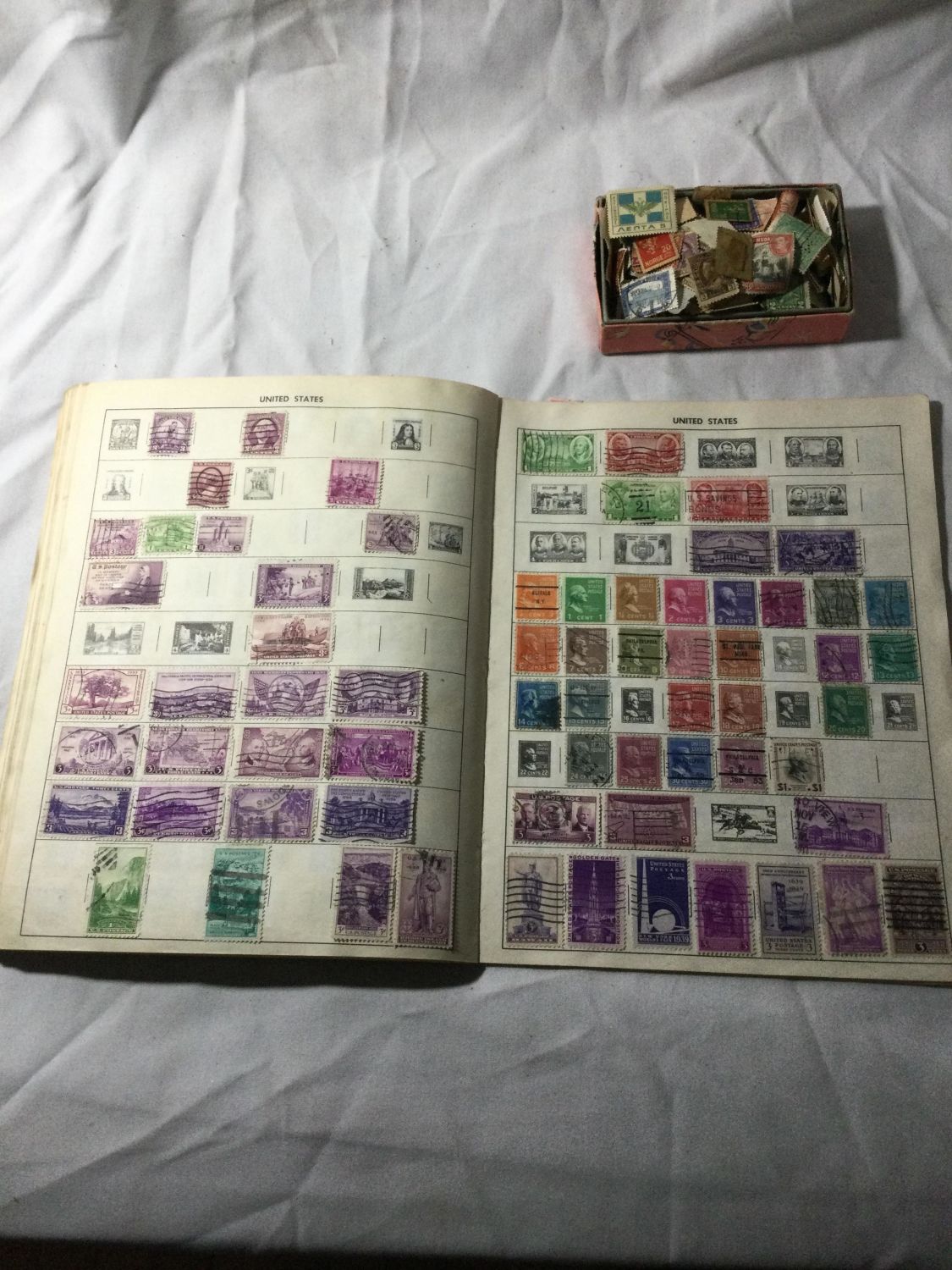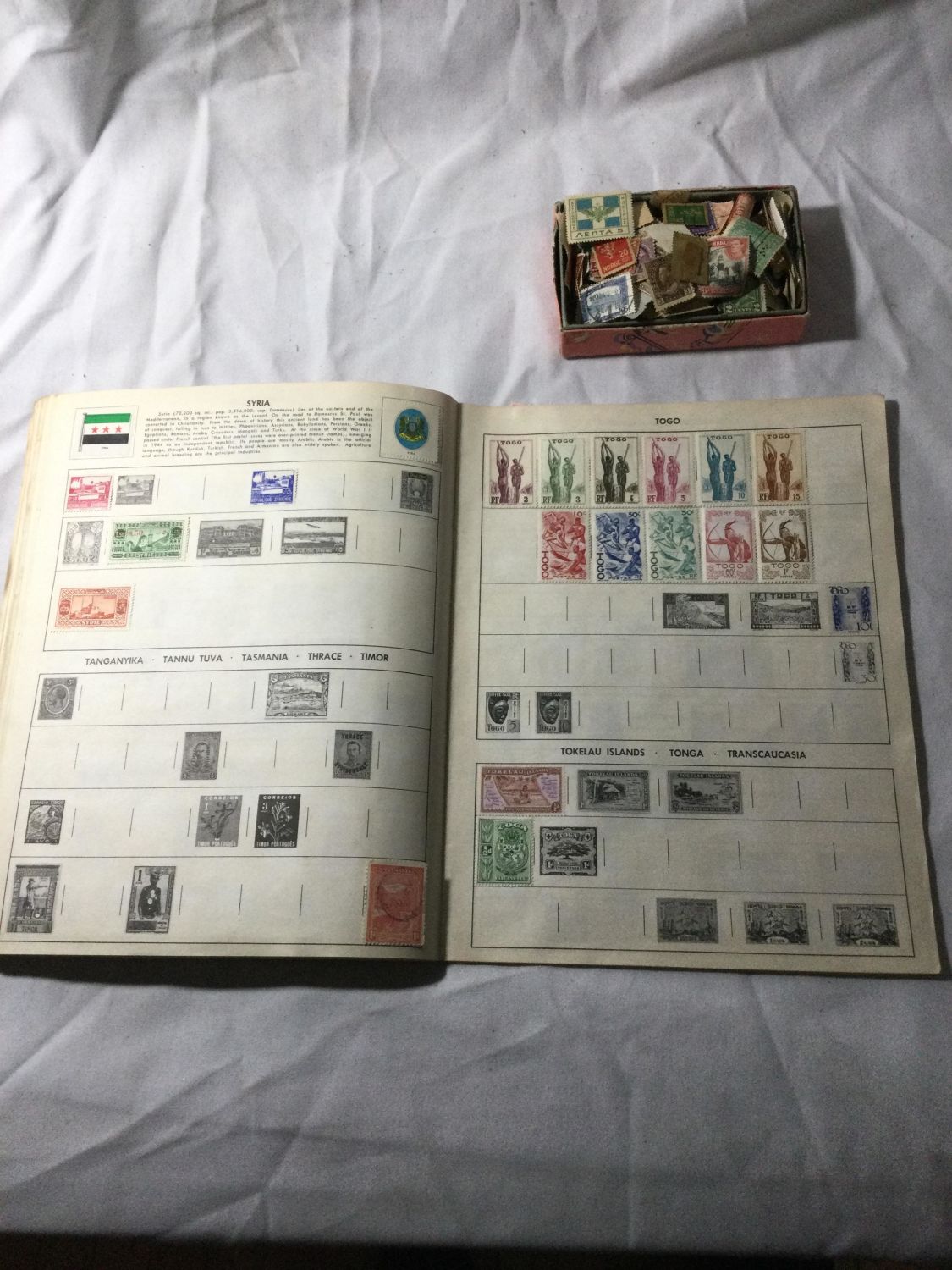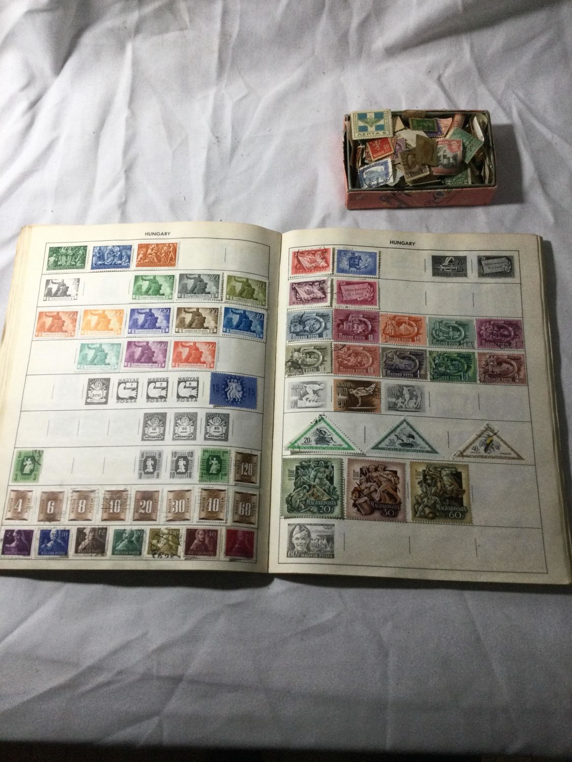 Stamp Collecting Album & small box full of stamps ,well over four or 500 stamps