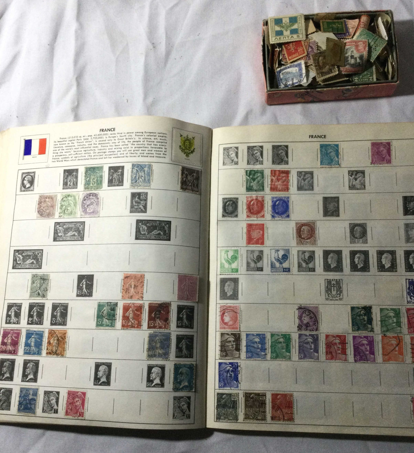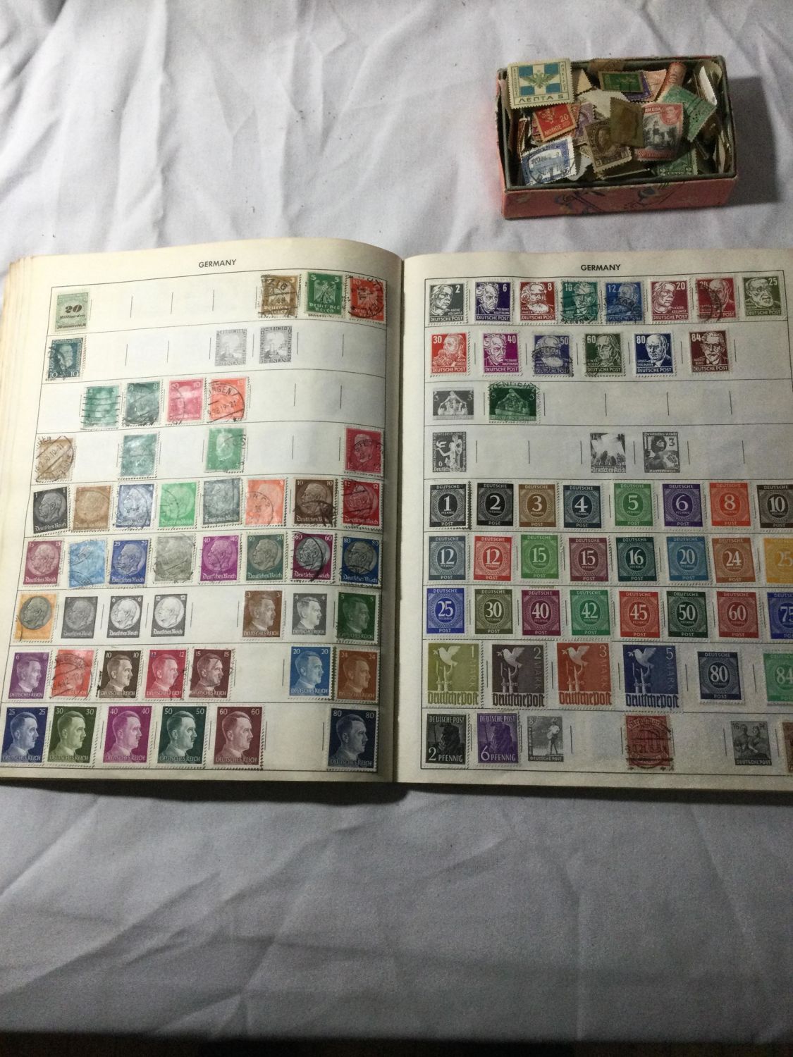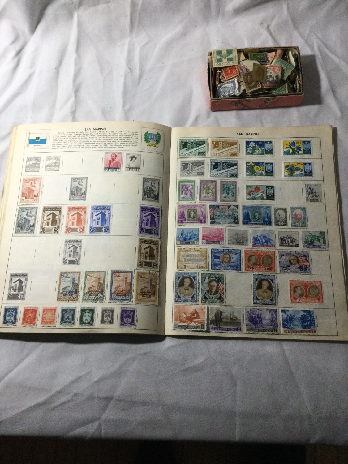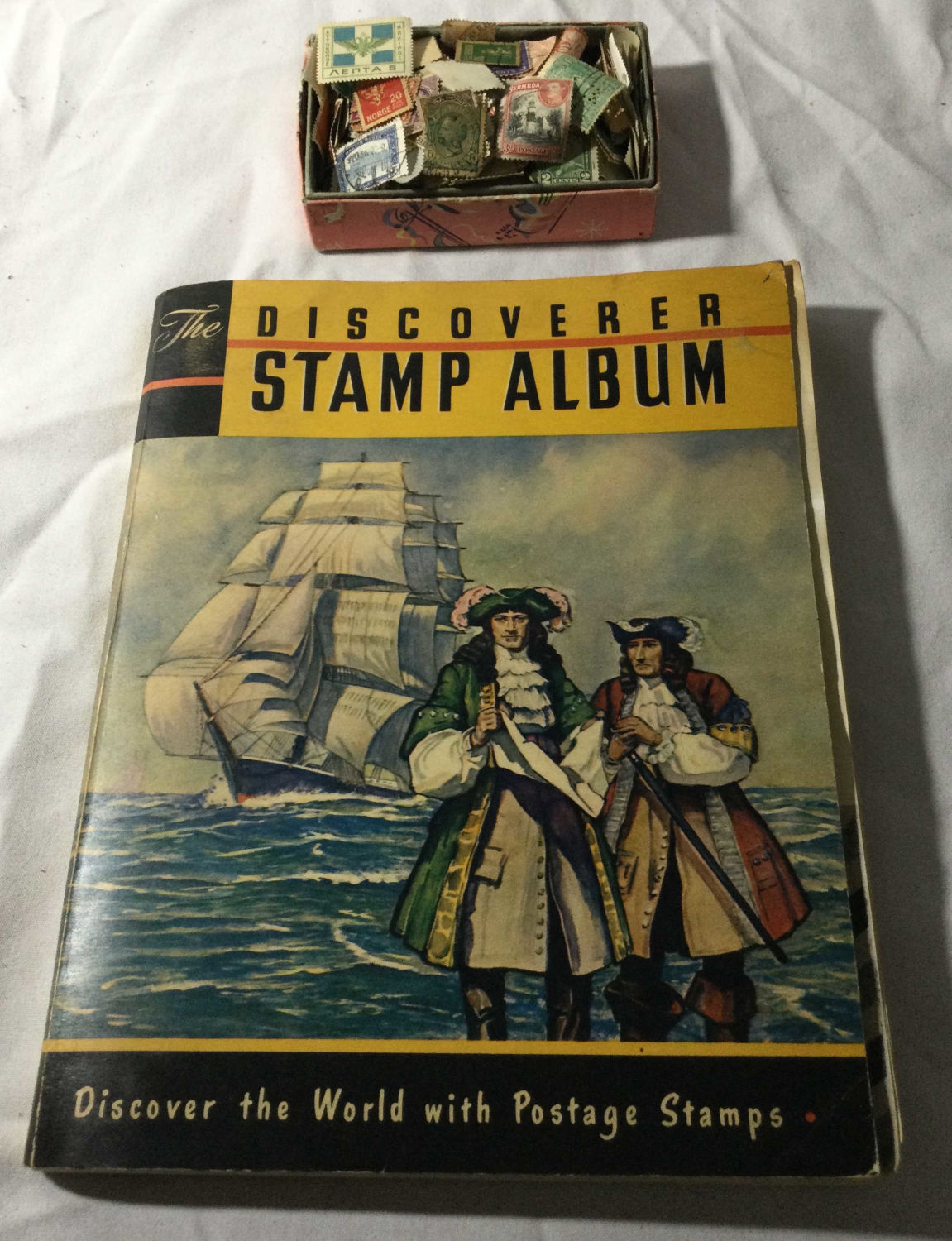 Stamp Collecting Album & small box full of stamps ,well over four or 500 stamps
