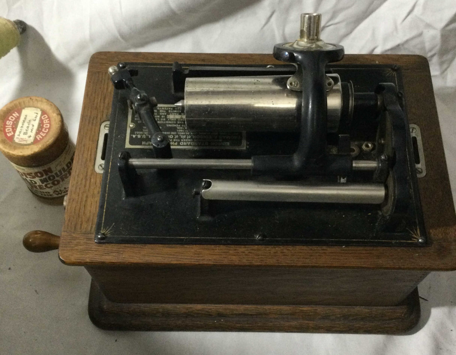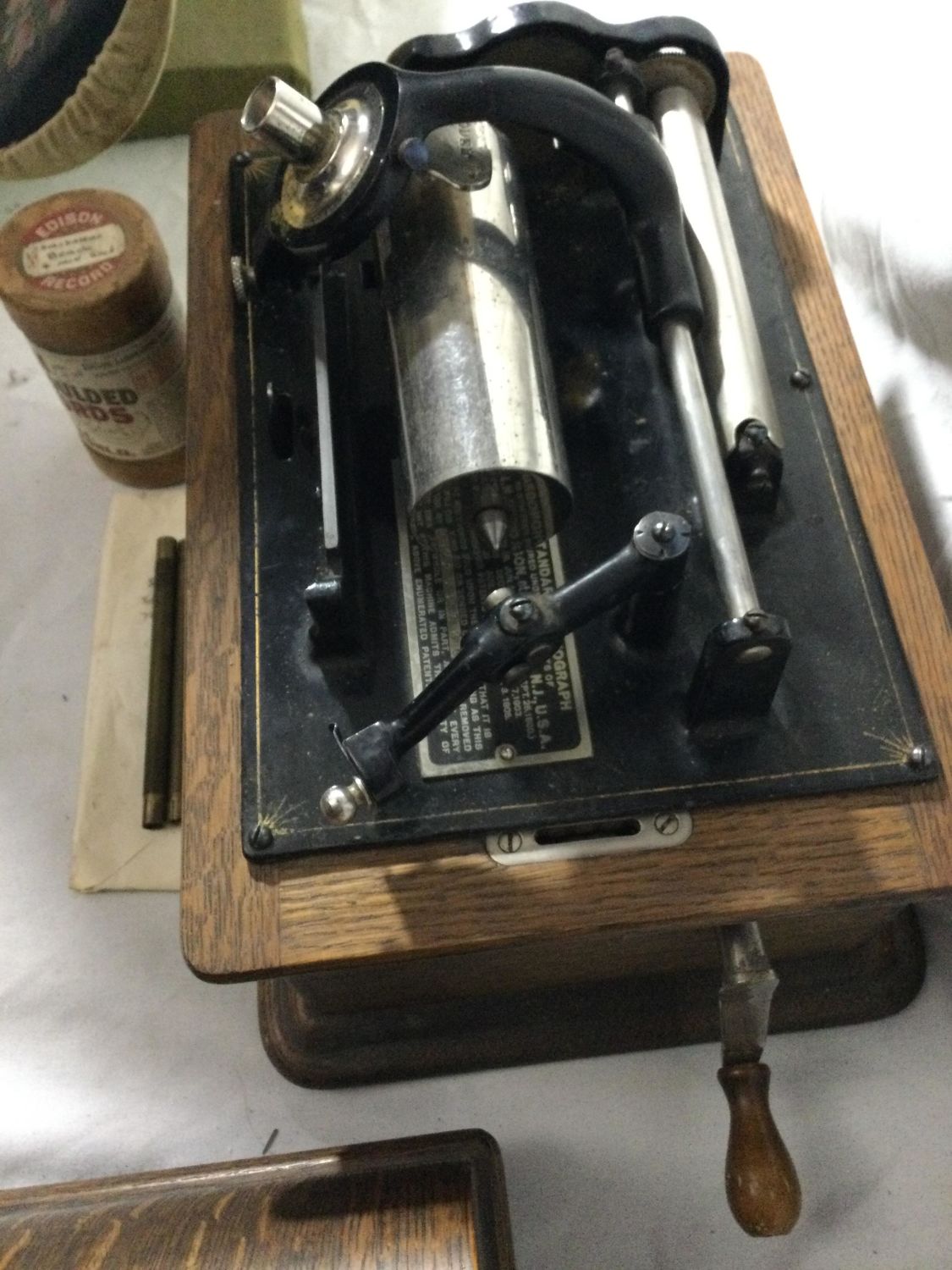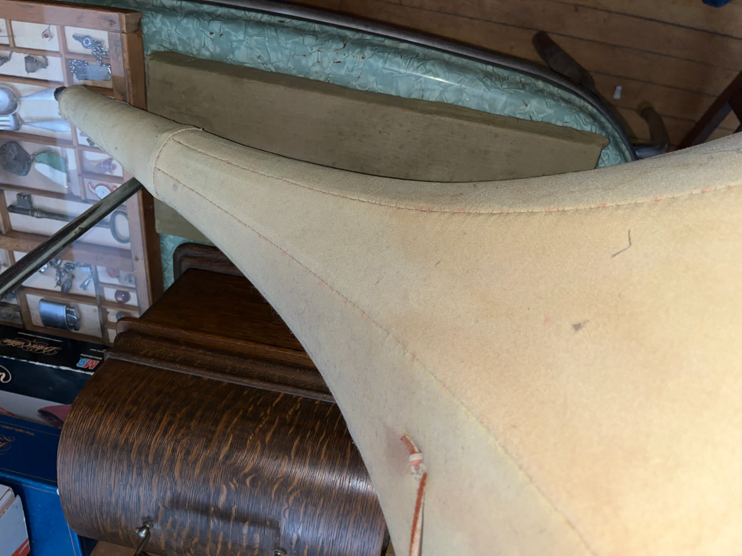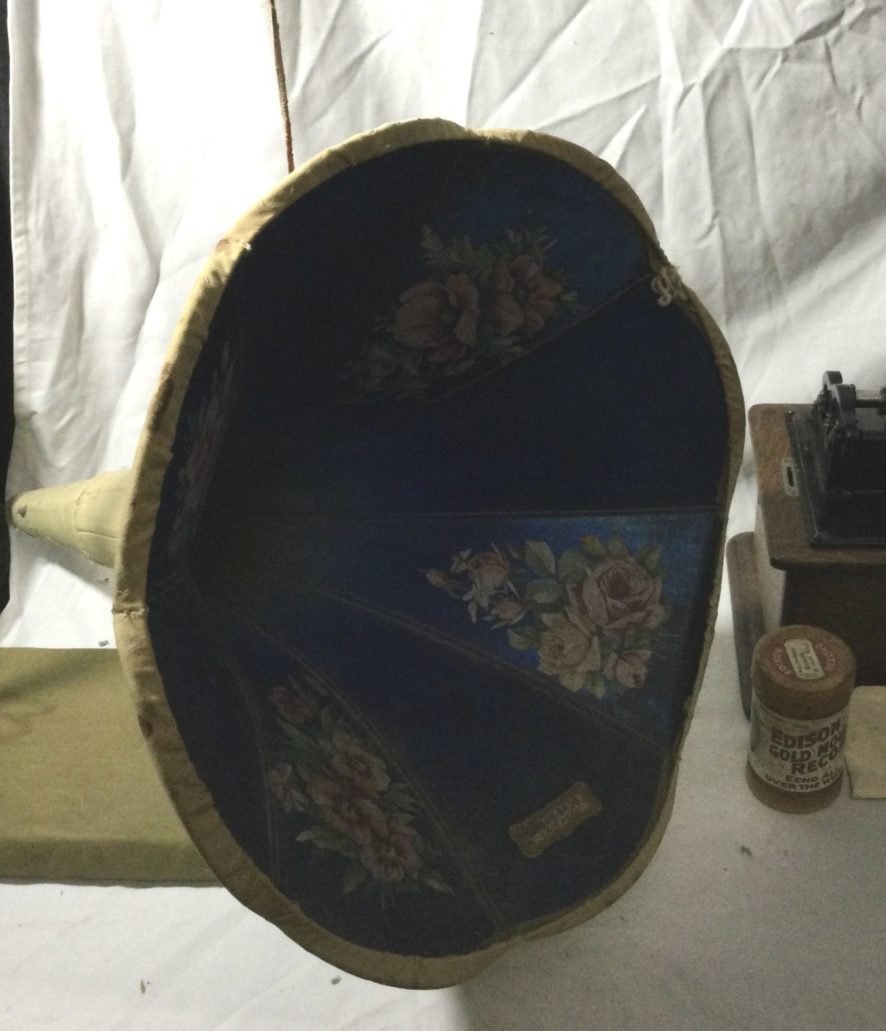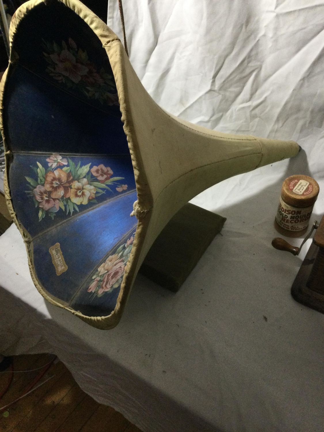 serial number 503780 beautiful wooden case with fabric horn. Includes 75 music cylinders. Includes everything pictured