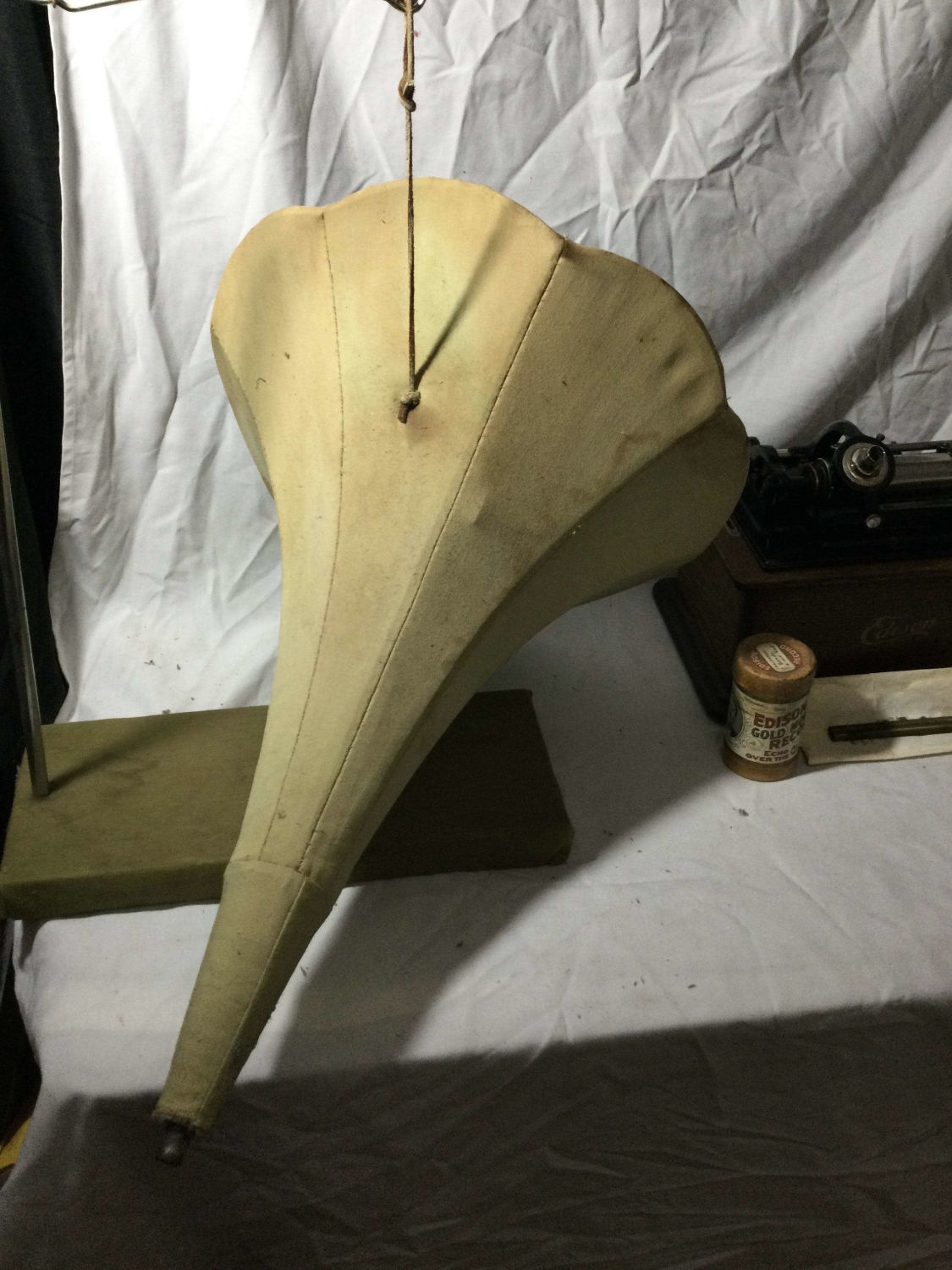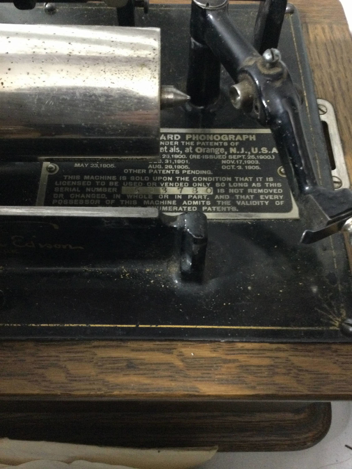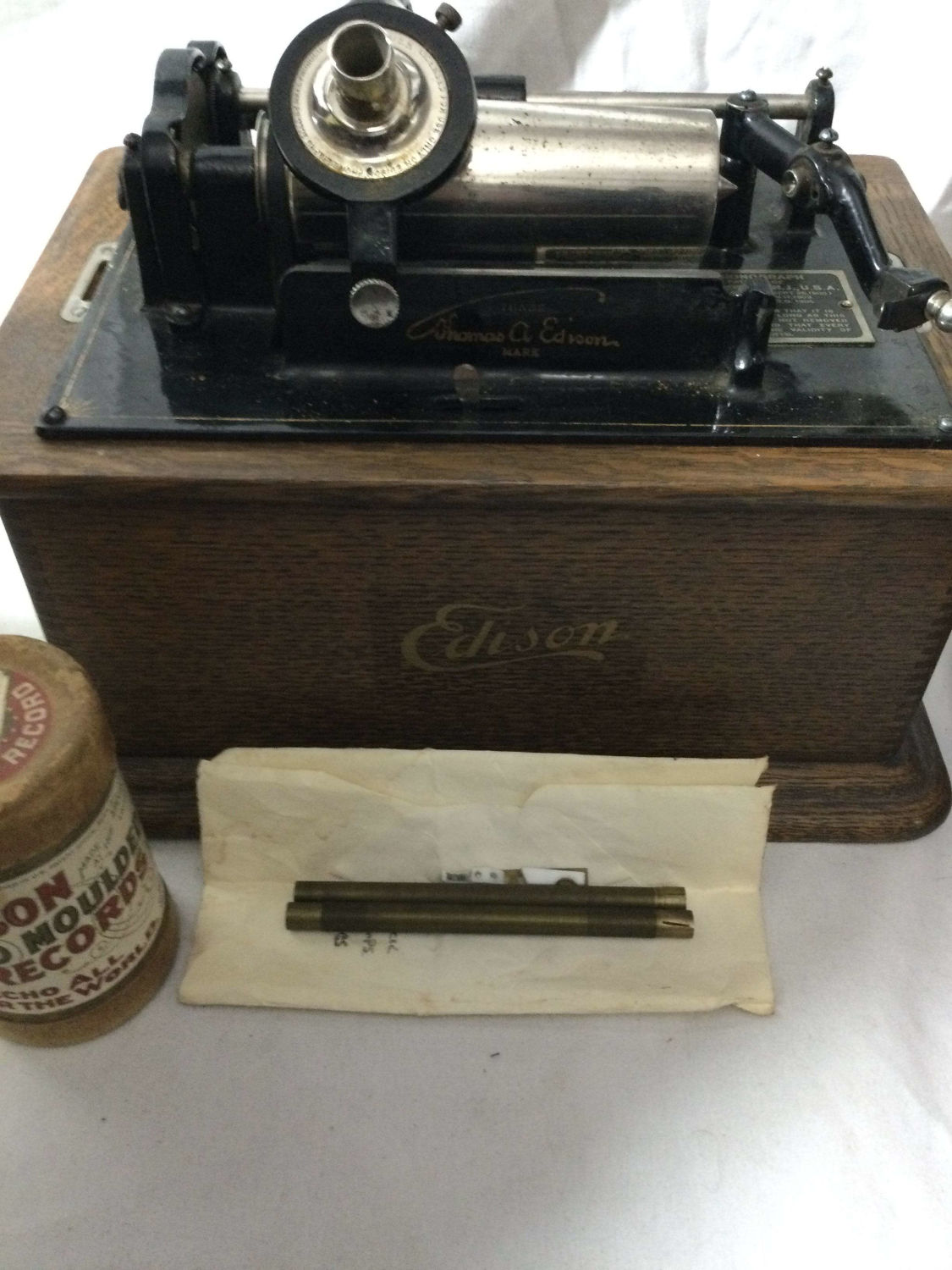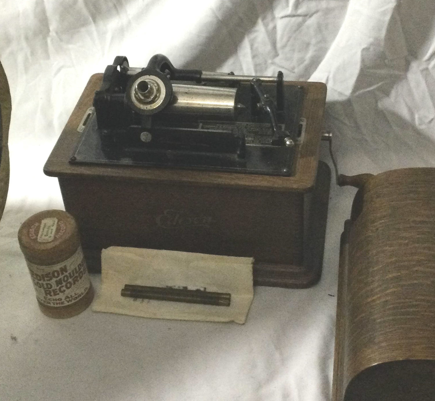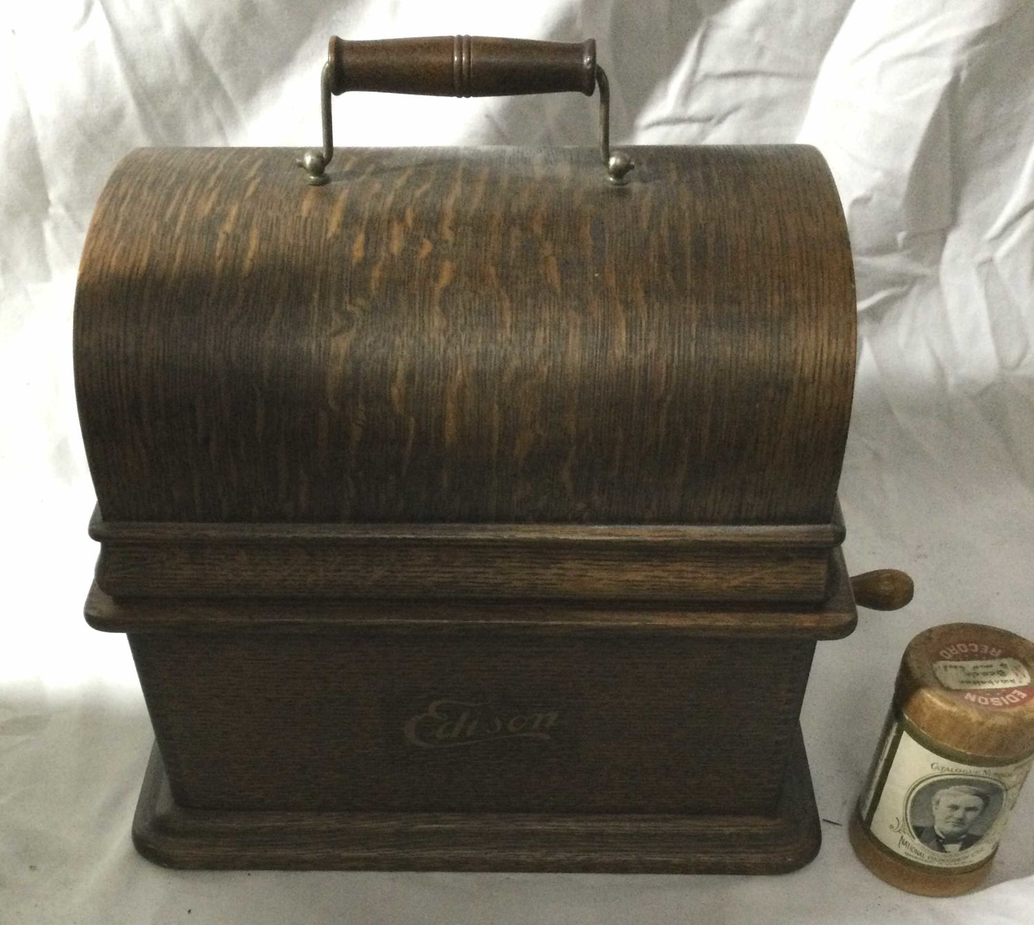 serial number 503780 beautiful wooden case with fabric horn. Includes 75 music cylinders. Includes everything pictured
