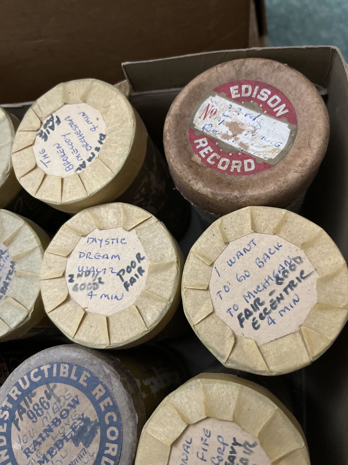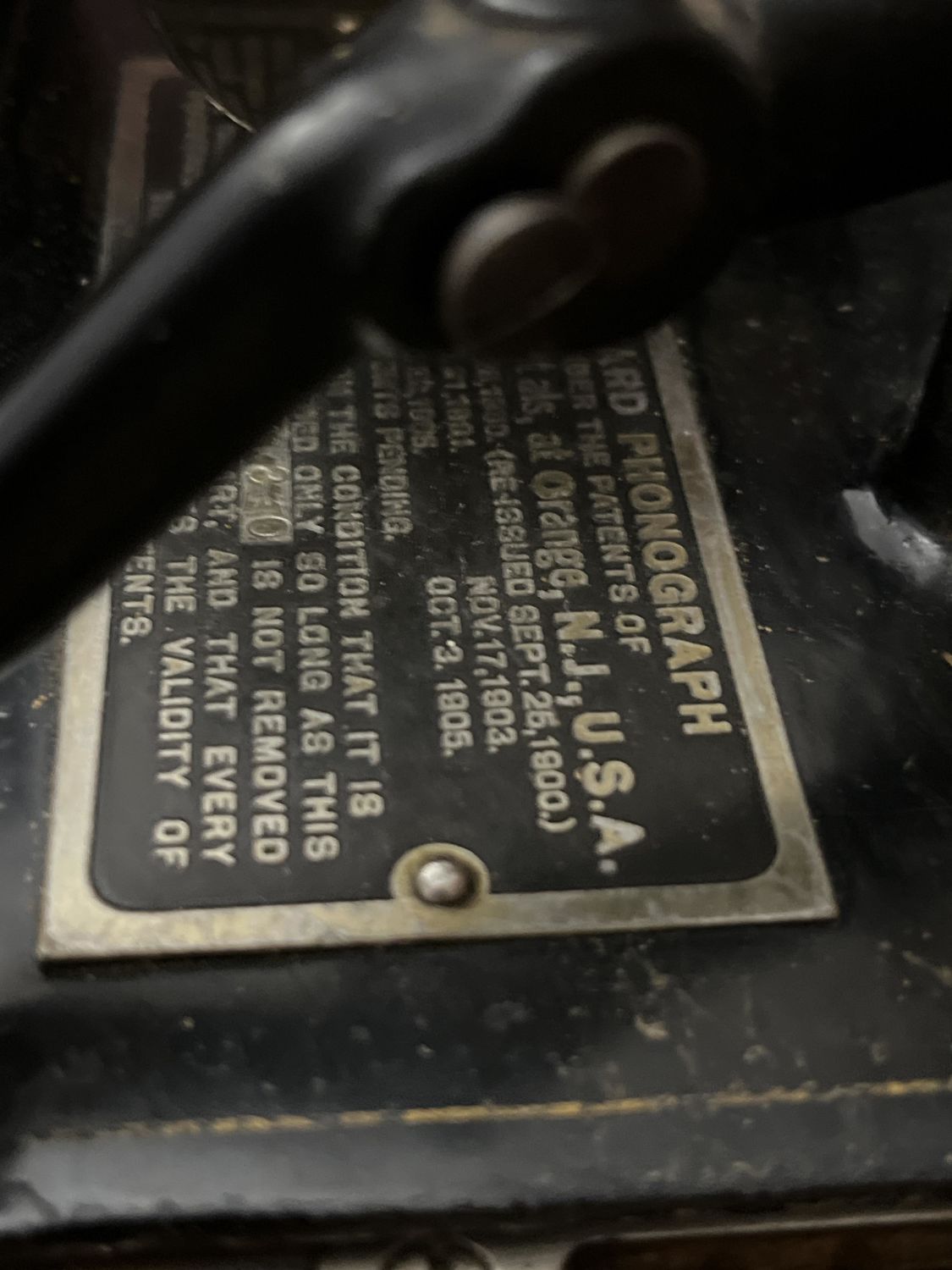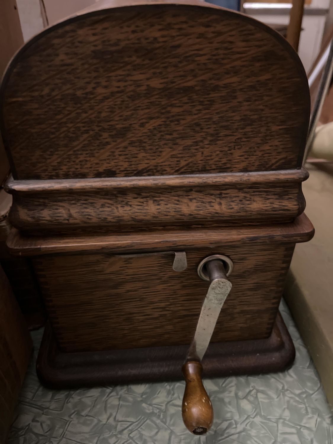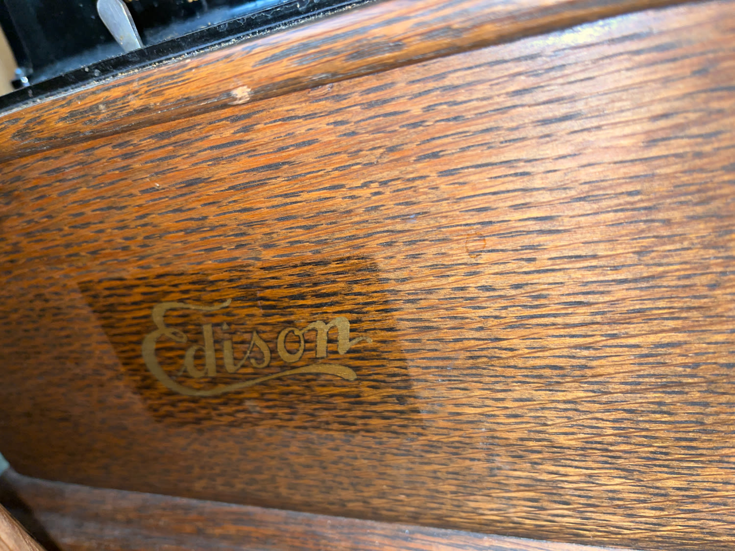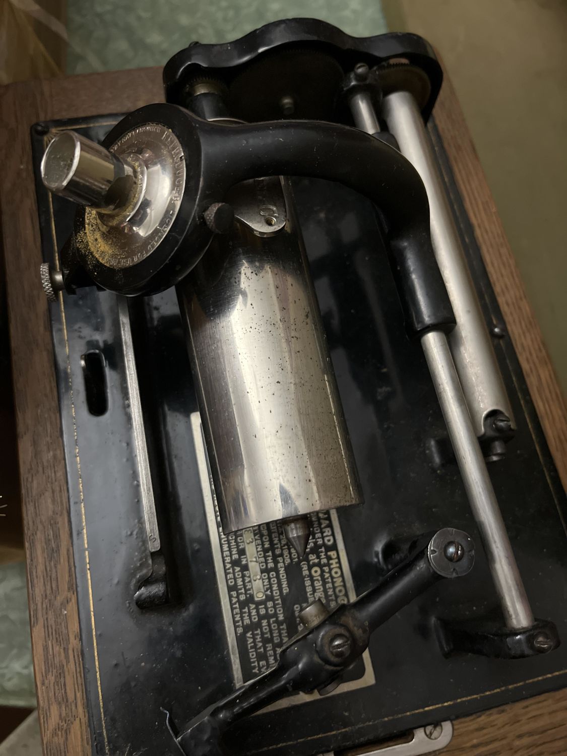serial number 503780 beautiful wooden case with fabric horn. Includes 75 music cylinders. Includes everything pictured