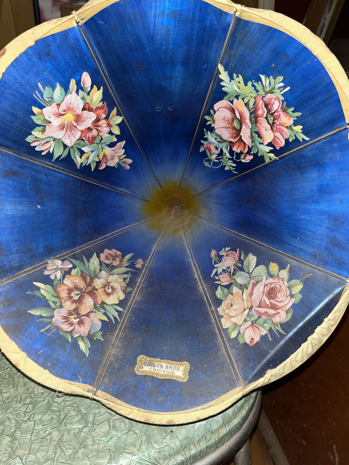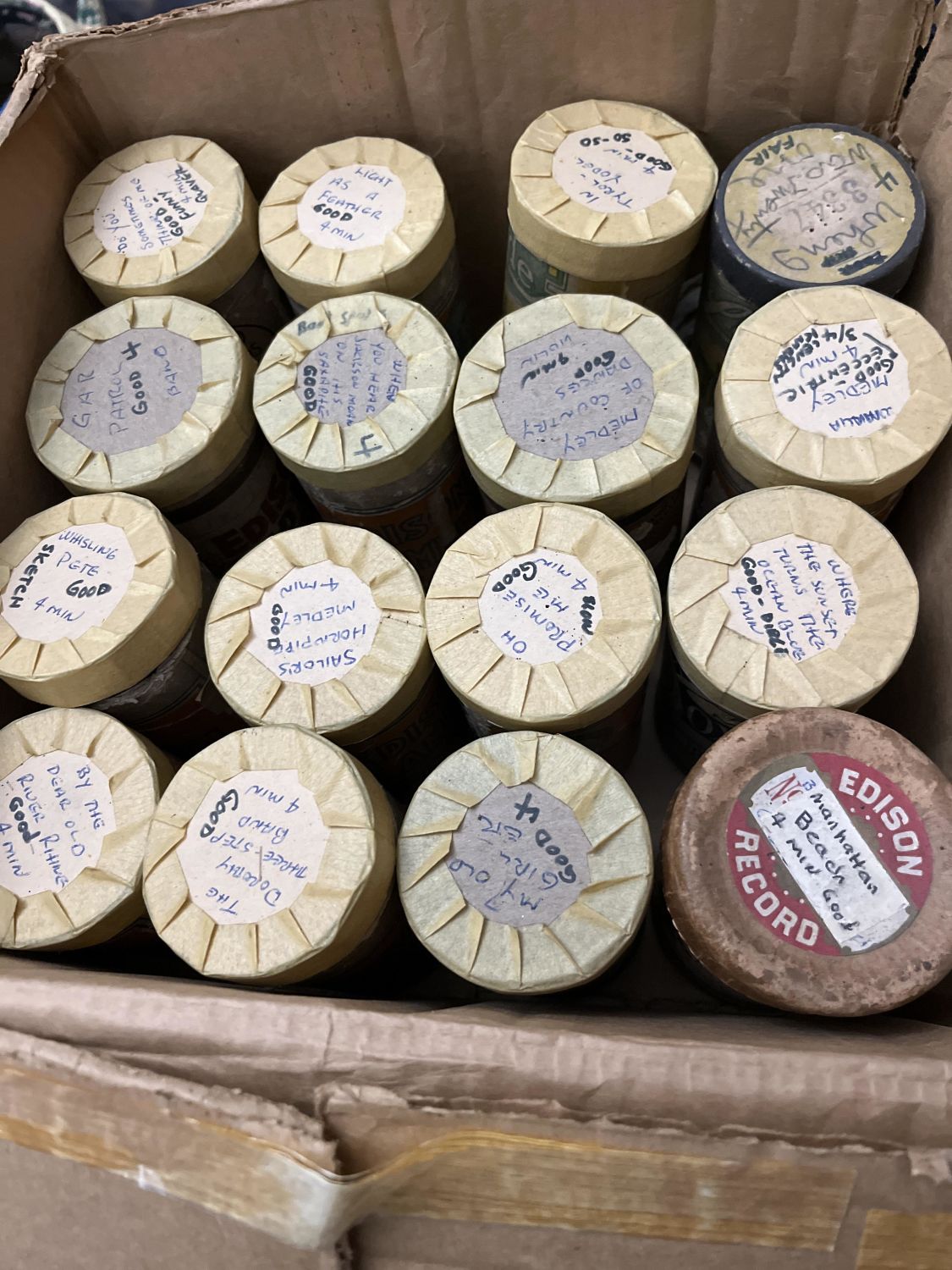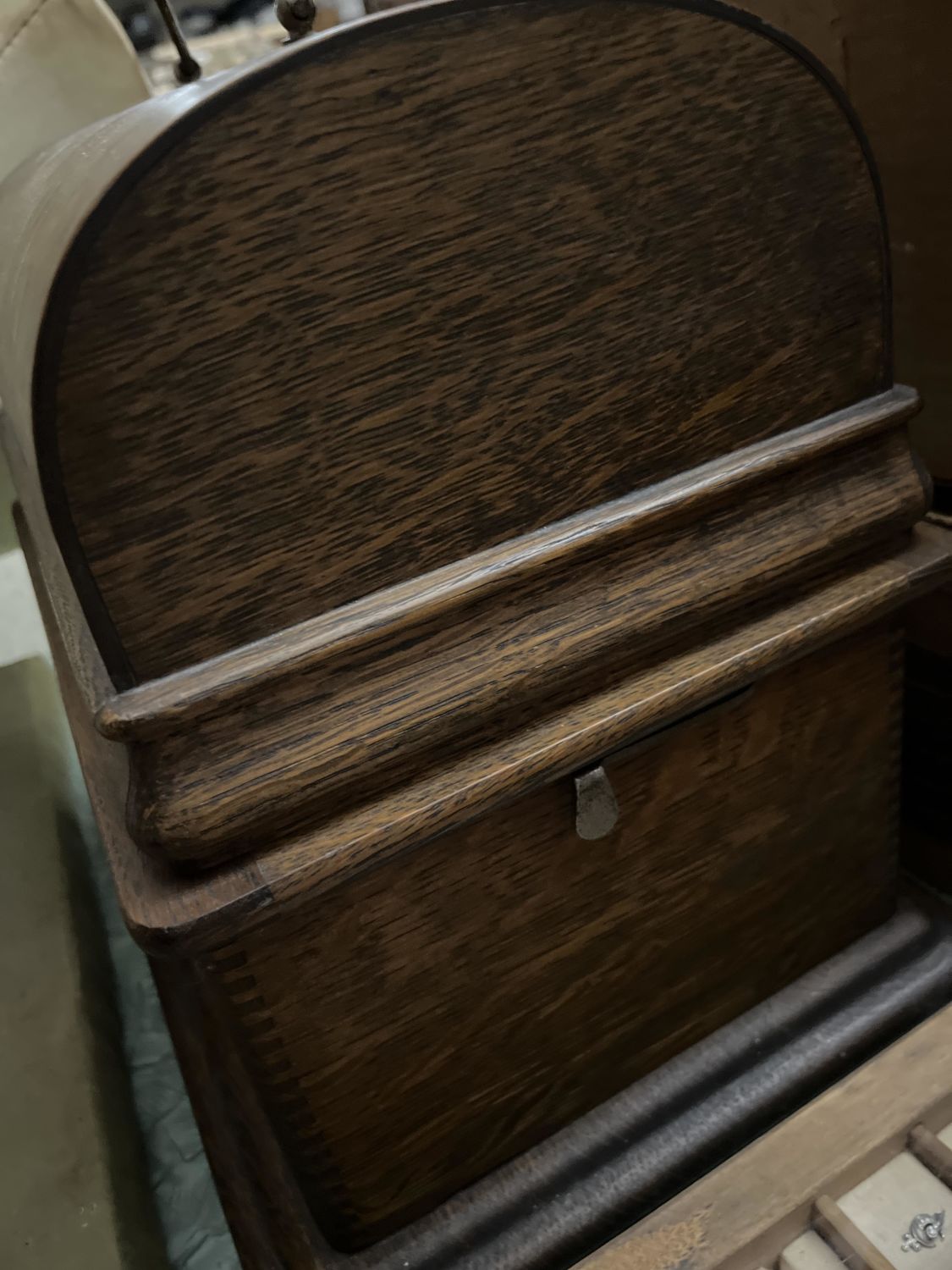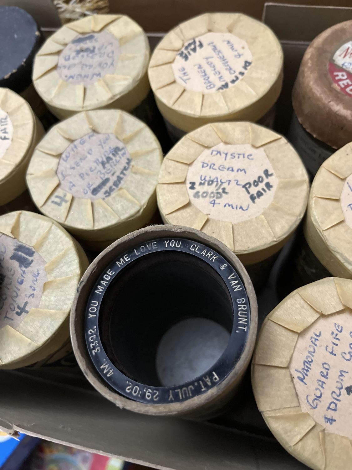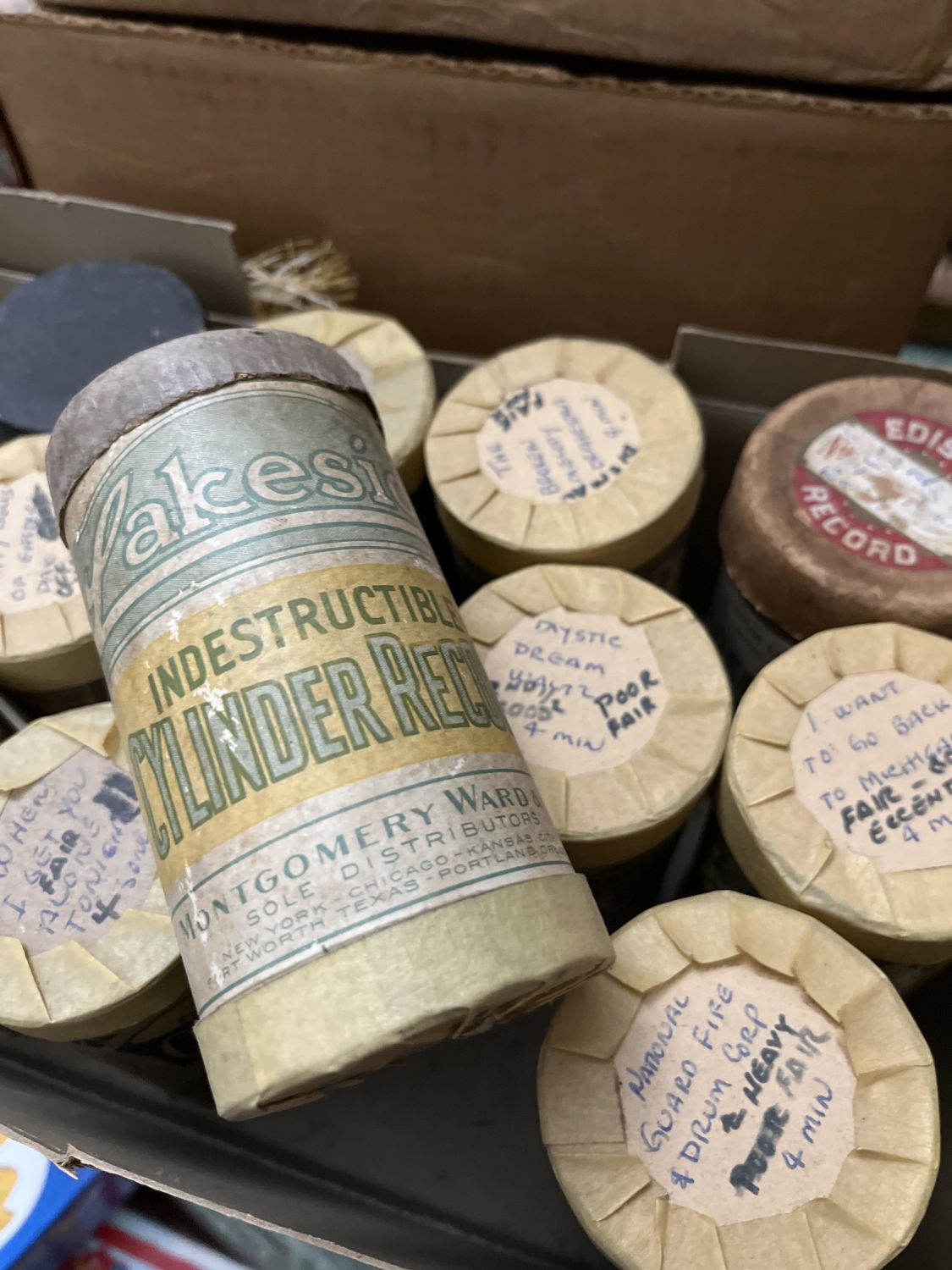 serial number 503780 beautiful wooden case with fabric horn. Includes 75 music cylinders. Includes everything pictured