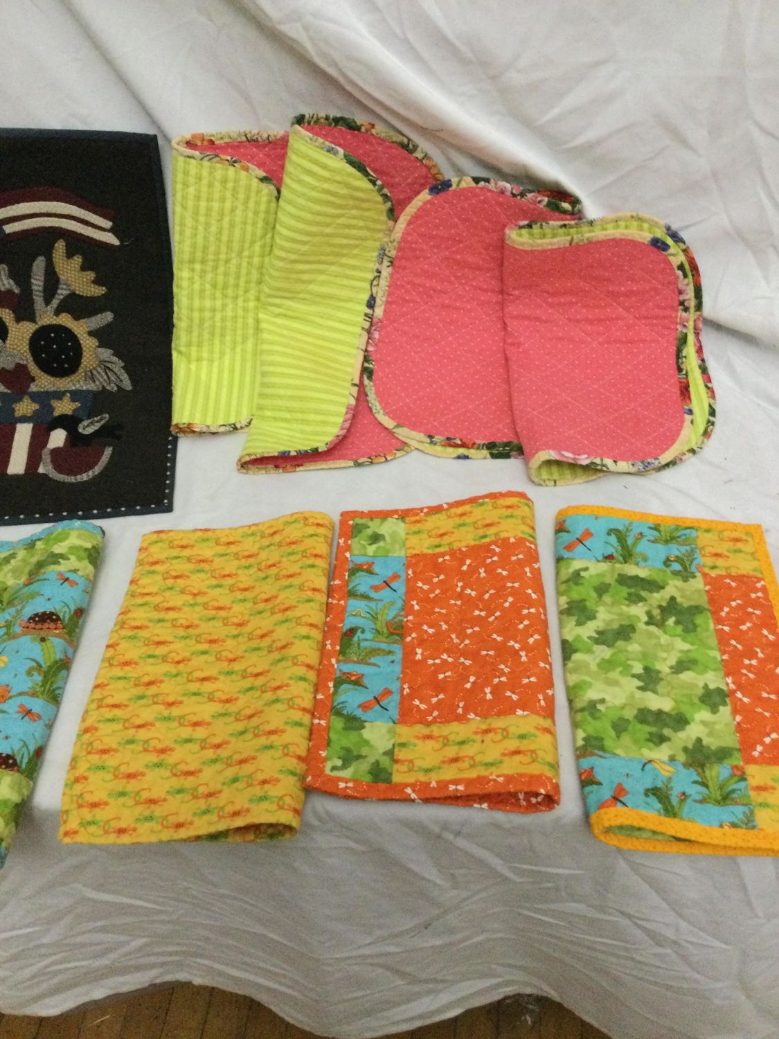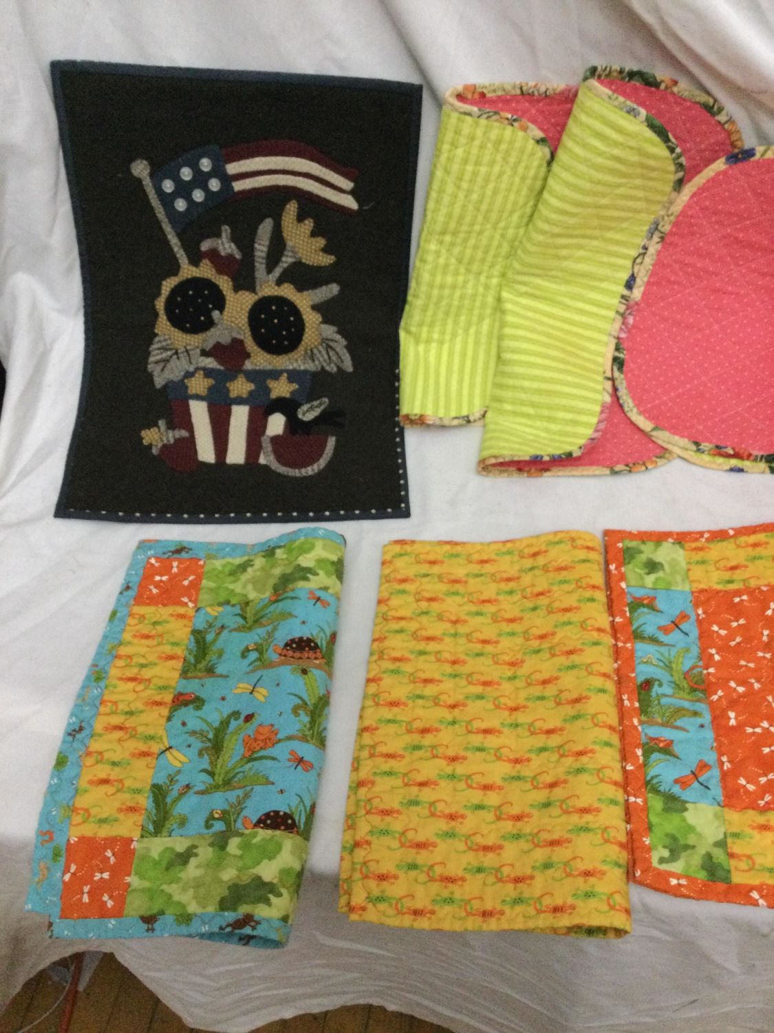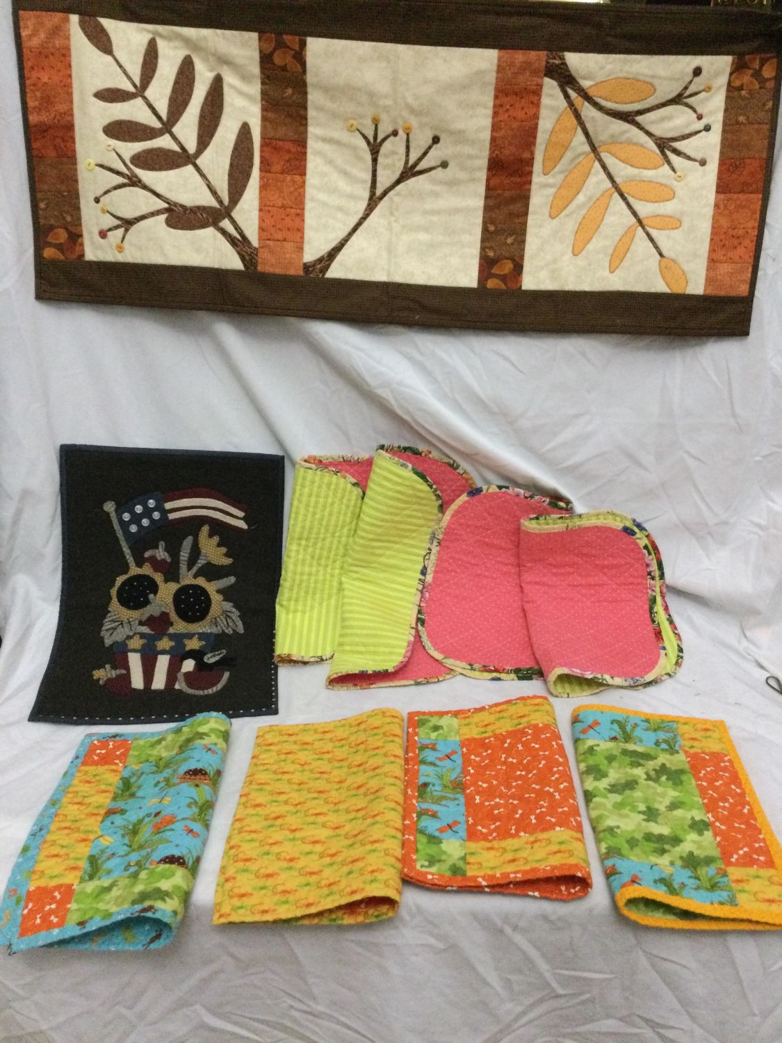 one patriotic flag wall hanging ,and one tree branch runner.Placemats measure 16 x 13 and are all reversible wall hanging measures 18 x 13 and runner measures 39 x 16