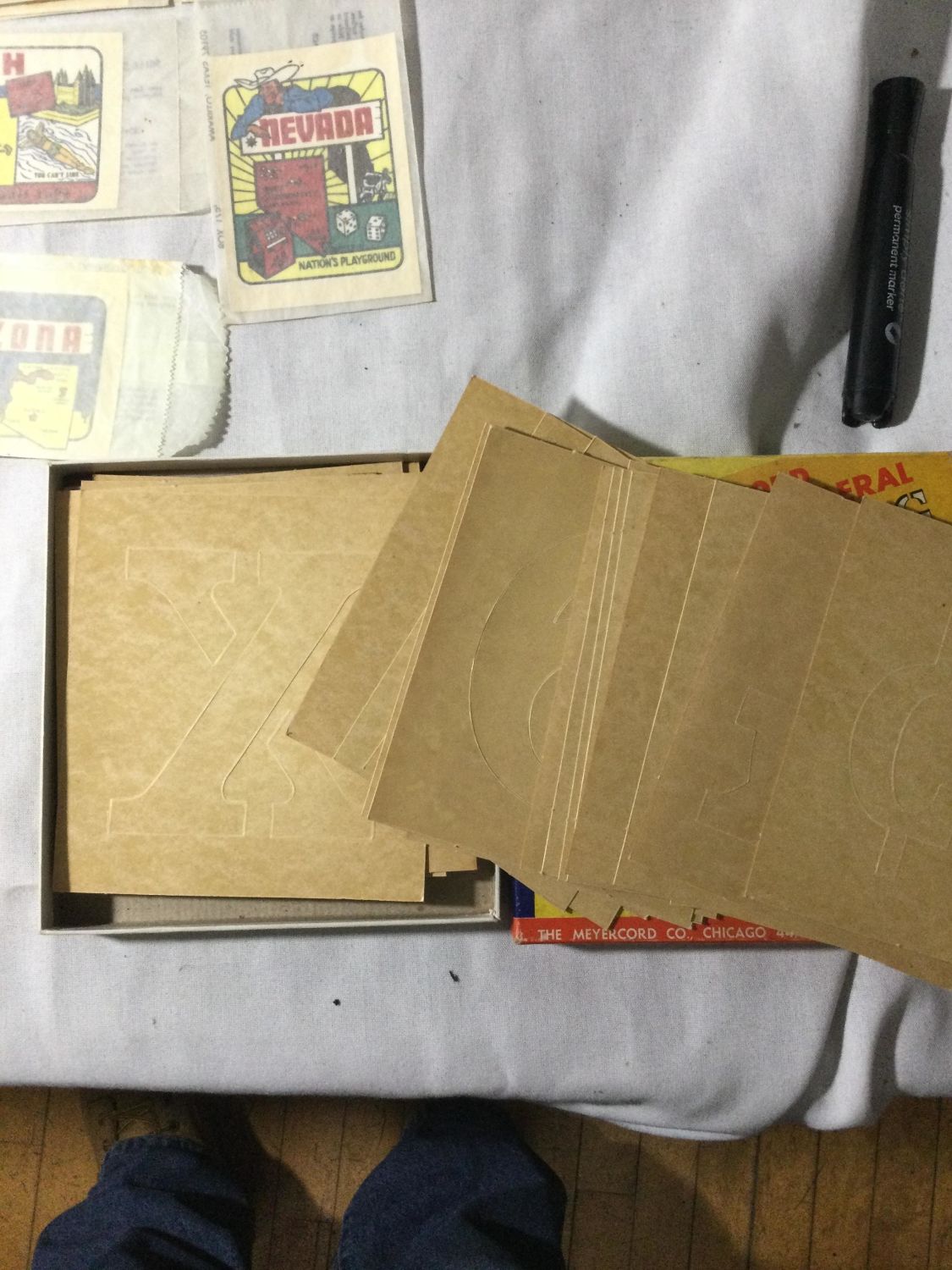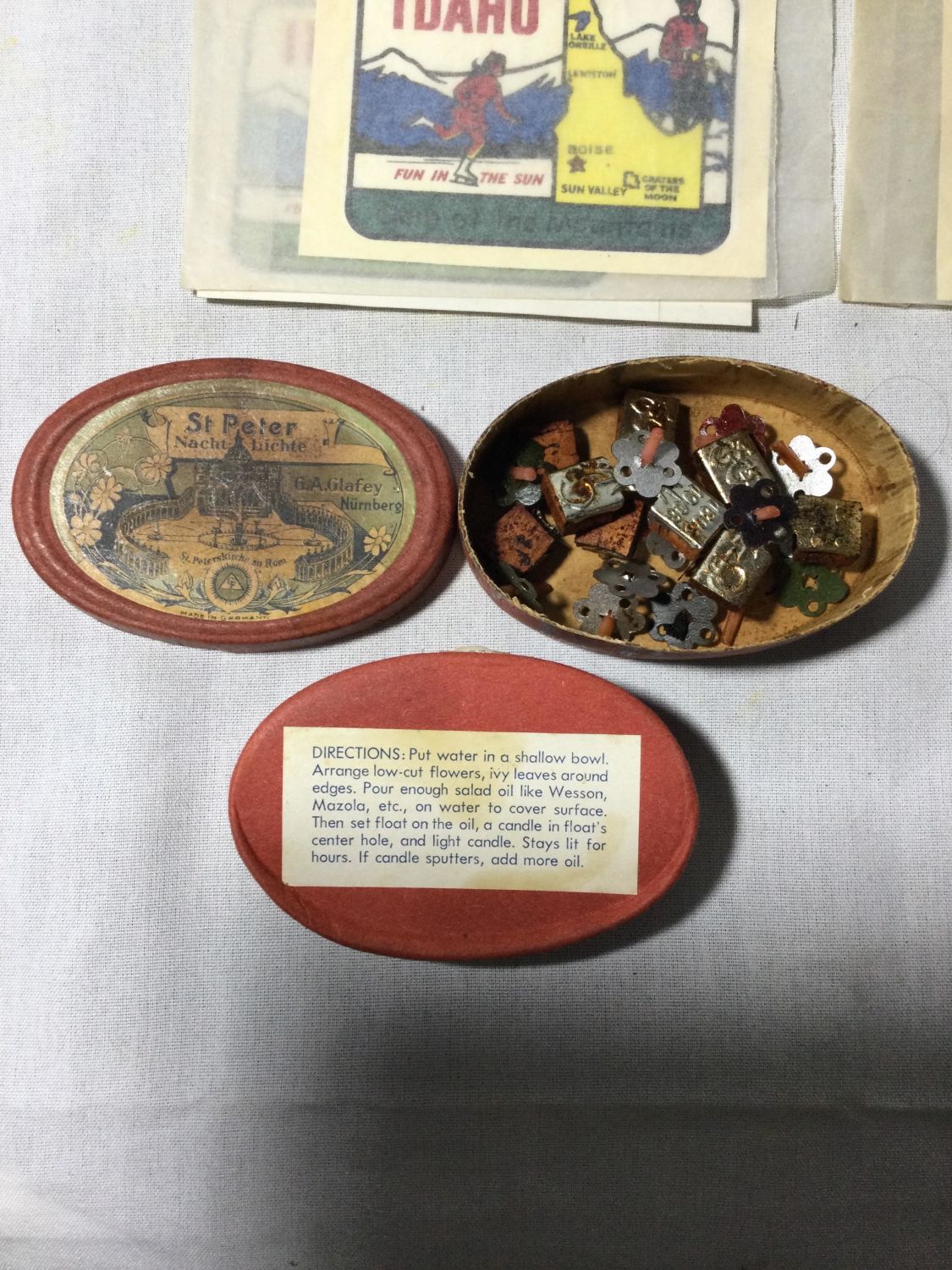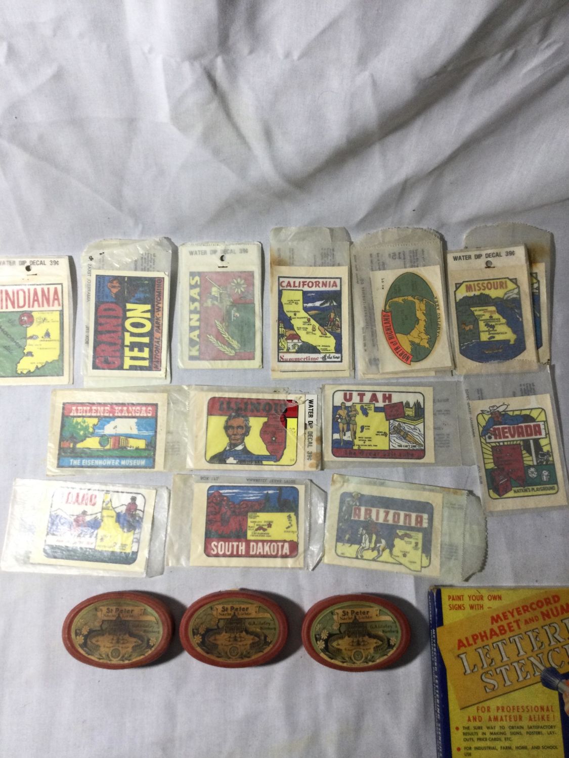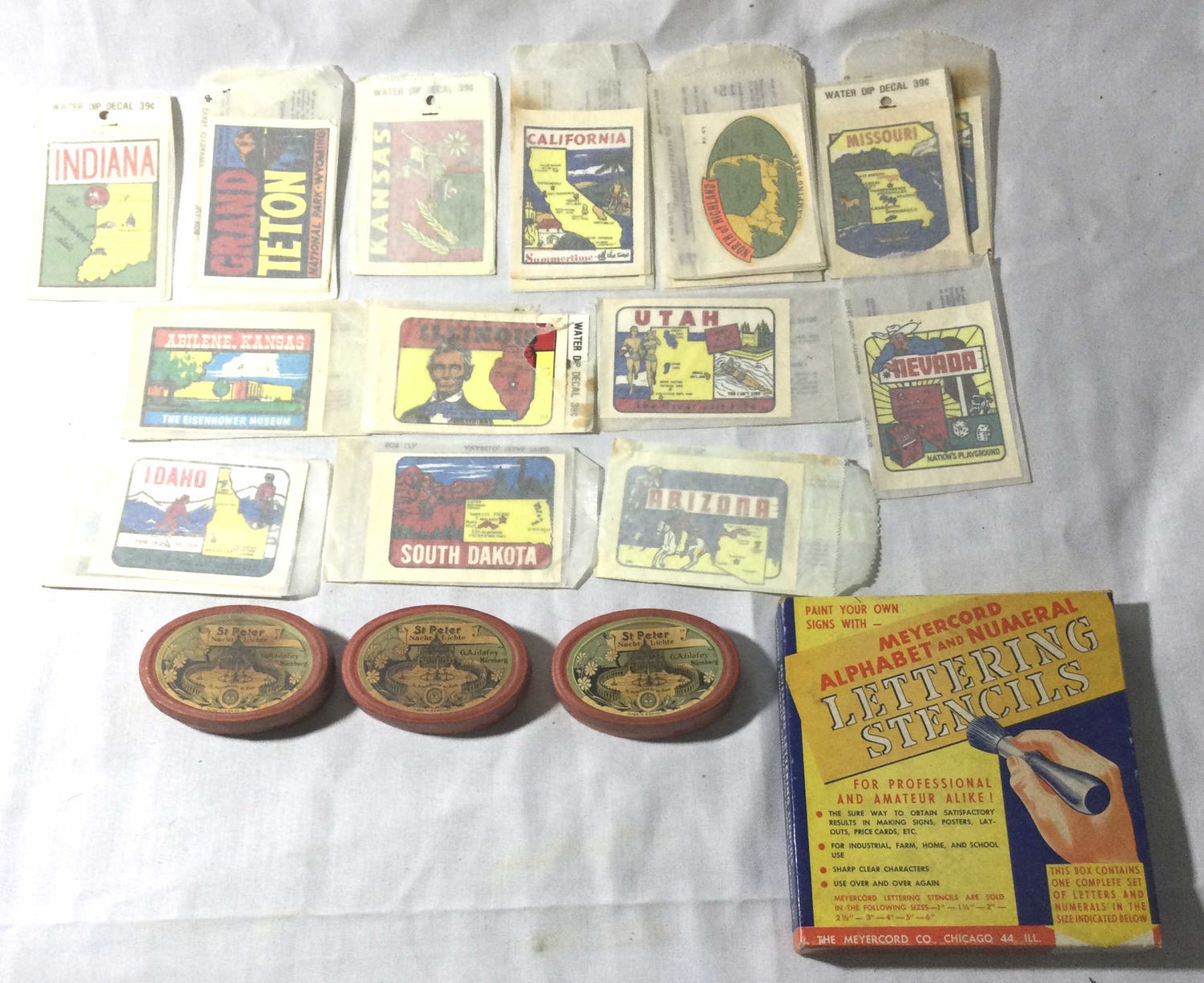 vintage packages of floating candles,And alphabet and numerical lettering stencil kit
