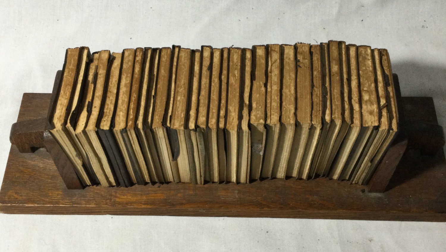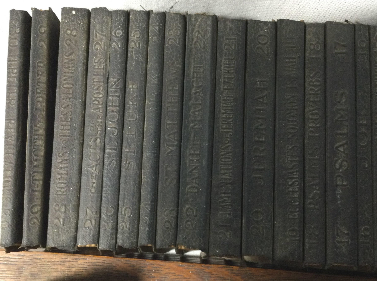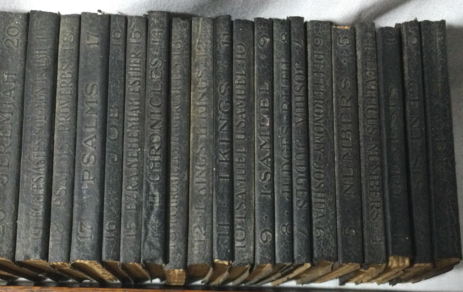 of the Old Testament 30 ,very old leather covered bibles in a wooden rack .books measure 4” x 3” very old Total measurement is 16 x 5 x 5” high