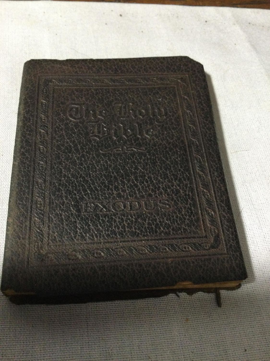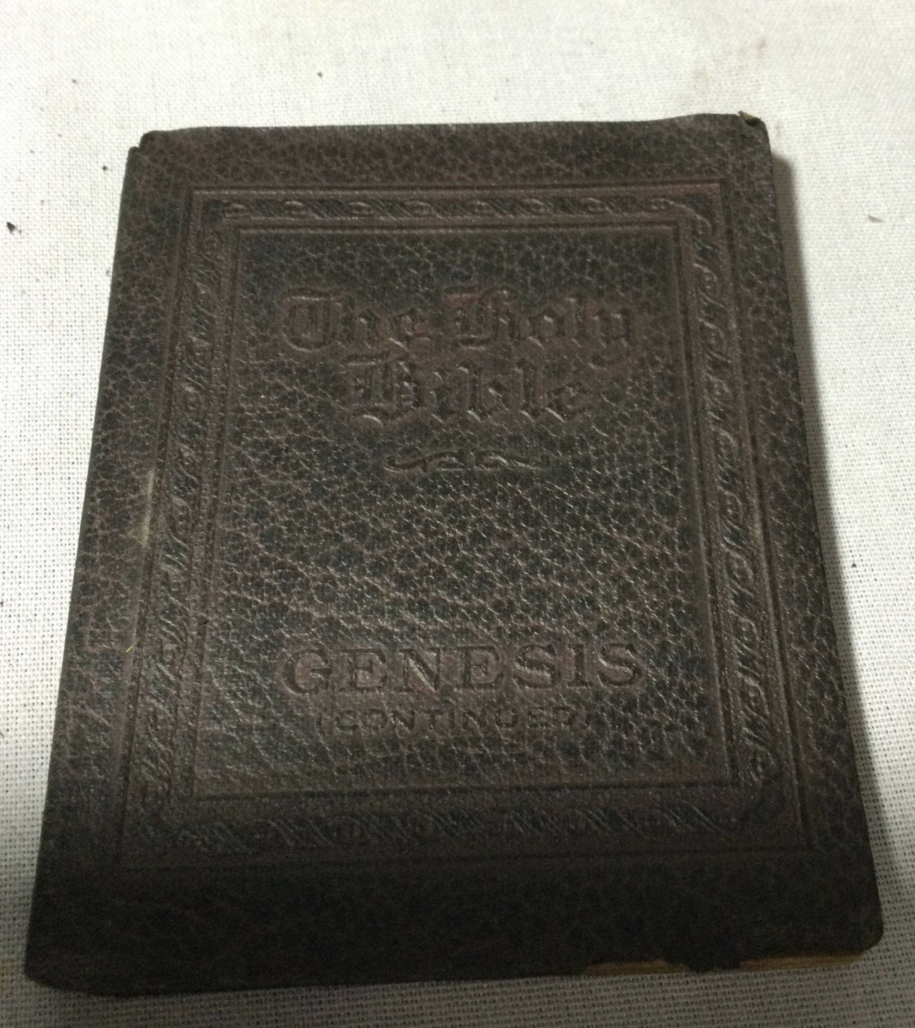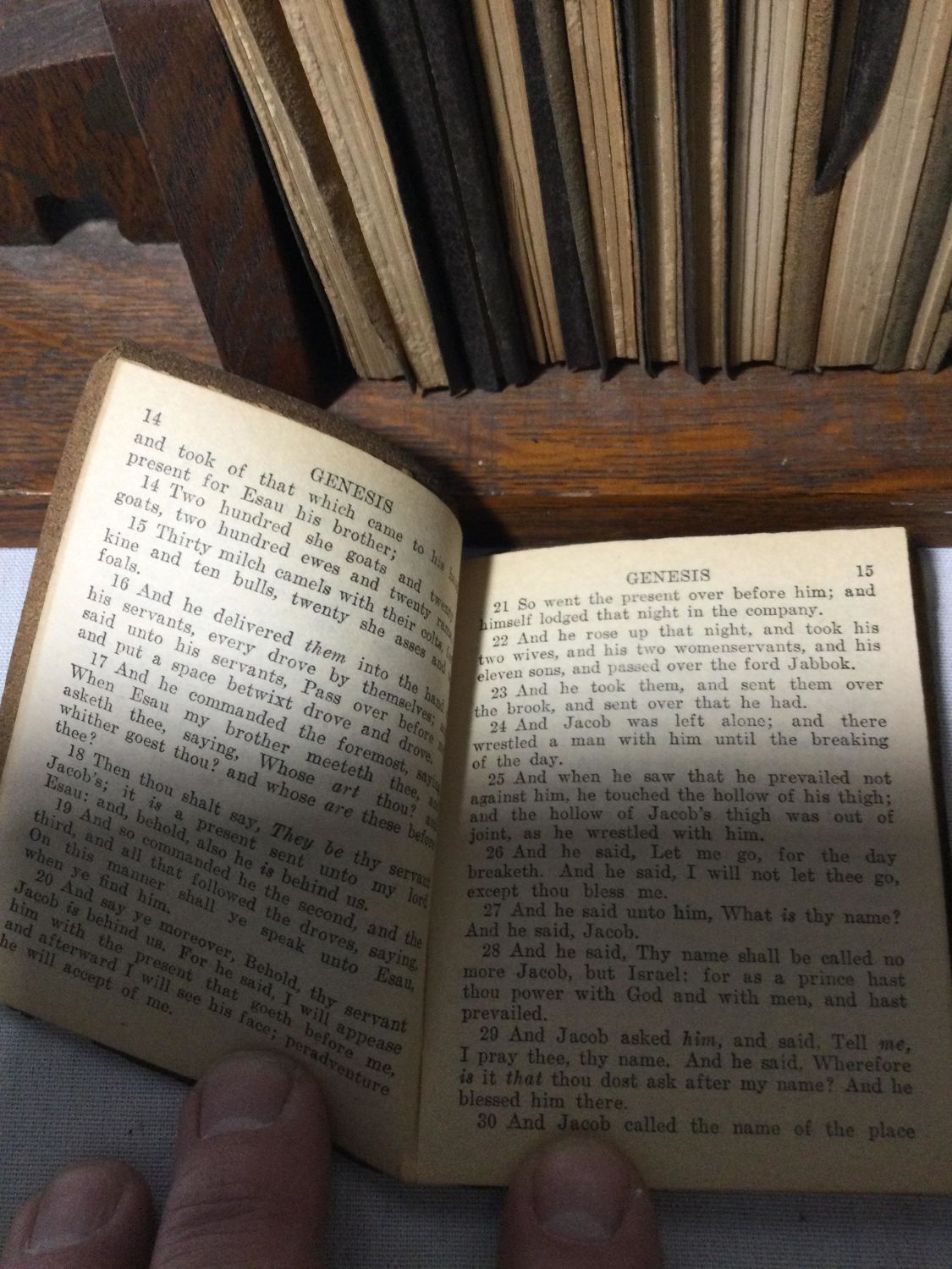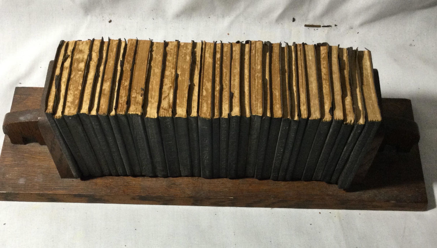 of the Old Testament 30 ,very old leather covered bibles in a wooden rack .books measure 4” x 3” very old Total measurement is 16 x 5 x 5” high