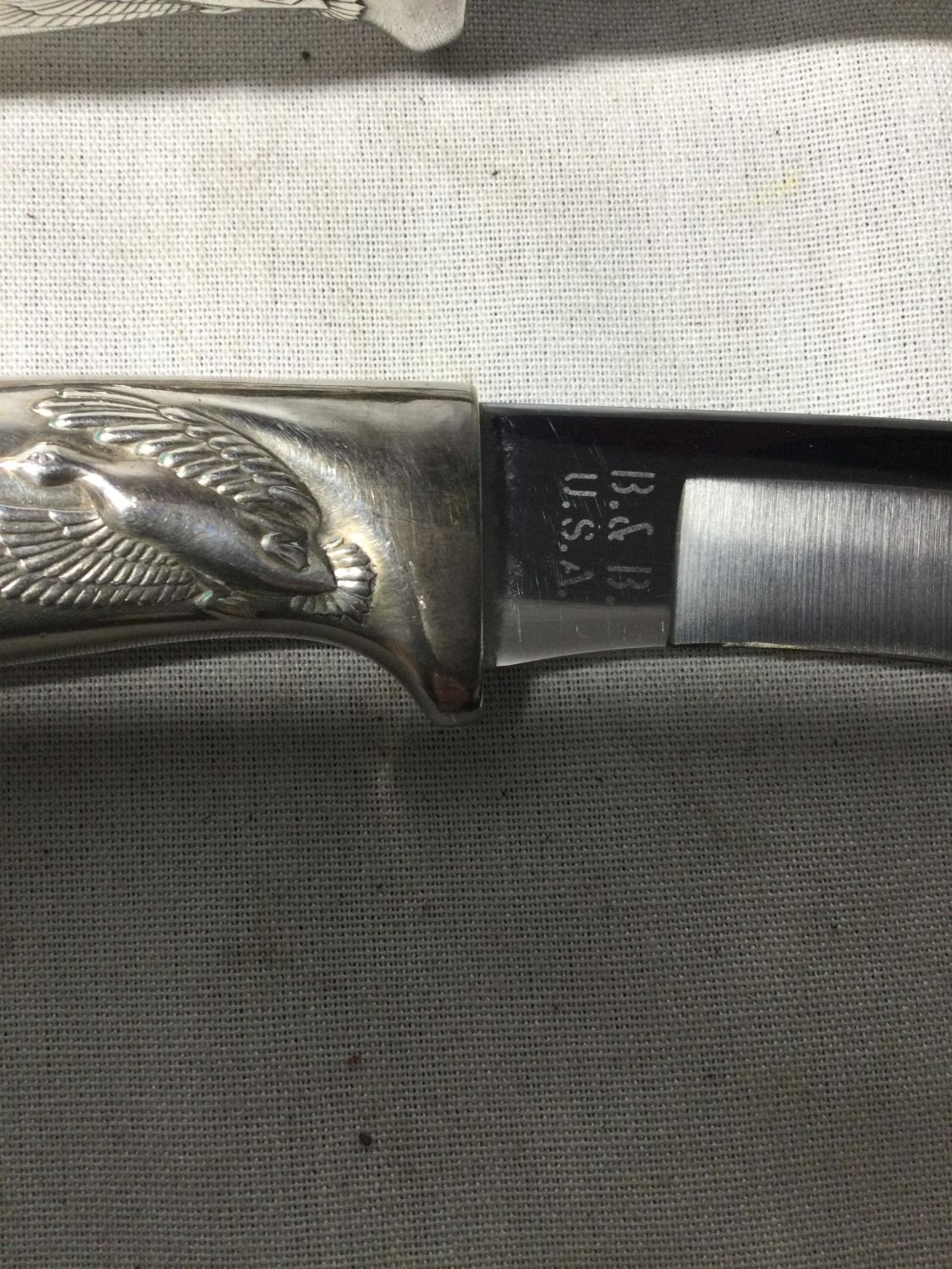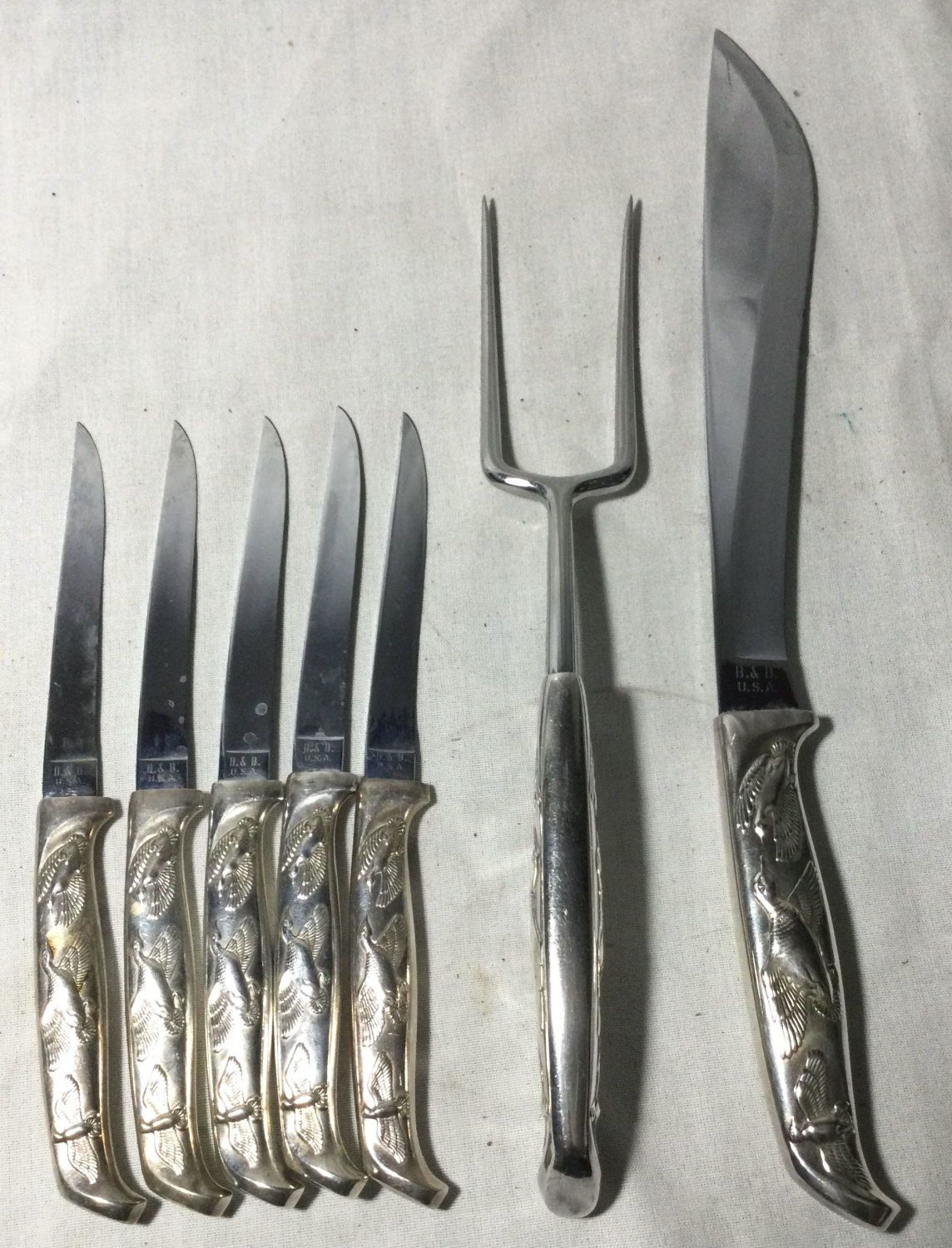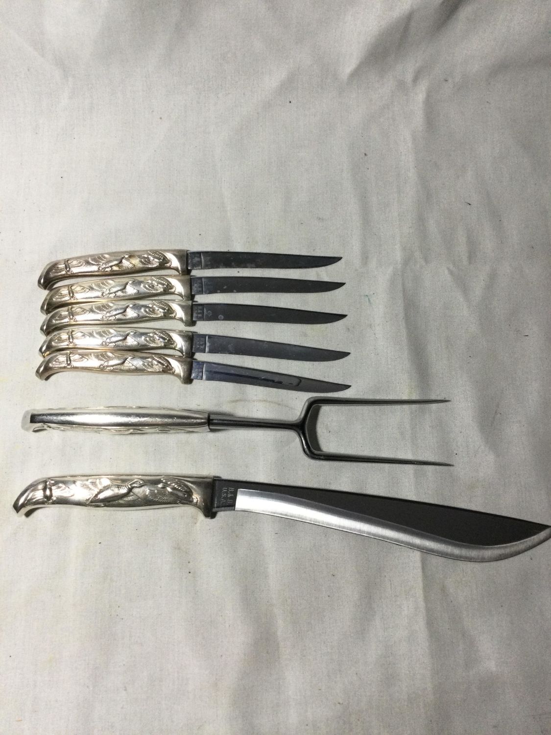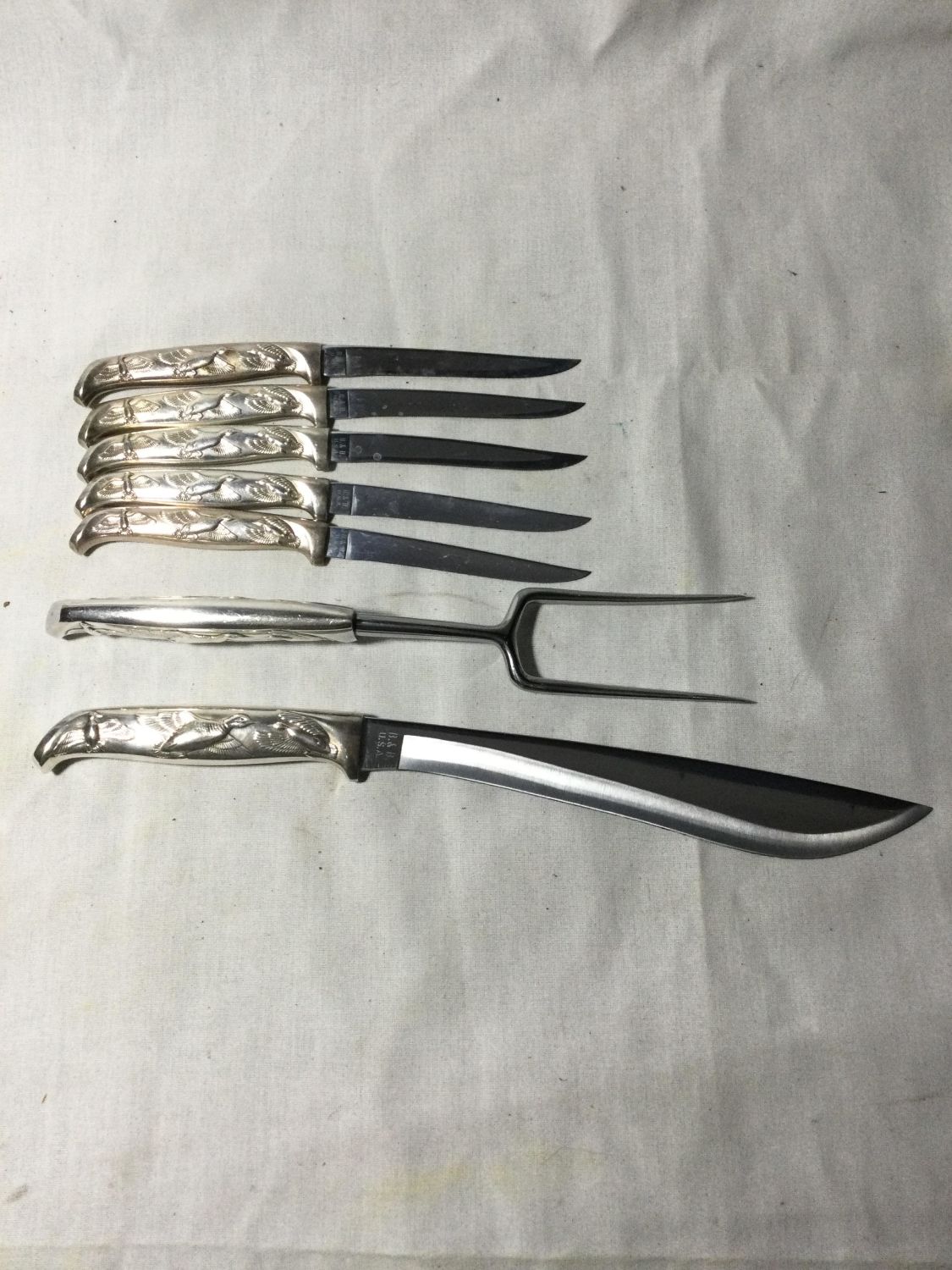 knives with serving fork and carving knife All have flying ducks On Pewter Handles Carving knife measures 14 inches handle to Tip