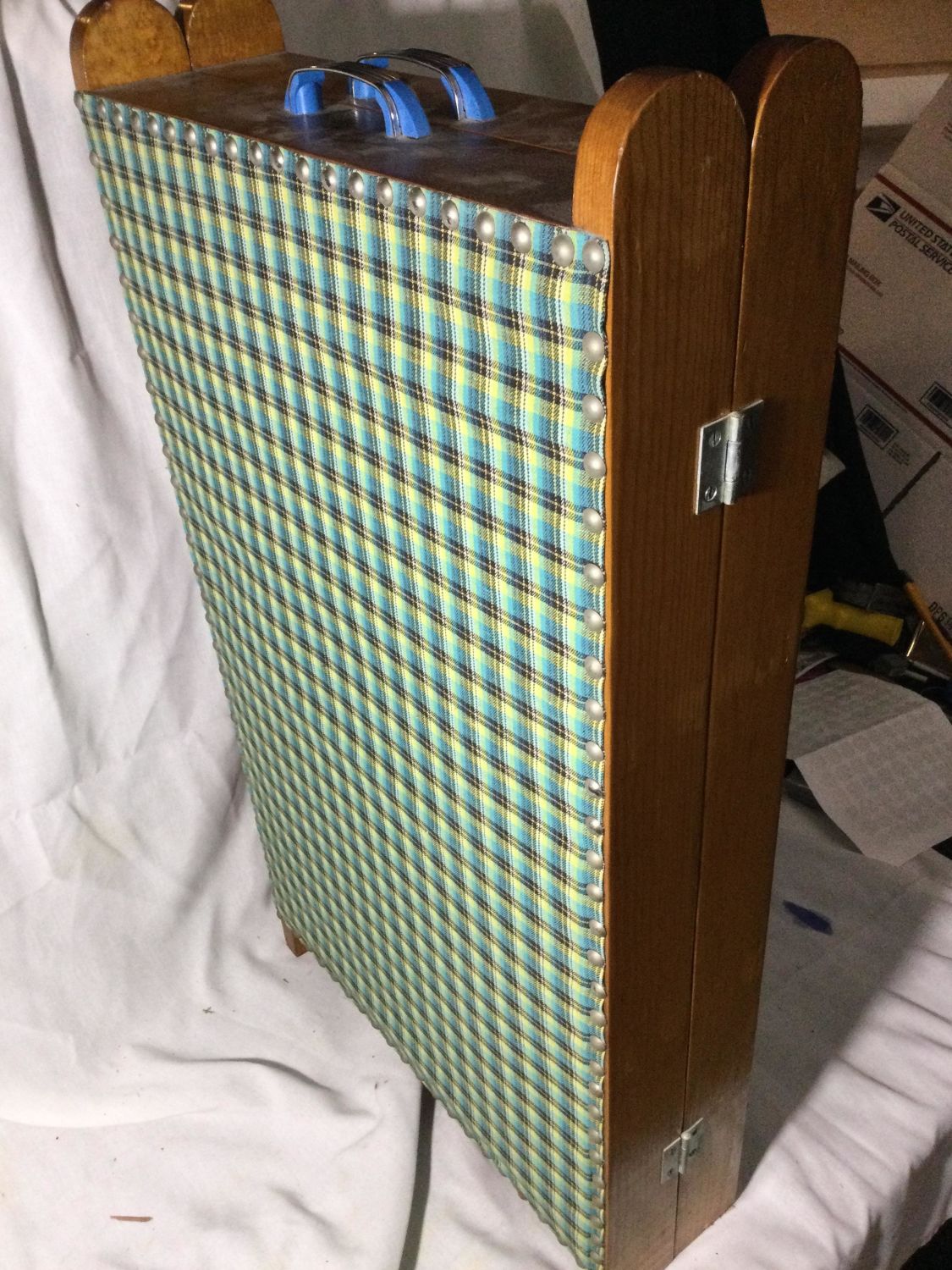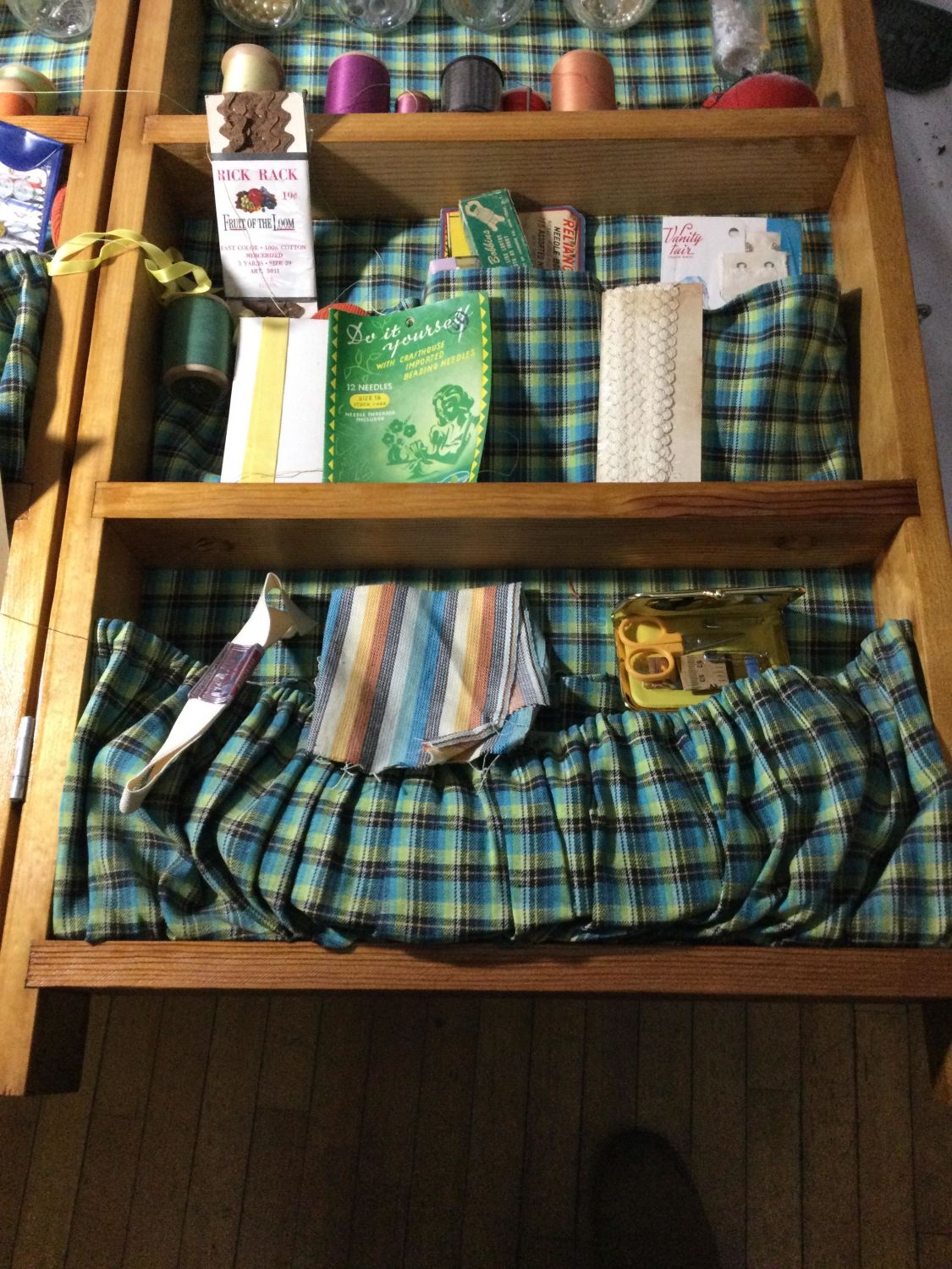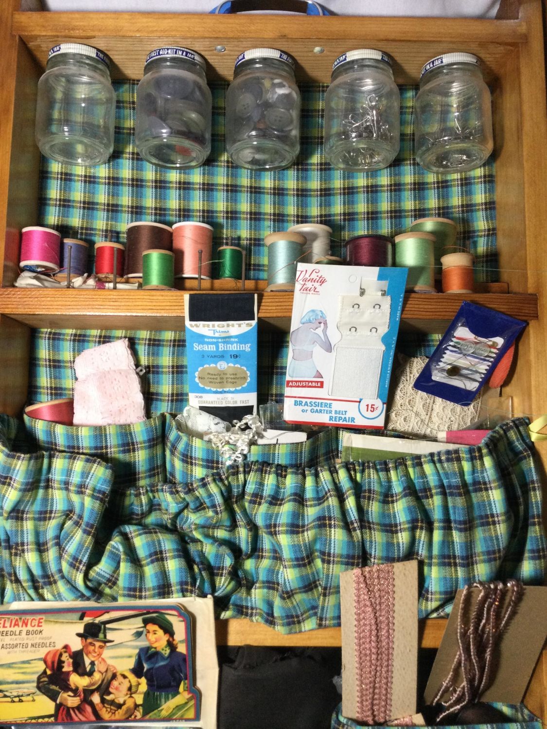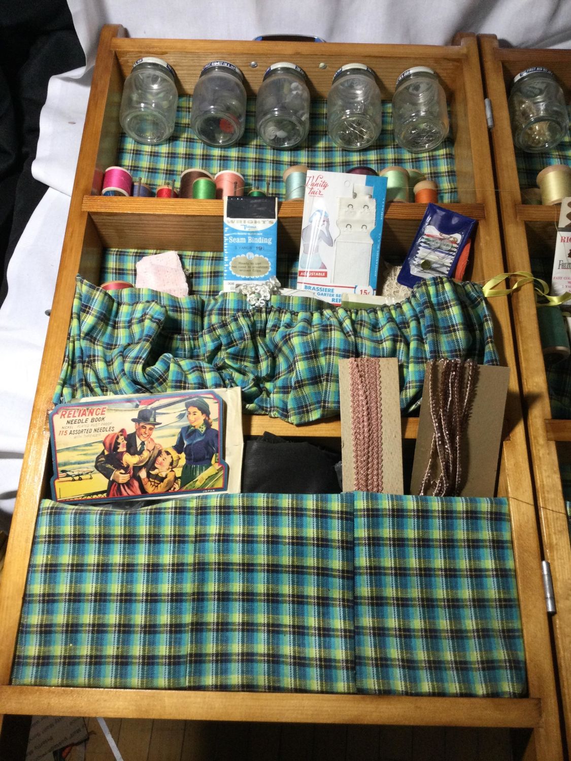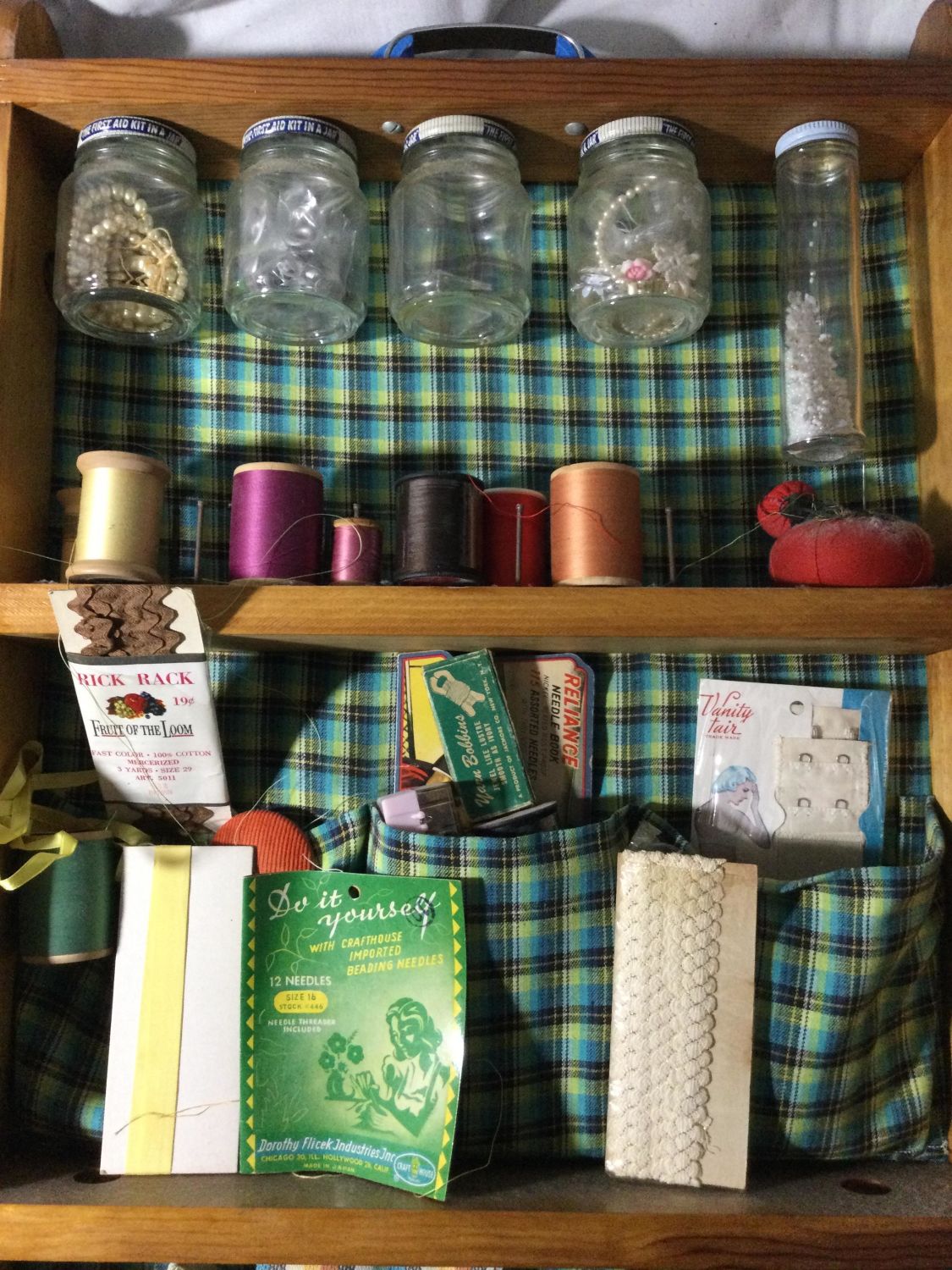 Measures 28 x 5 x 17 inches, opens wide contains everything from thread, Needles buttons elastic and a lot of other things thanks,